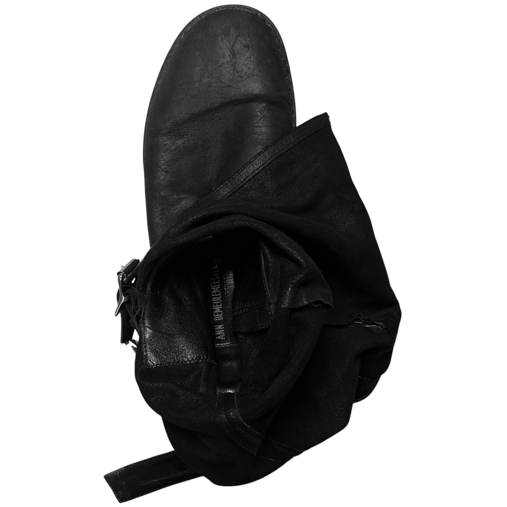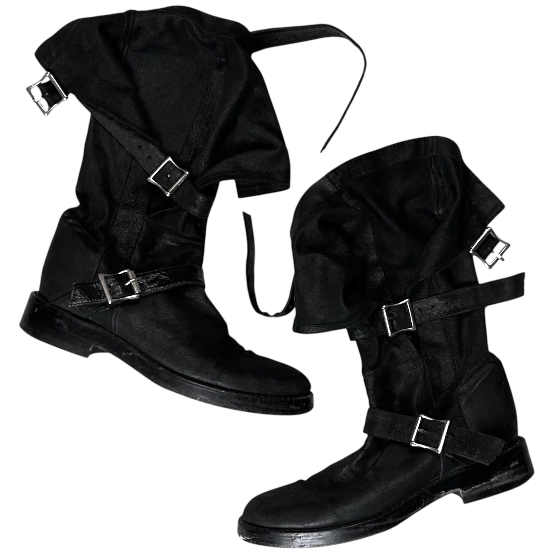 Tall boots from the Ann Demeulemeester Spring Summer 2003 ready to wear collection. Three belt straps with silver buckle hardware closure allowing to adjust and modify allowing to collapse the shaft and let it hang down. Rounded toe box with a heeled rubber sole. Made from a black blistered suede leather.