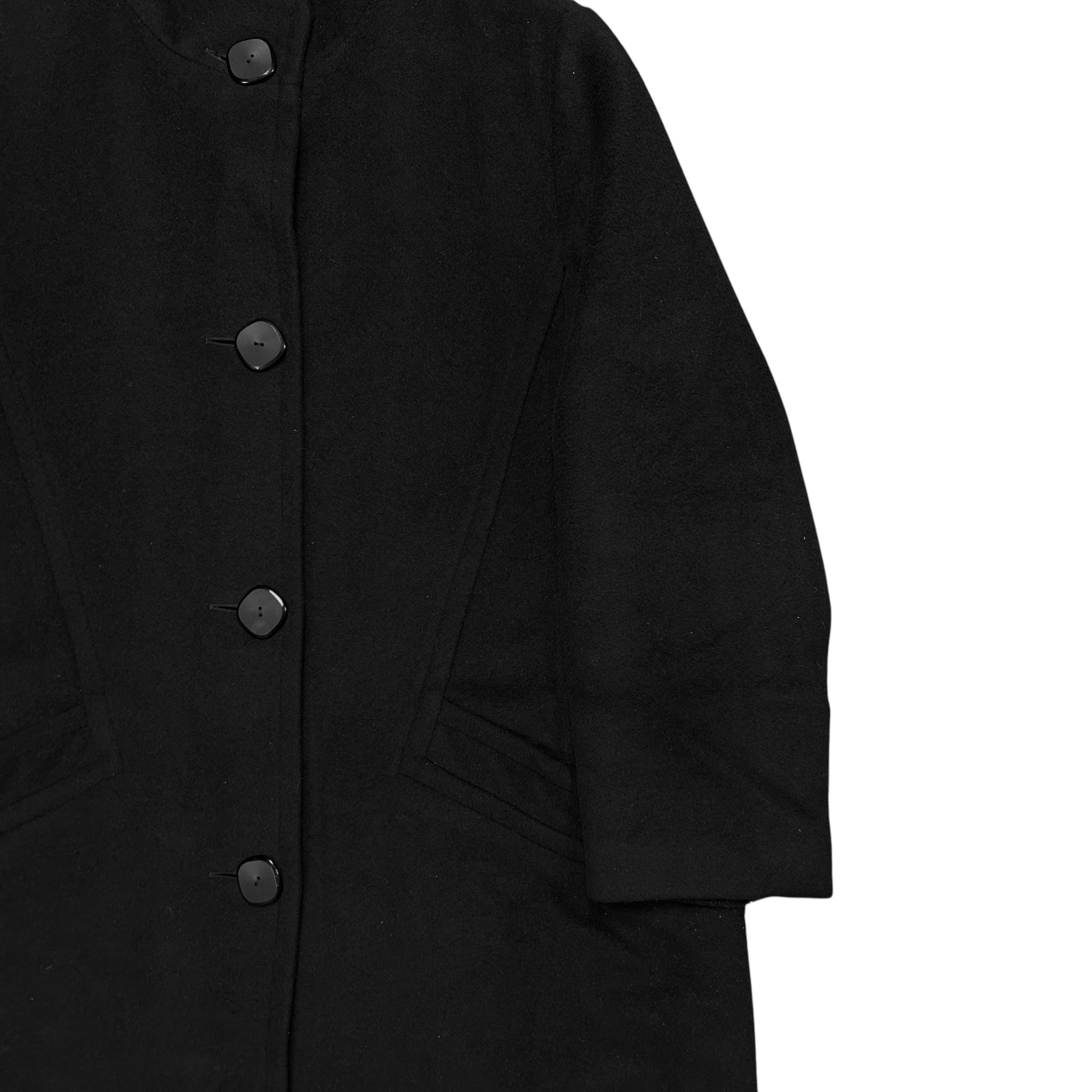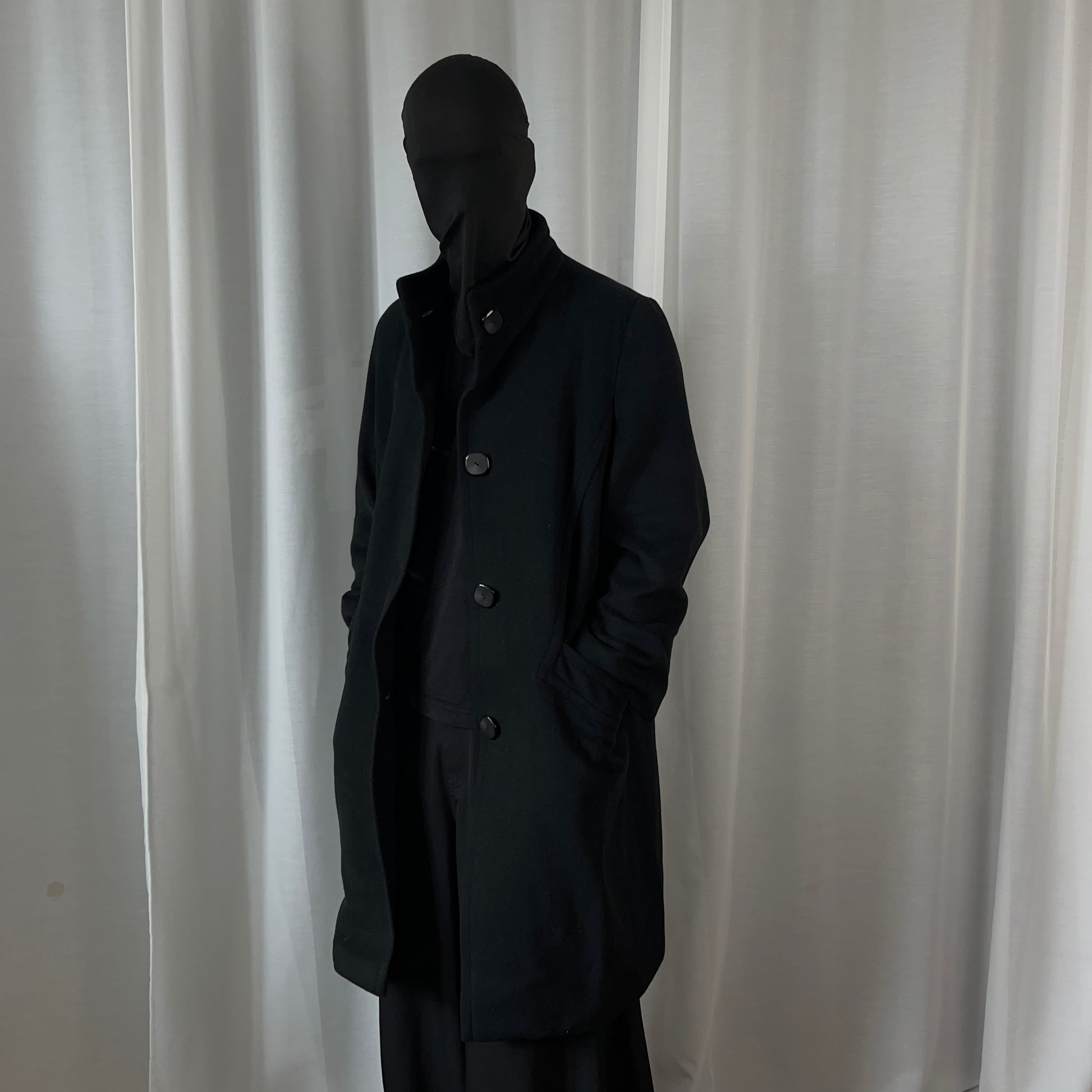 Vintage Balenciaga Coat from les Uniforms de Balenciaga line from the 90s. Interestingly shaped tonal exaggerated button closure with a high neck collar. Unique paneling with visible lines around the diagonal slid pockets. Madde from a soft and thick wool material in black. Oversized cut.