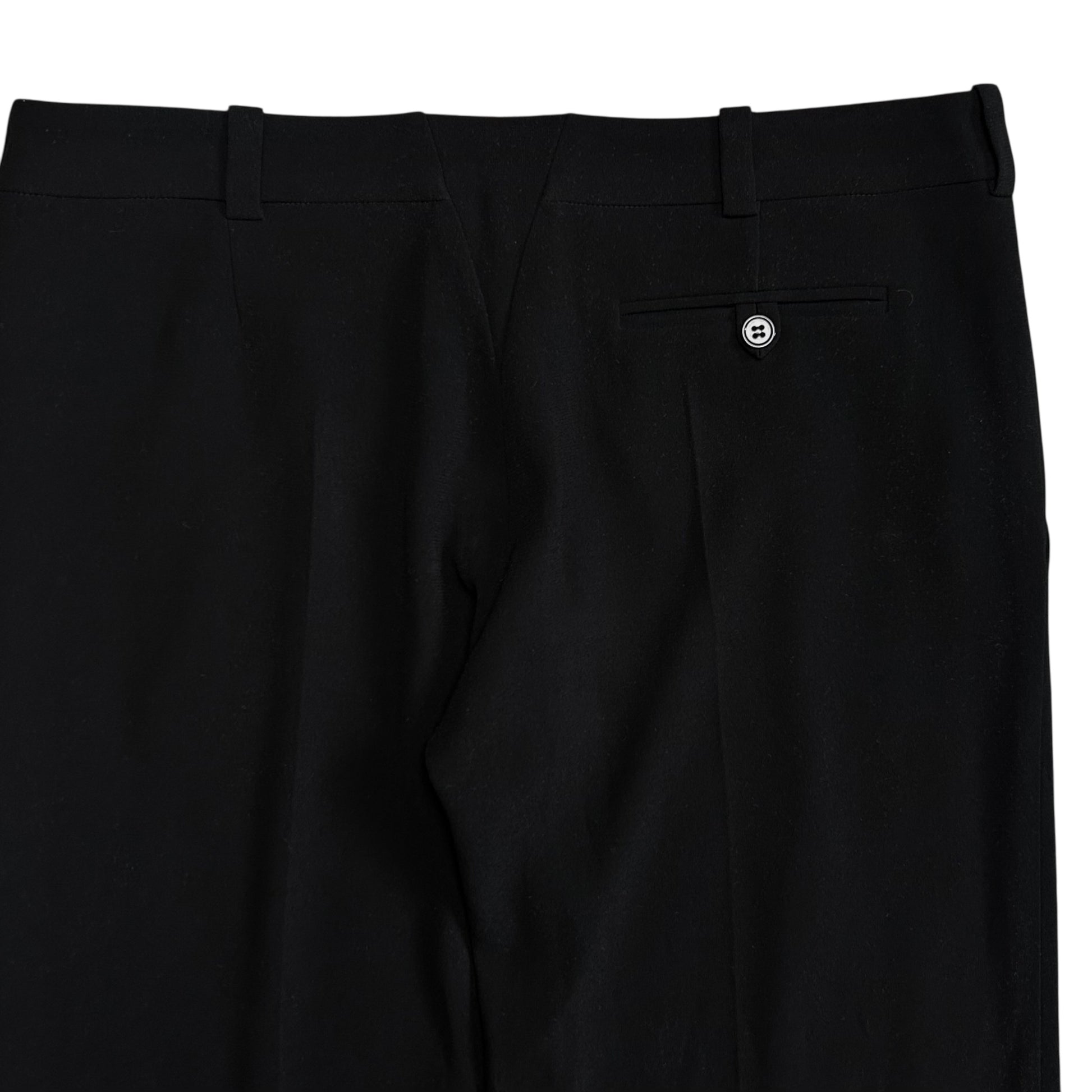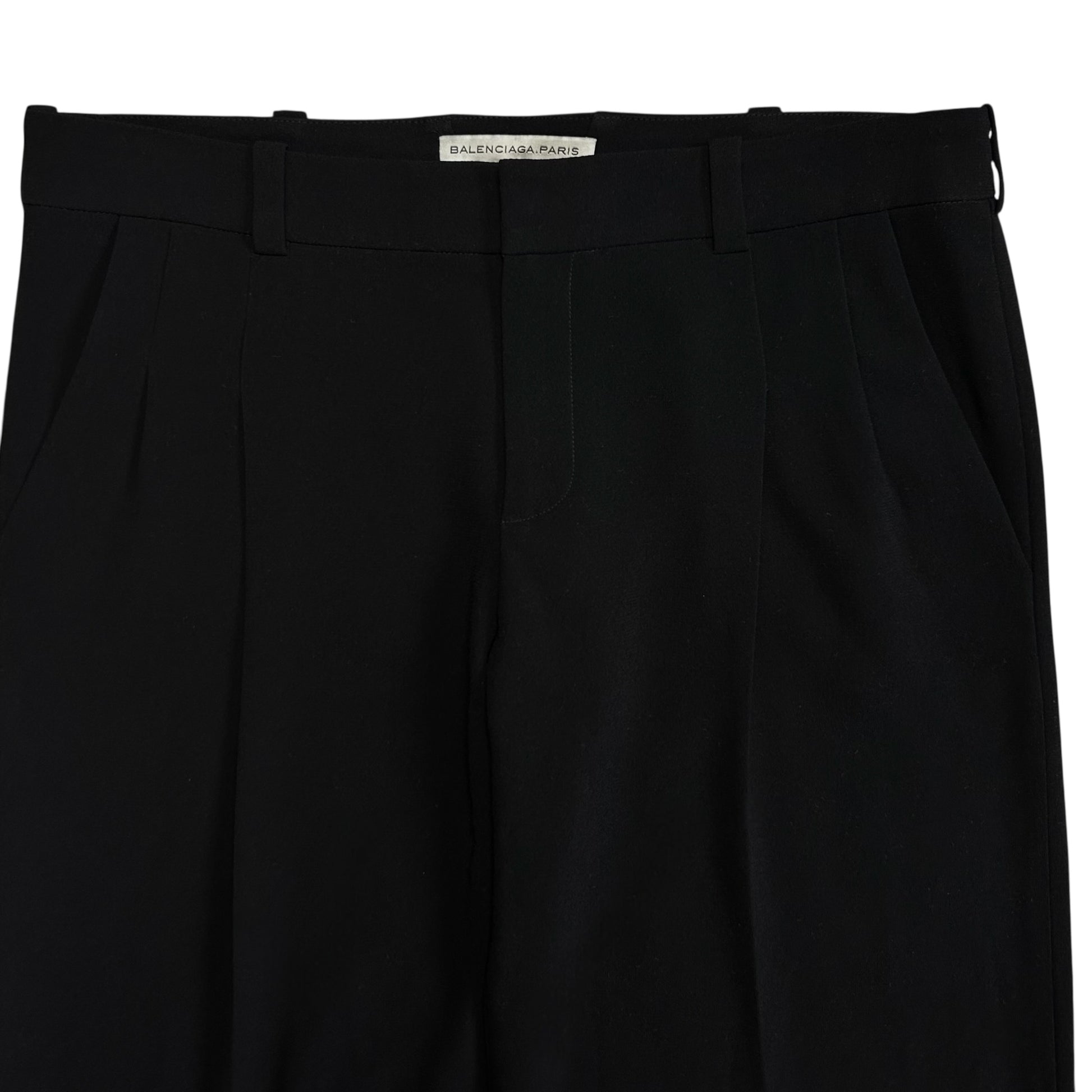 Suit pants from the Balenciaga Paris Spring Summer 2006 collection which was designed by Nicholas Ghesquiere. Classic construction with a silver zip fly and folded up hems and a pleated waist. Made from a lightweight triacetate blend in deep black. Wide and straight cut.