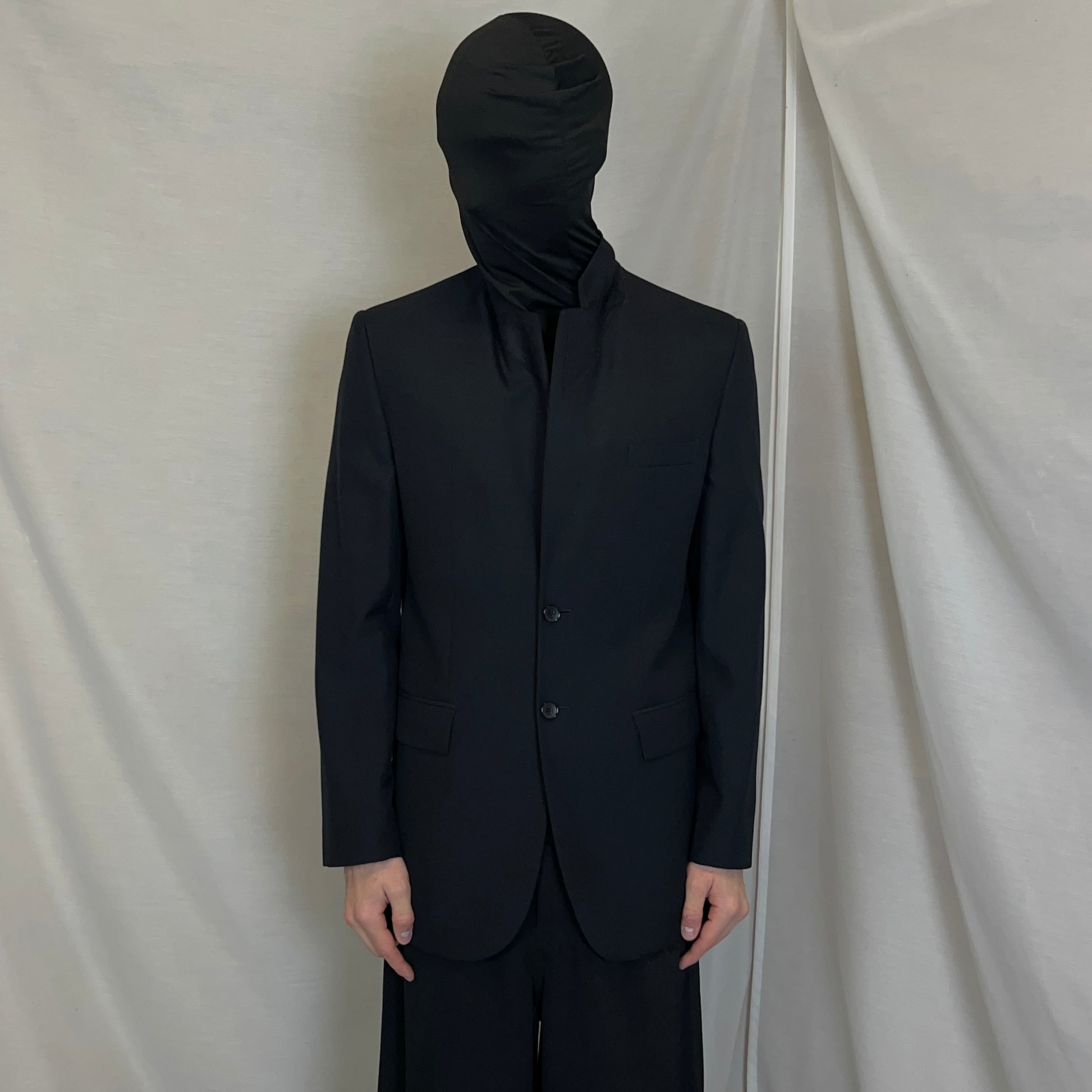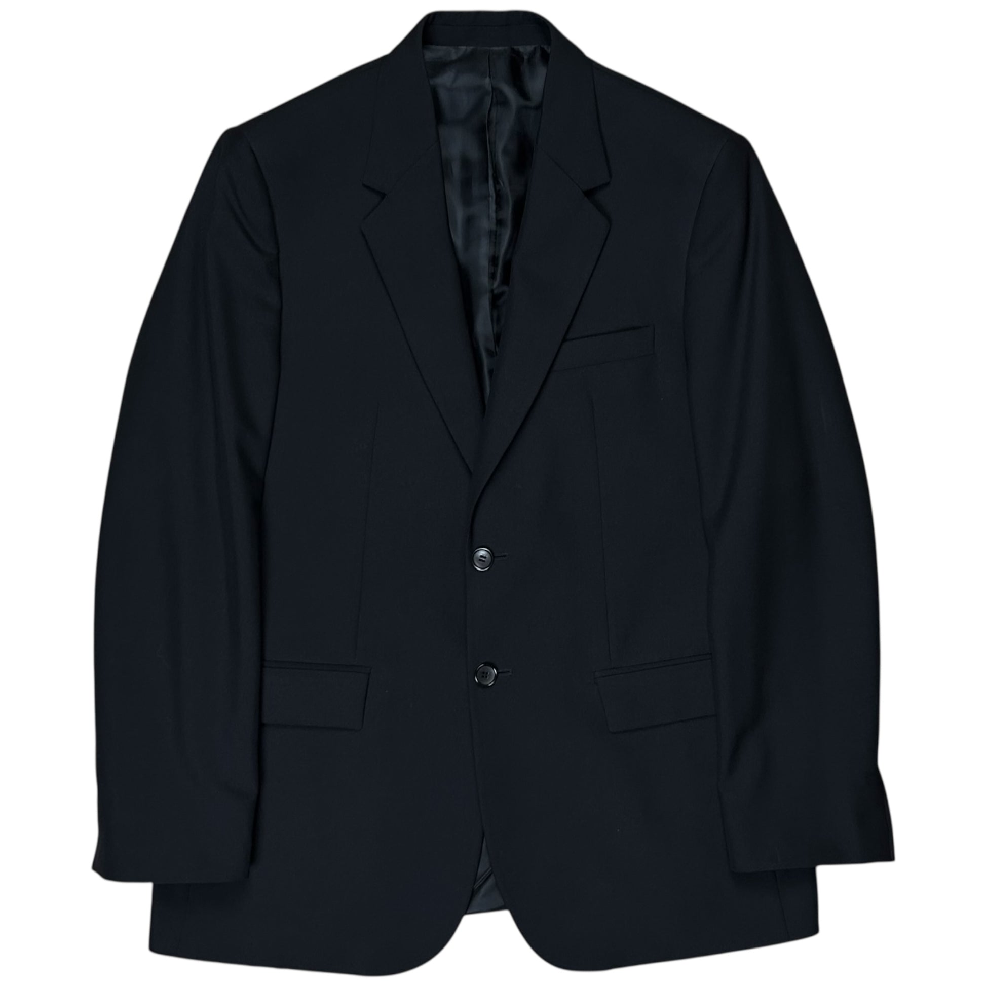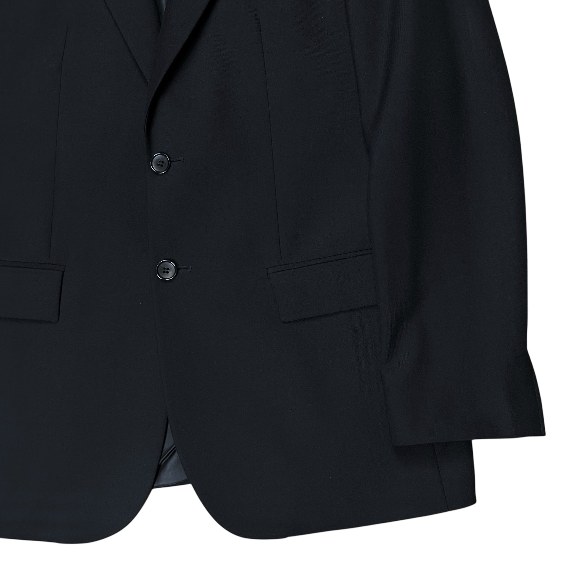 Blazer jacket from the Balenciaga Paris Spring Summer 2009 collection which was designed by Nicolas Ghesquiere. Minimalistic construction with the classic pockets a two tonal button closure and notched lapel collar. Padding at the whole shoulder part. Slim cut with pronounced shoulders. Made from a smooth black wool and nylon blend.