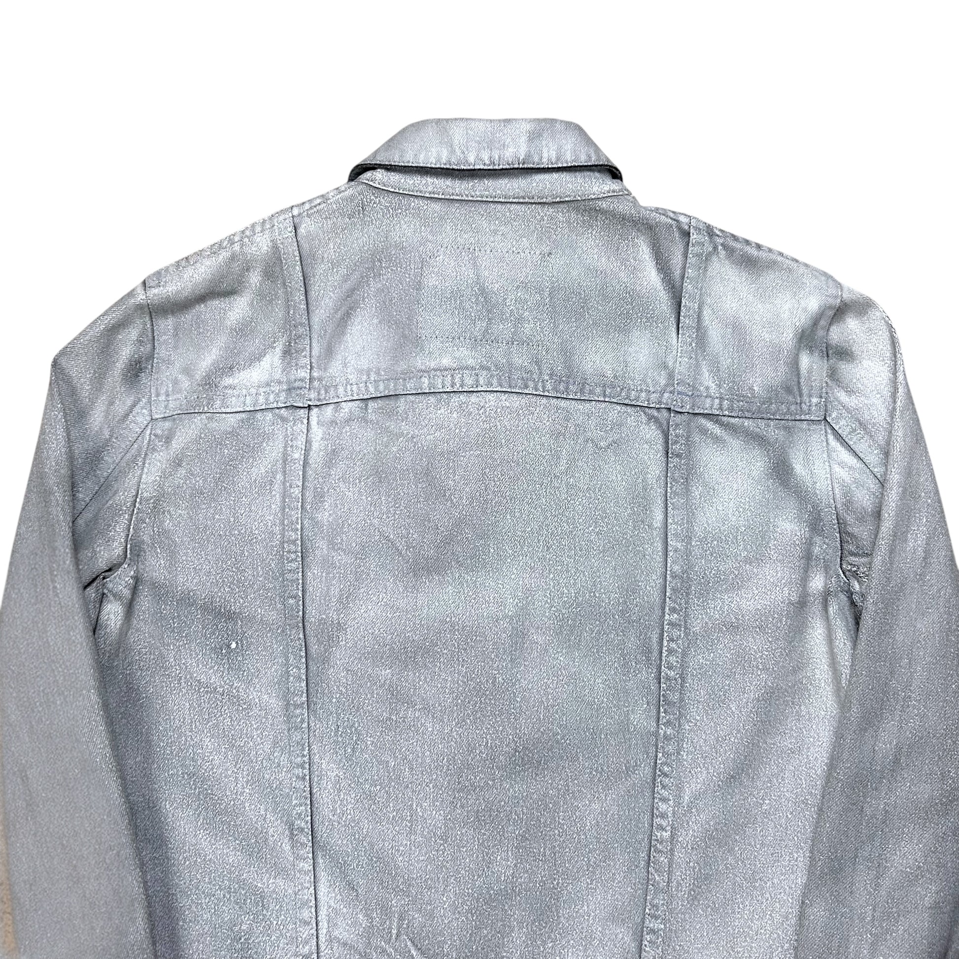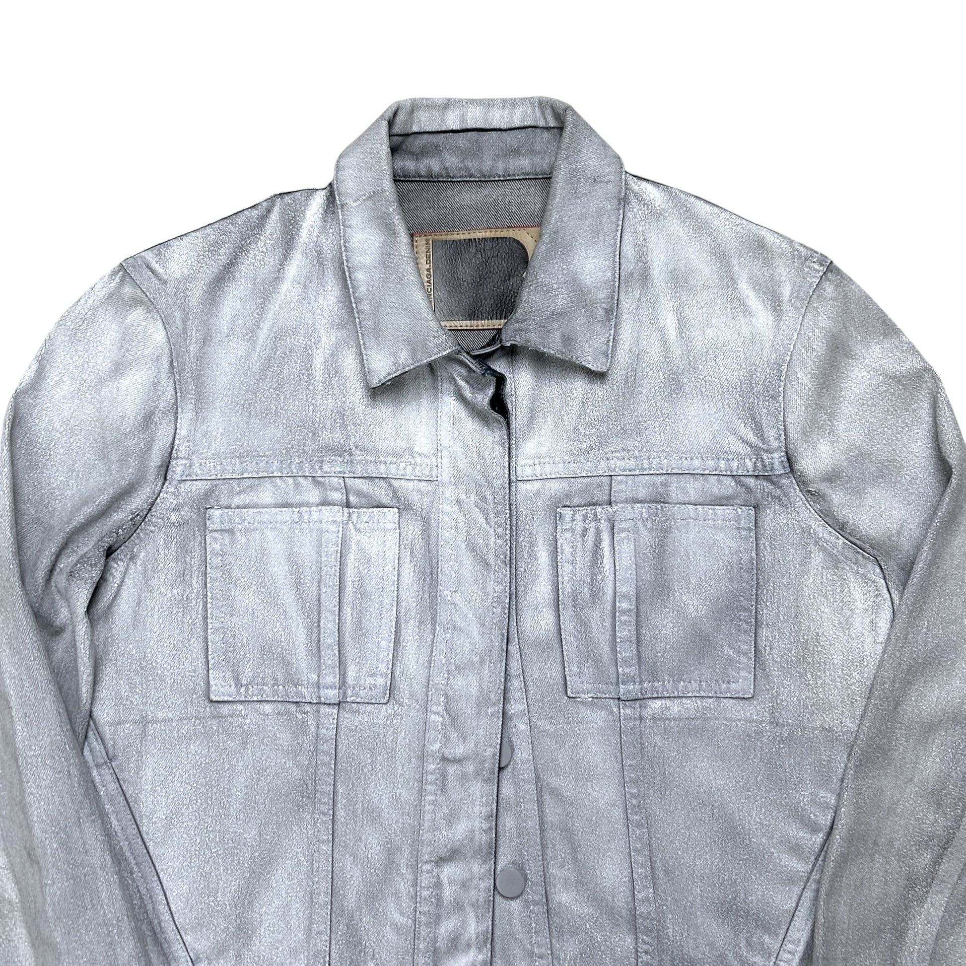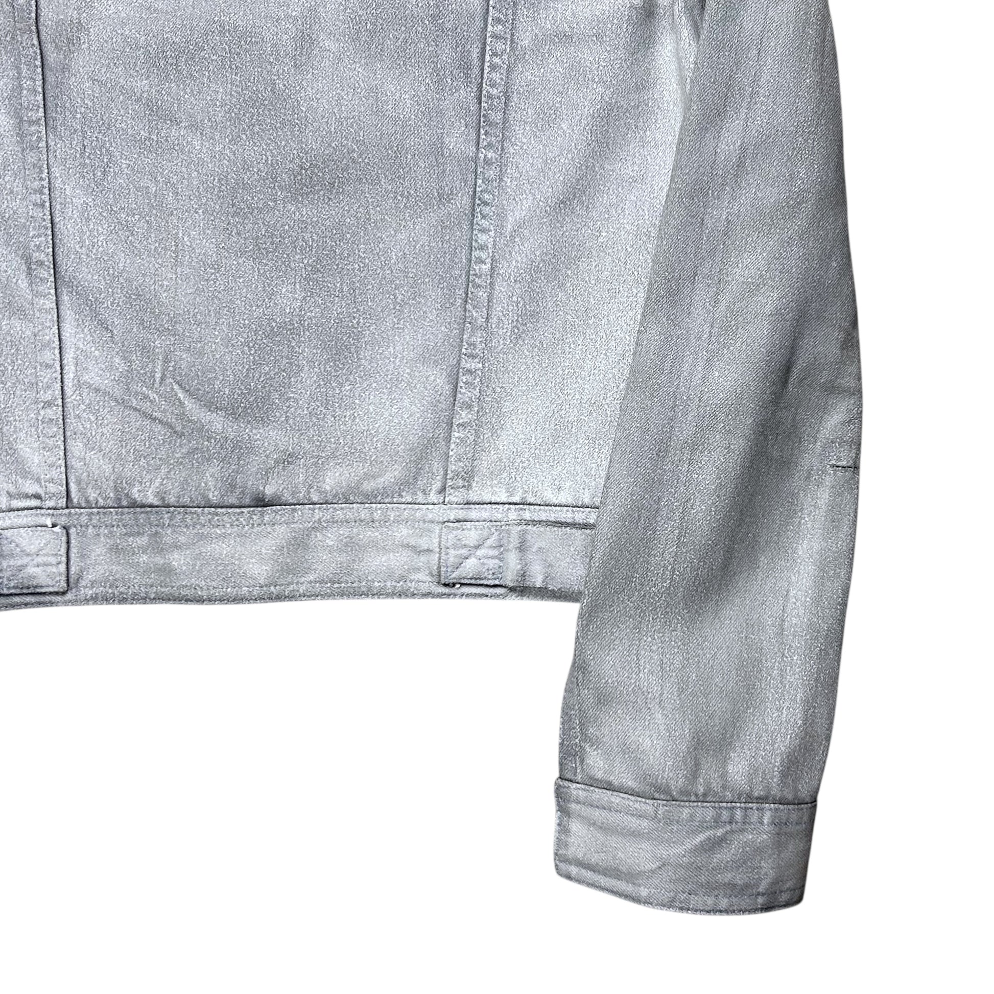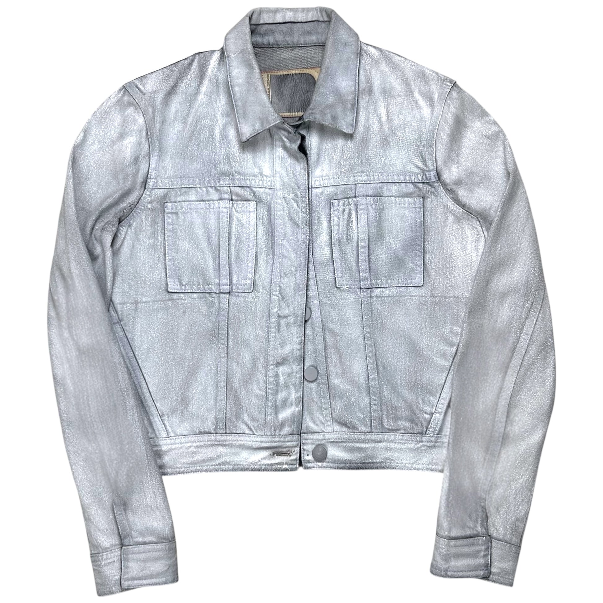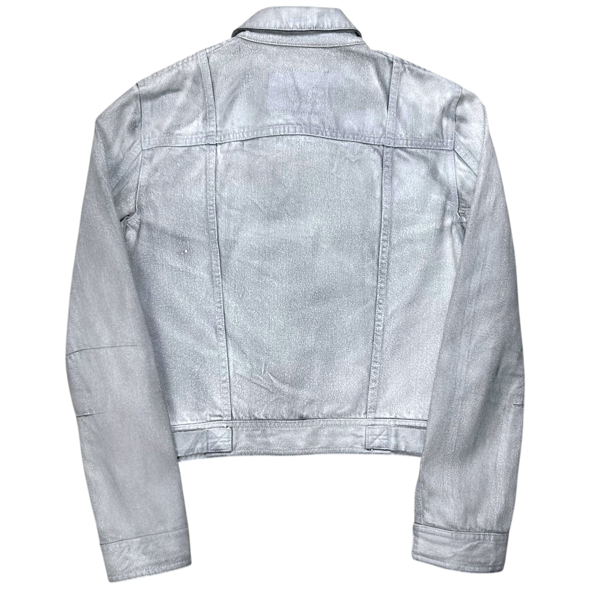 Denim jacket from the Balenciaga Spring Summer 2008 ready to wear collection which was designed by Nicholas Ghesquiere. Classic trucker style construction with panel chest pockets, concealed button closure and a foldable work collar. Made from a dark cotton material that has been spray painted in silver with a waxed finish. Cropped cut with elongated sleeves.