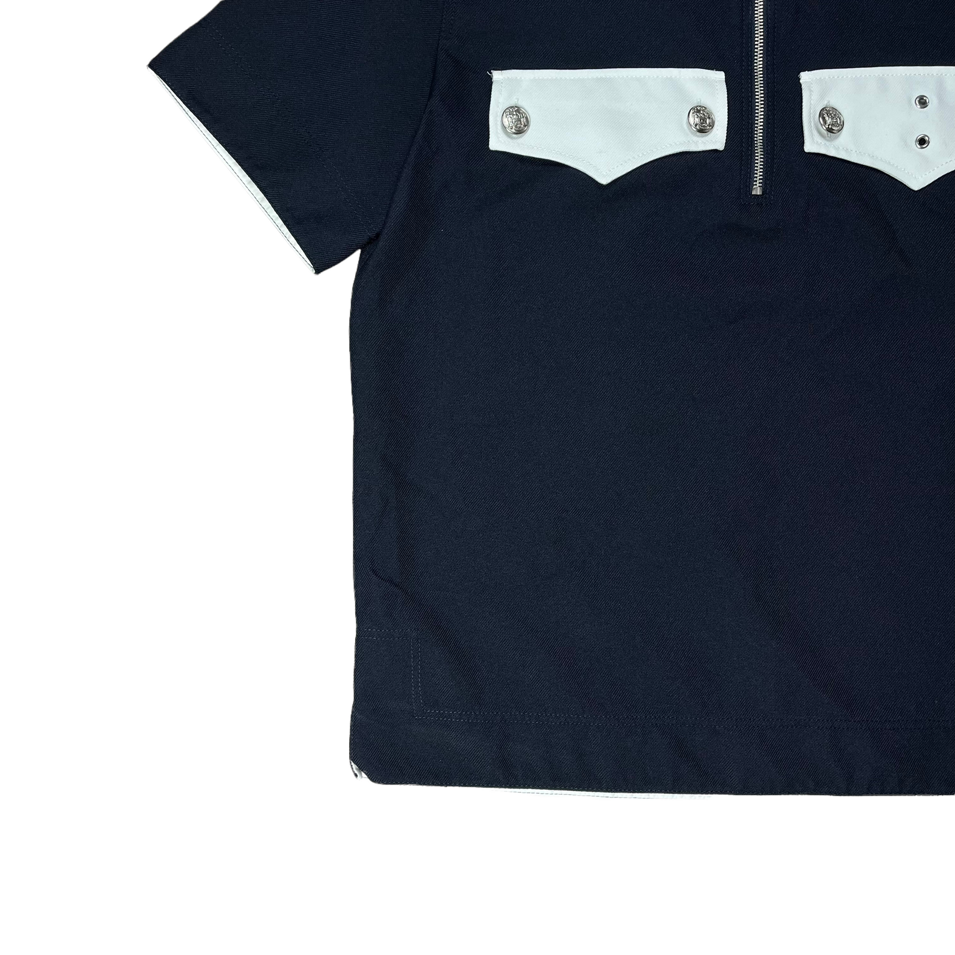 From the iconic Raf Simons & CK cooperation. Dark blue / navy police Inspired shirt with white contrast pockets. Unique silver hardware buttons with asymmetrical eyelets at the chest. Quarter zip closure at the collar. Thick and high quality polyester fabric with cotton lining. Boxy cut with slide at the size. Retailed for around 500€.