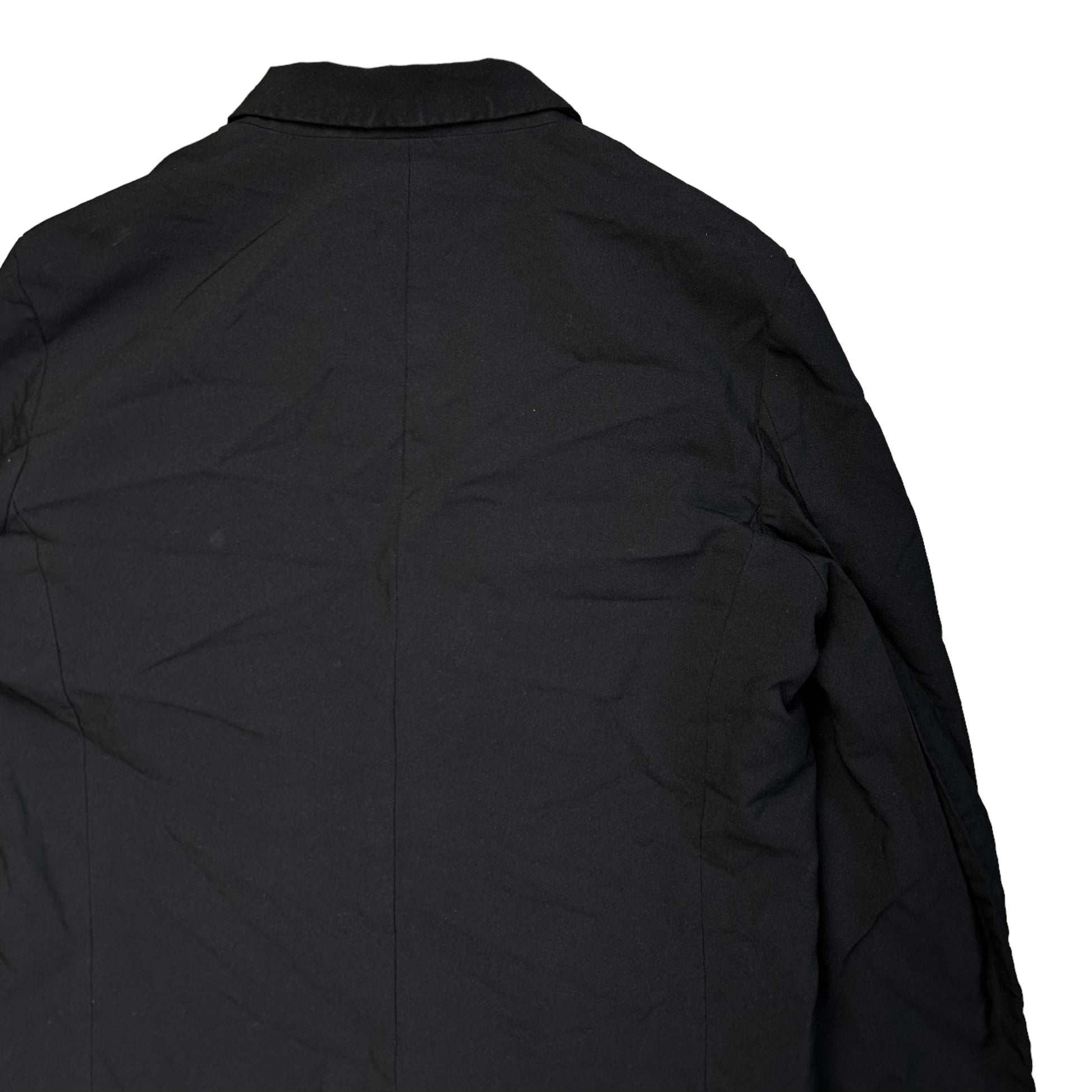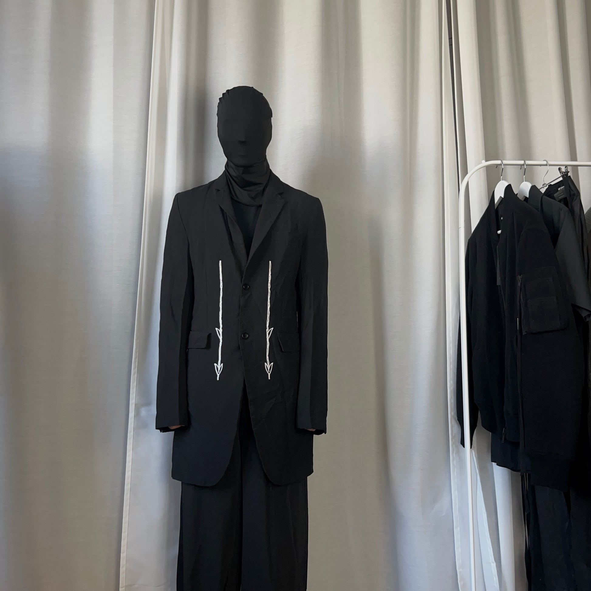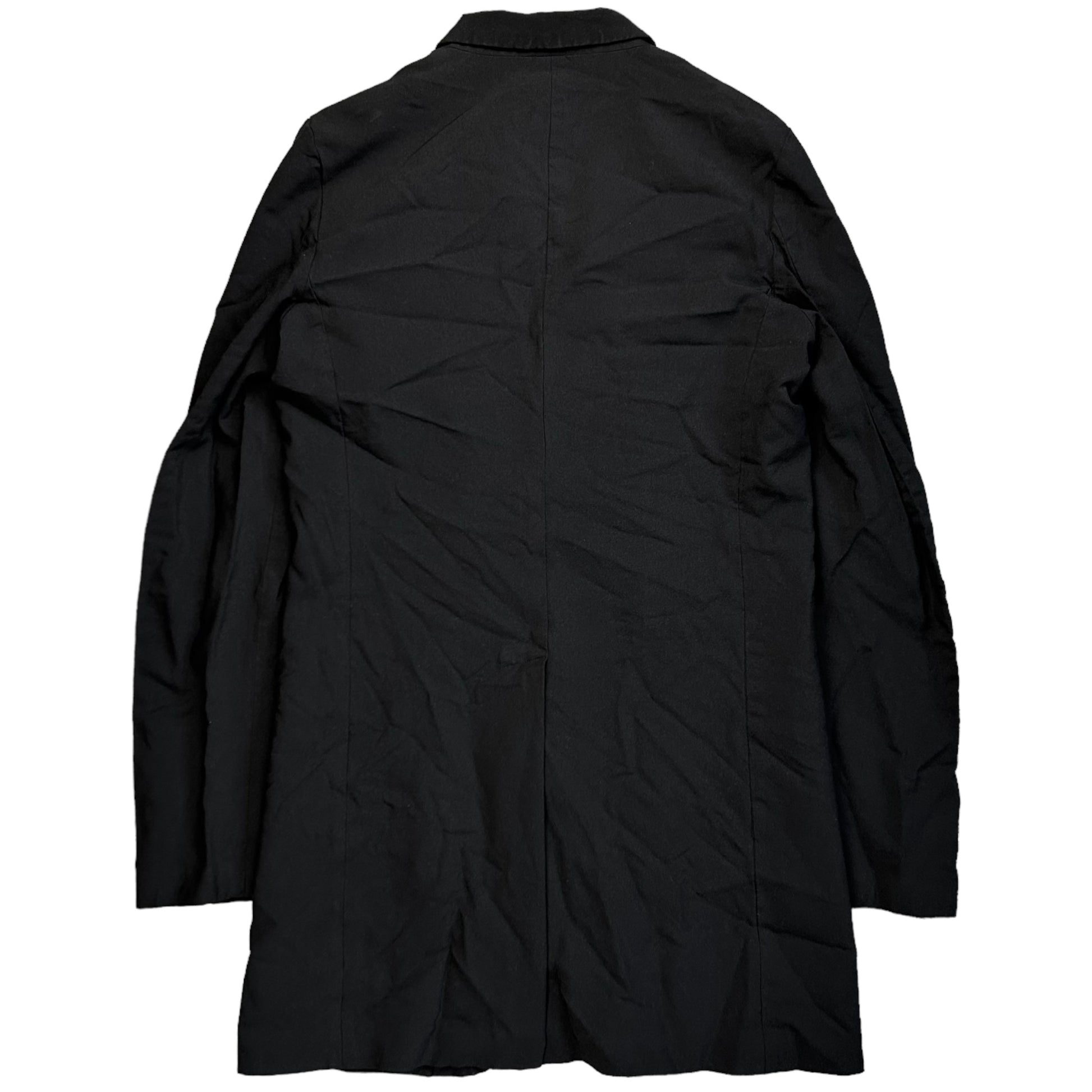 Medium length blazer coat from the Fall Winter 2013 collection of the Comme des Garcons Black line. Conrast white embroidery going down the button line of both sides potraying a line with abstracts implemented. Tonal double button closure with a lapel collar. Special treated and dyed polyester material creating a crinkly and unique surface. Relaxed and slouchy cut with elongated sleeves.