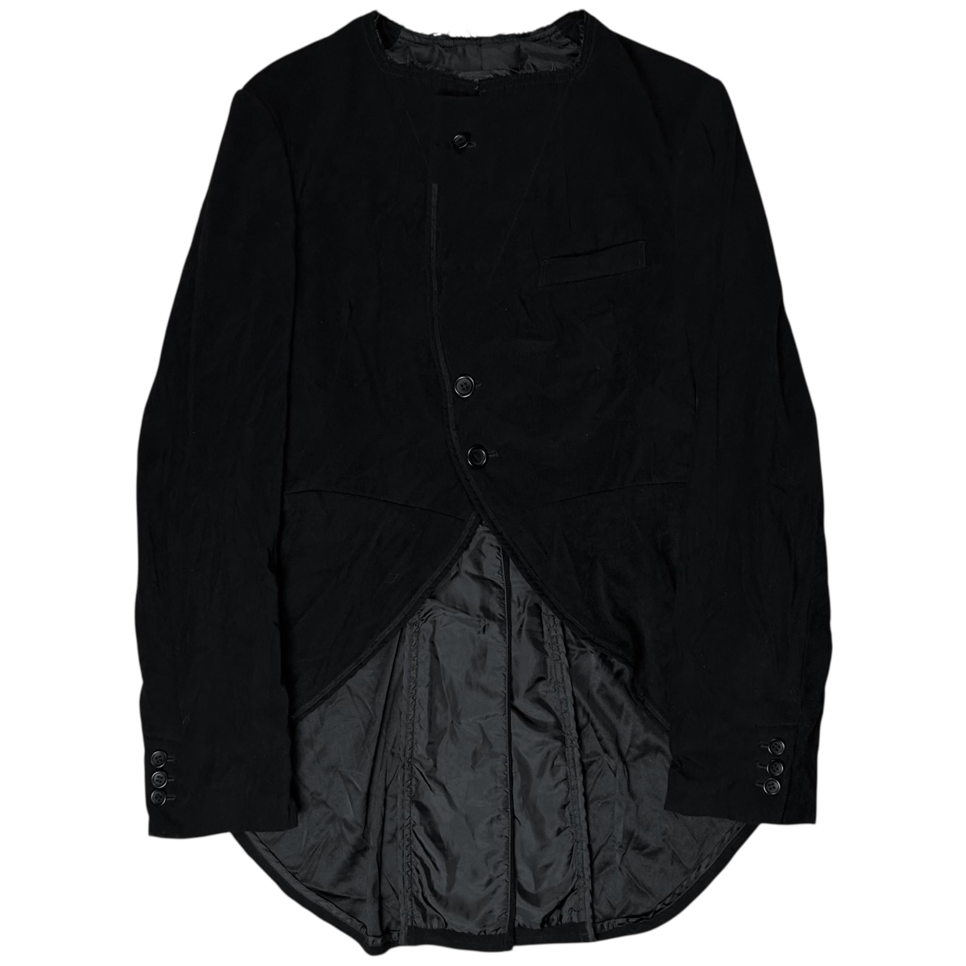 Blazer from the premium CDG line Comme des Garcons Black. Collarless construction with distressed finishes and raw hems. Tonal button closure allowing two collar styles. Tail coat silhouette with curved waist line and a longer back. Made from a brushed wool blend with a velvet like feel. Regular cut..