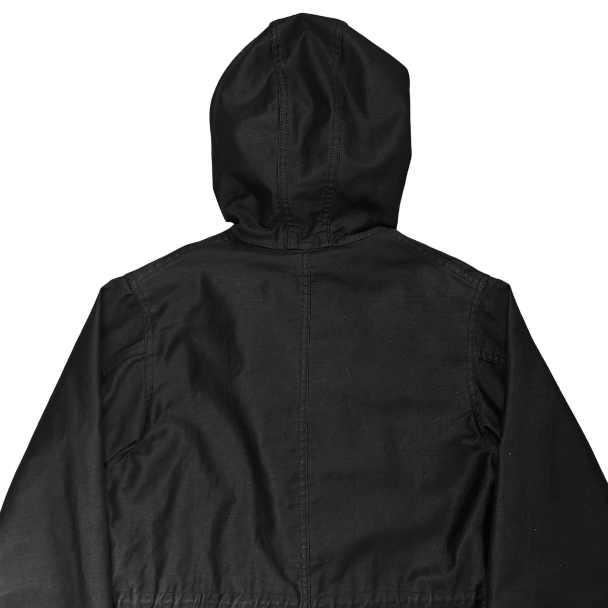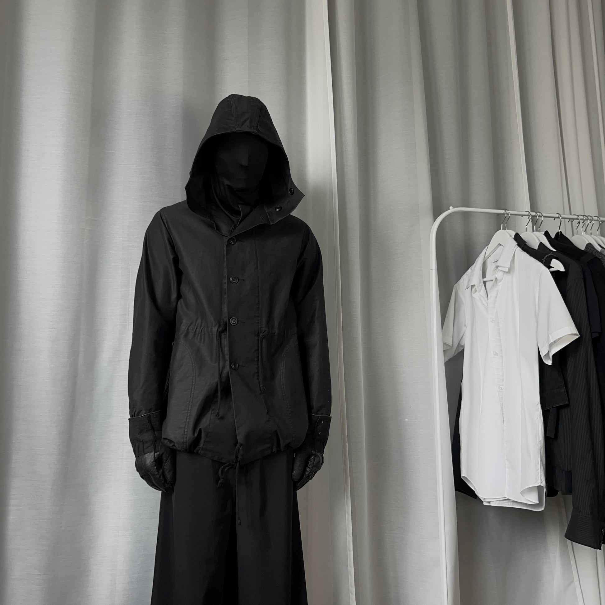 Parka jacket from the Fall Winter 2011 collection of the CDG Black line. Toanl button closure with a high neck creating a balaclava look when the hood is up. Implemented lace string construction at the hem and the center allowing different cinched styling options. Made from coated black cotton. Oversized cut.