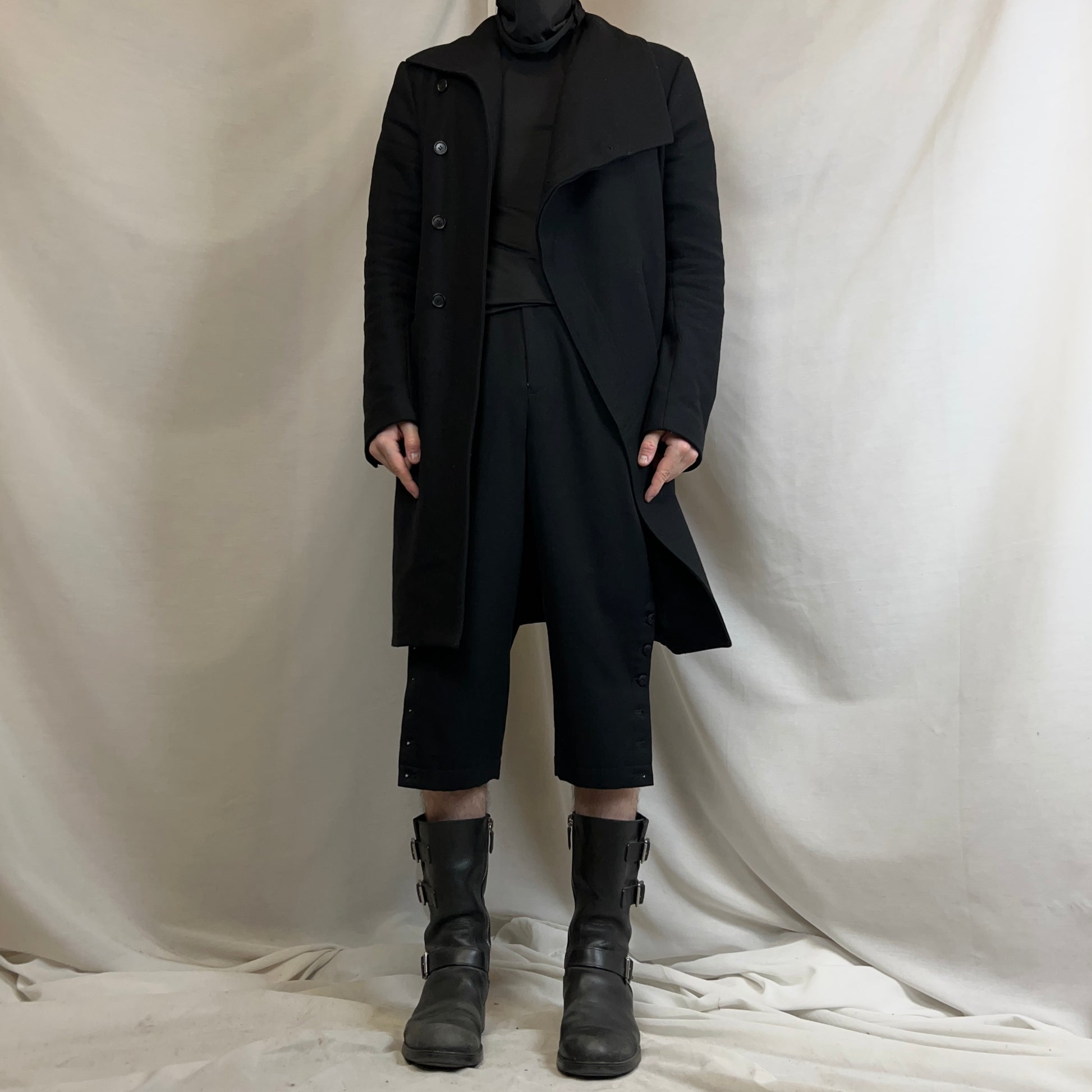 Capri pants from the Fall Winter 1988 collection of CDG womenswear mainline. Interesting tonal layered buttons at the hem allowing to change the cut. Traditional waist construction with a back slid and tonal belt with silver buckle closure to adjust the waist width. Made from a black wool material. Slim cut with an over knee length.