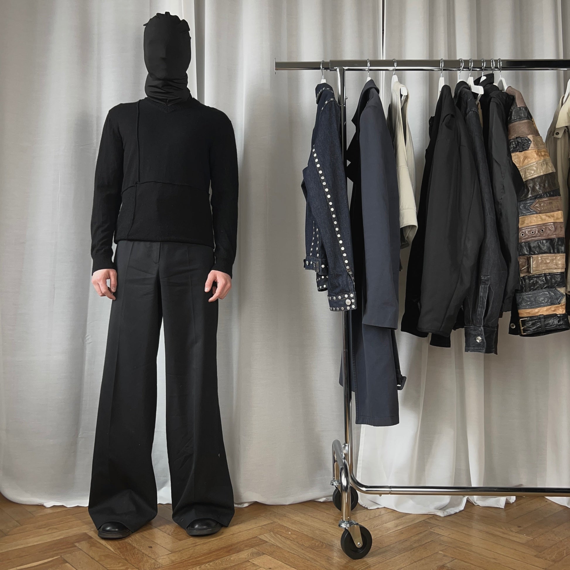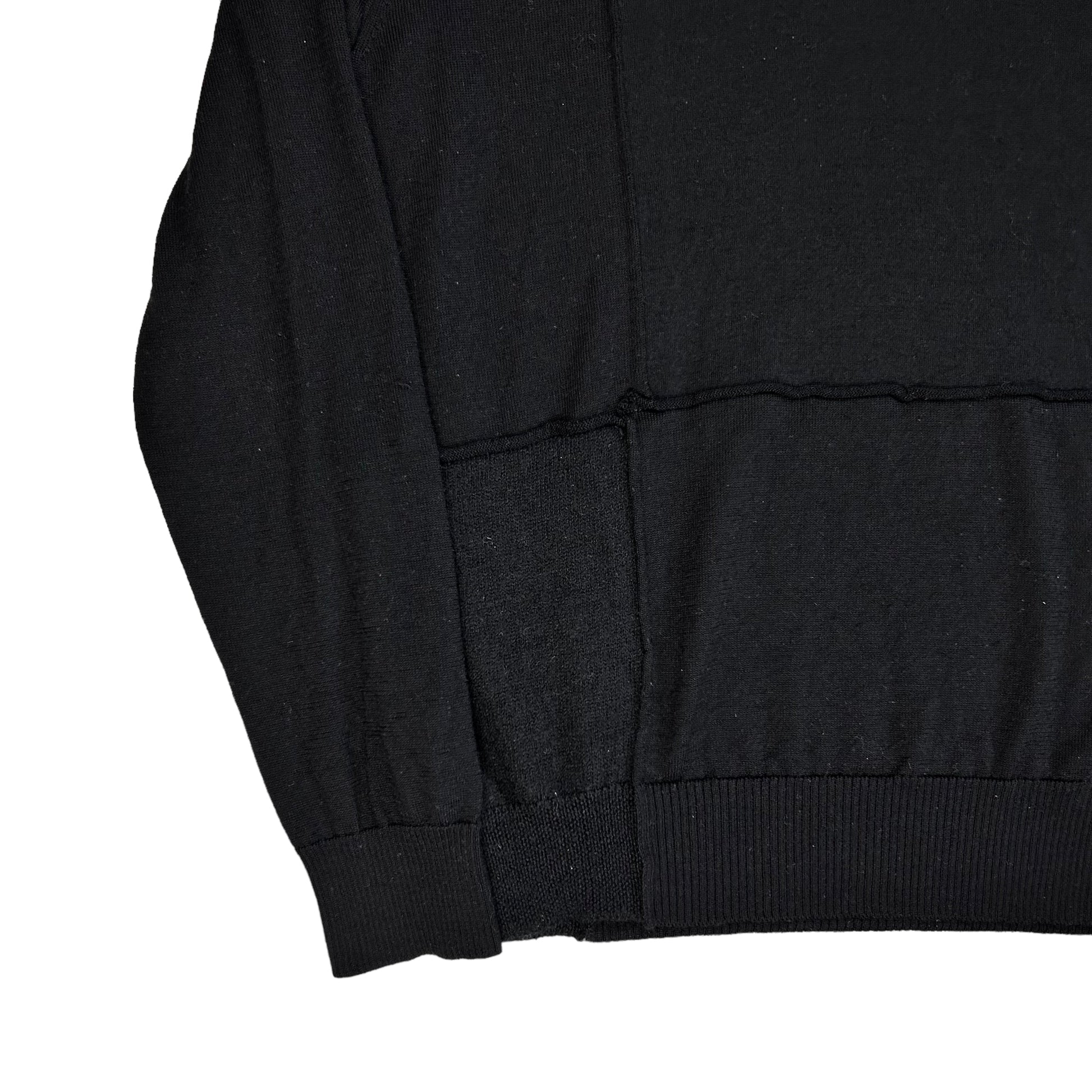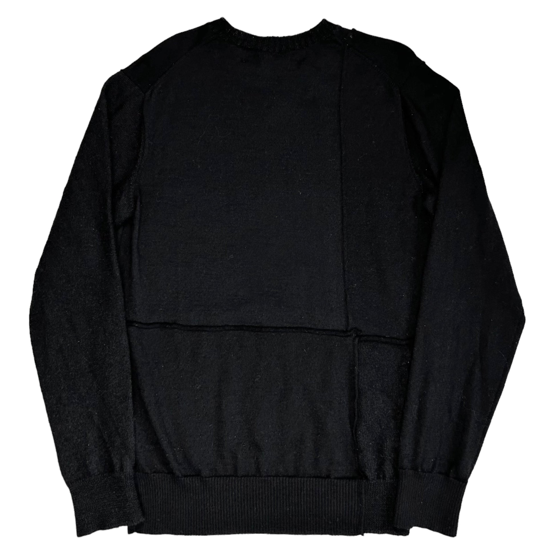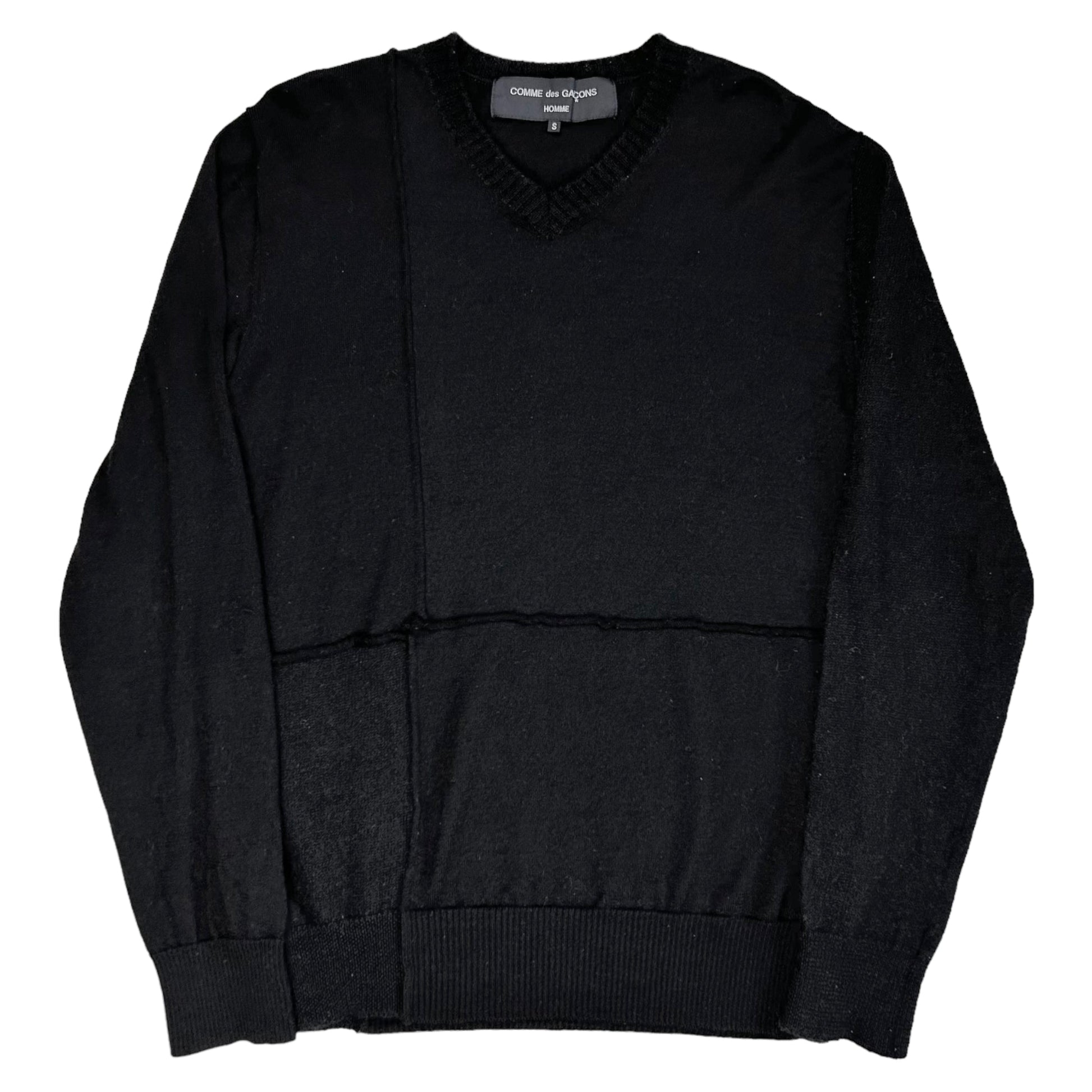 Black wool sweater from the CDGH Fall Winter 2006 collection. Cut and sew patchwork construction with thick 3D seams throughout the sweater. Ribbing at the v-neck collar, the sleeve cuffs and waistband. Made from a soft and lightweight wool material. Regular cut.