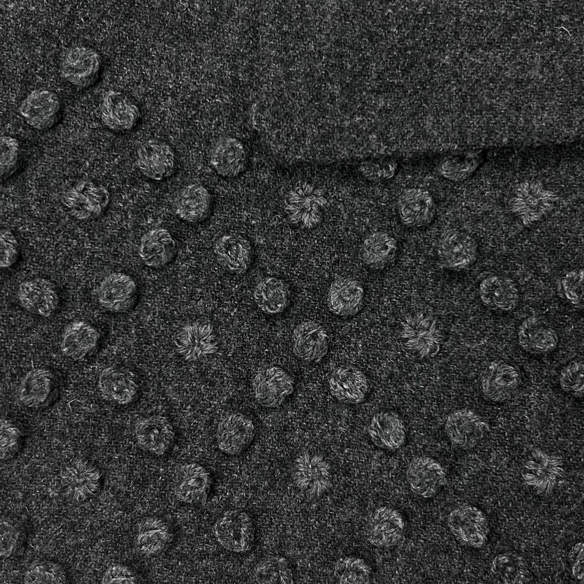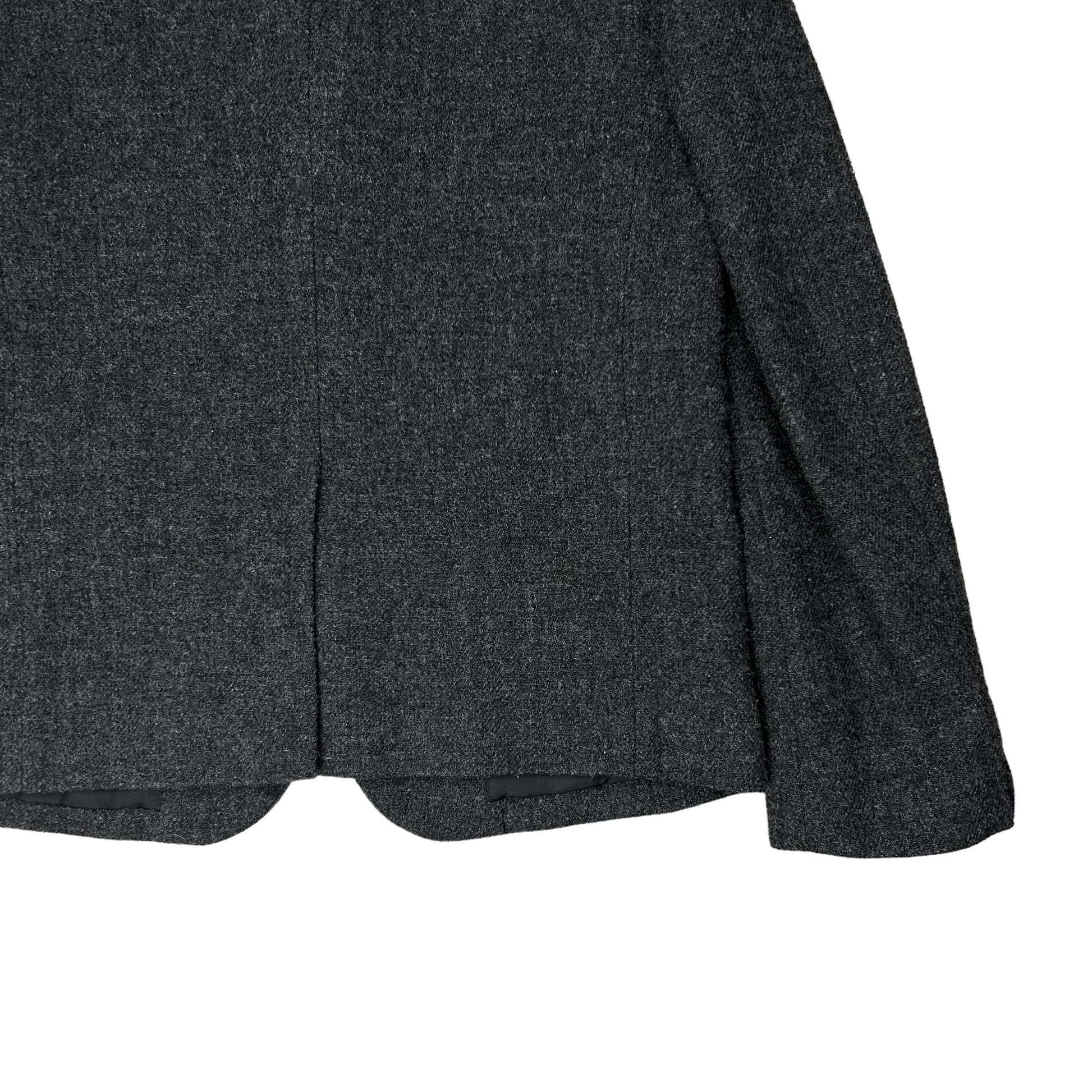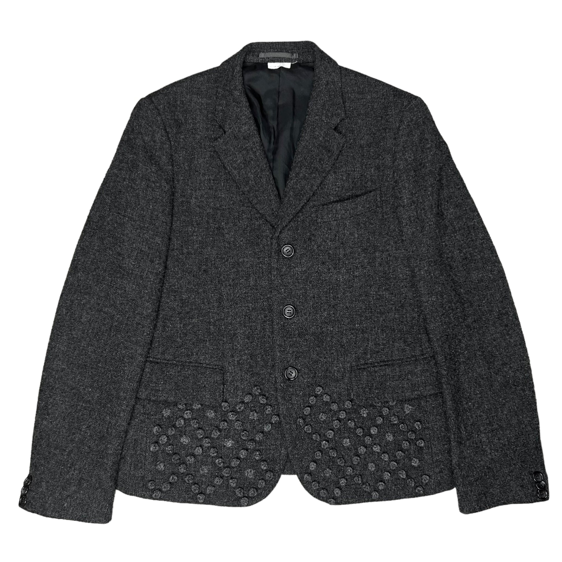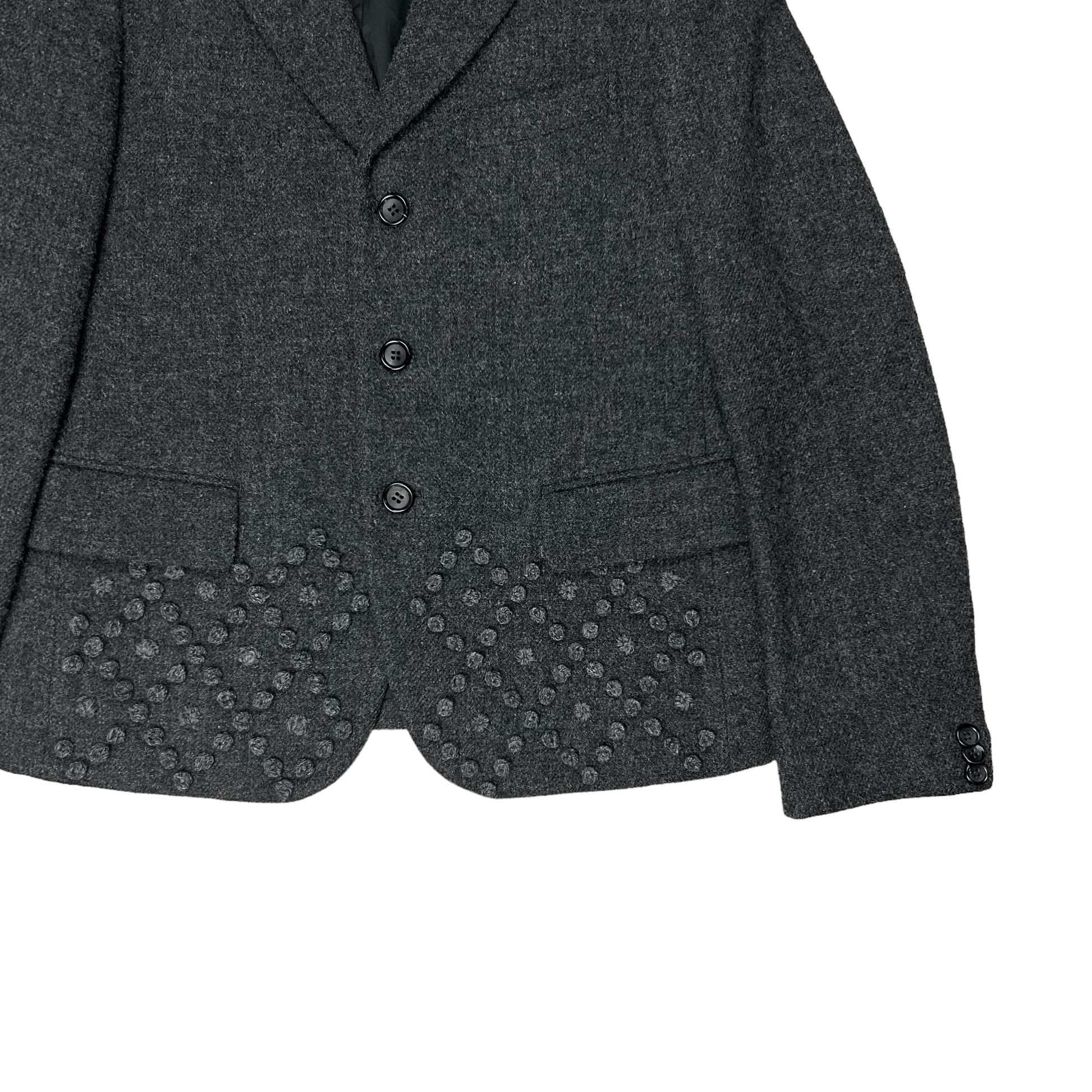Grey wool blazer jacket from the CDGH+ Fall Winter 2013 collection. Tonal 3D embroidery dots in a beautiful geometric pattern at the lower front. Flap pockets at the waist and a slid pocket at the chest. Made from high quality lana wool. Retailed for around 800€.