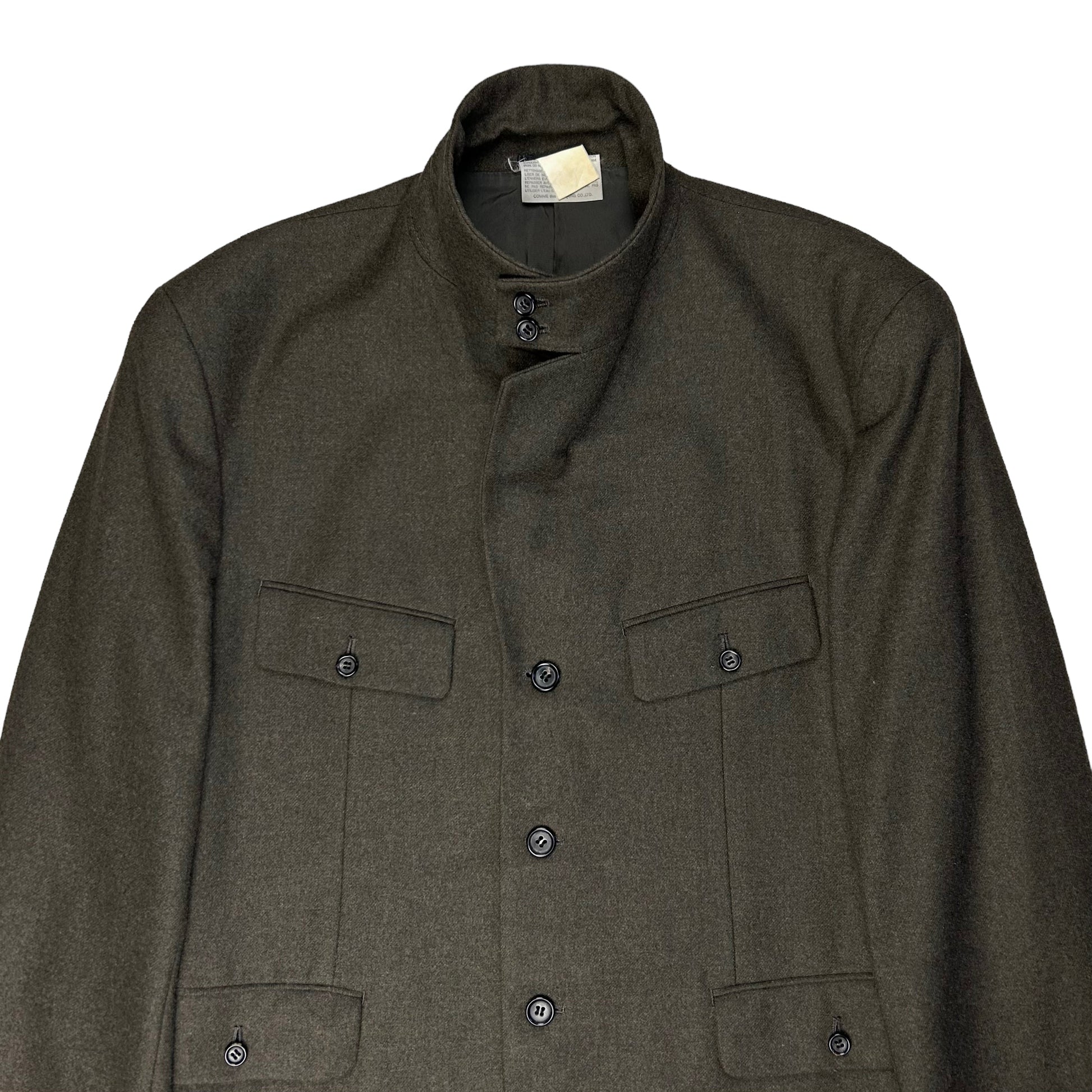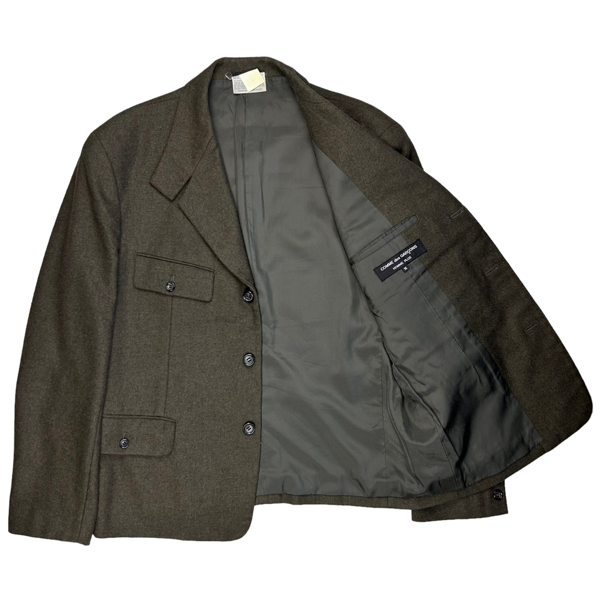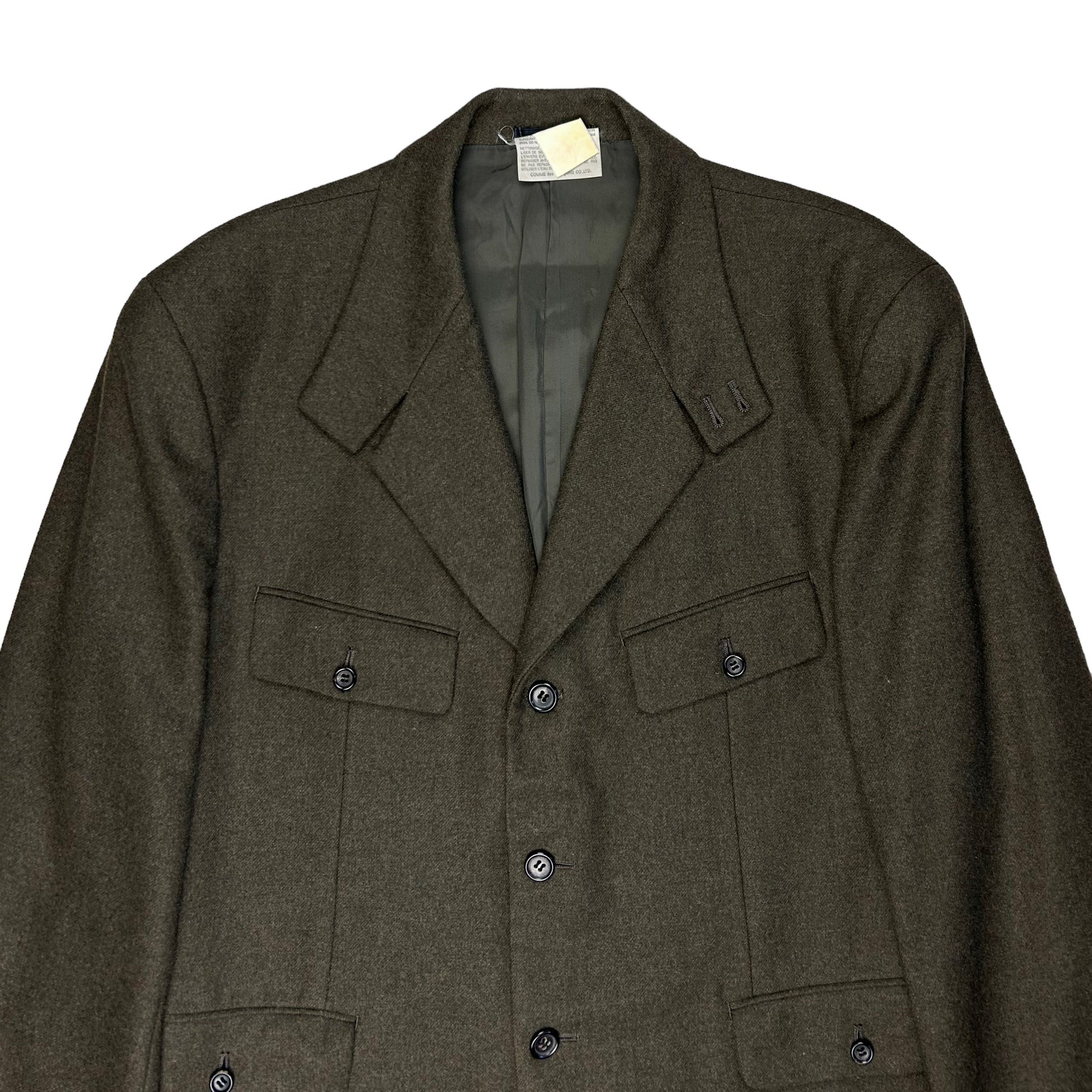 Vintage military inspired wool jacket from the mainline CDGH+. Black button closurw with three buttons at the front. Four flap pockets at the front. Interesting collar construction with two styling options. Subtle exaggerated shoulders. Made from a high quality and smooth wool material in a khaki olive with hints of brown. Short and boxy cut.