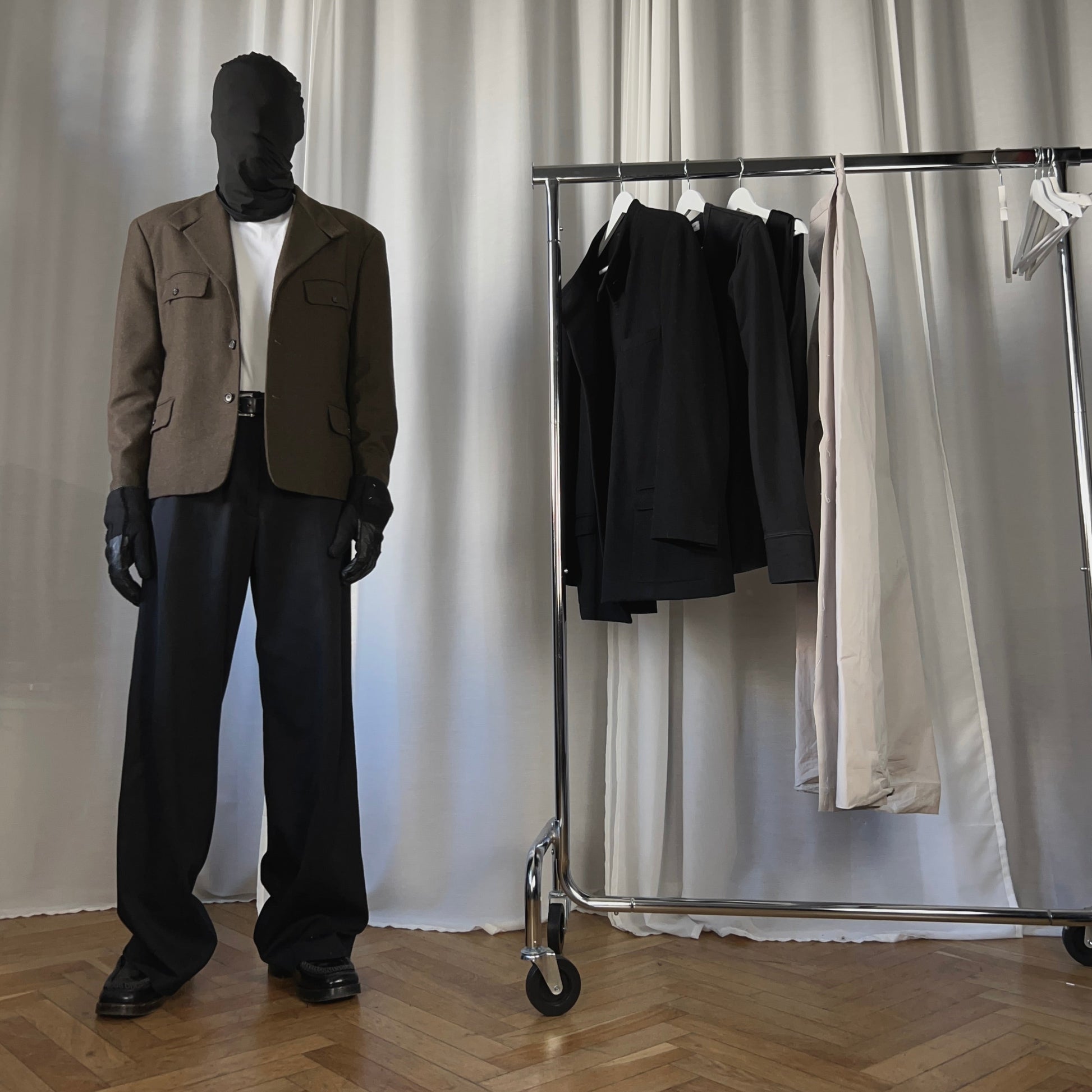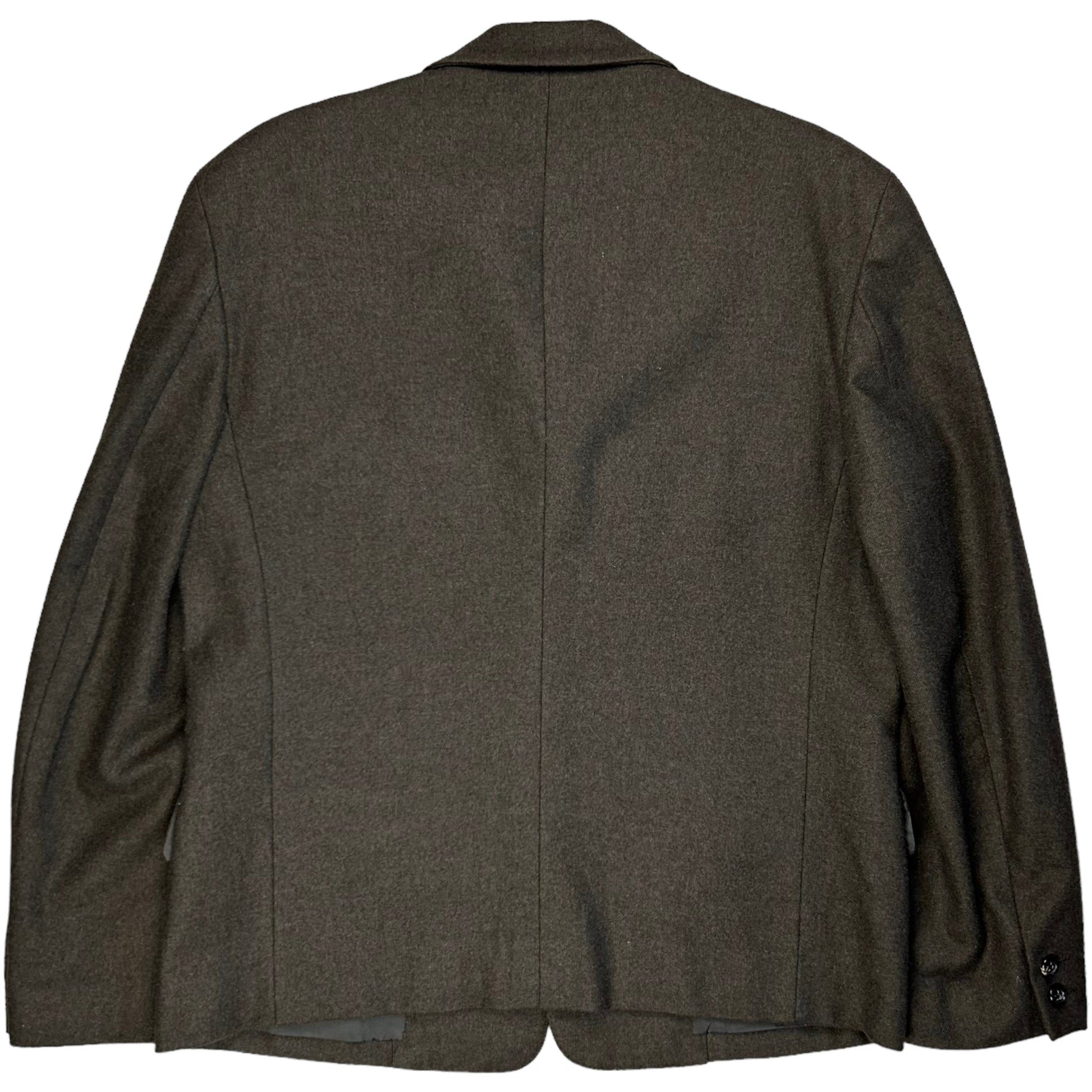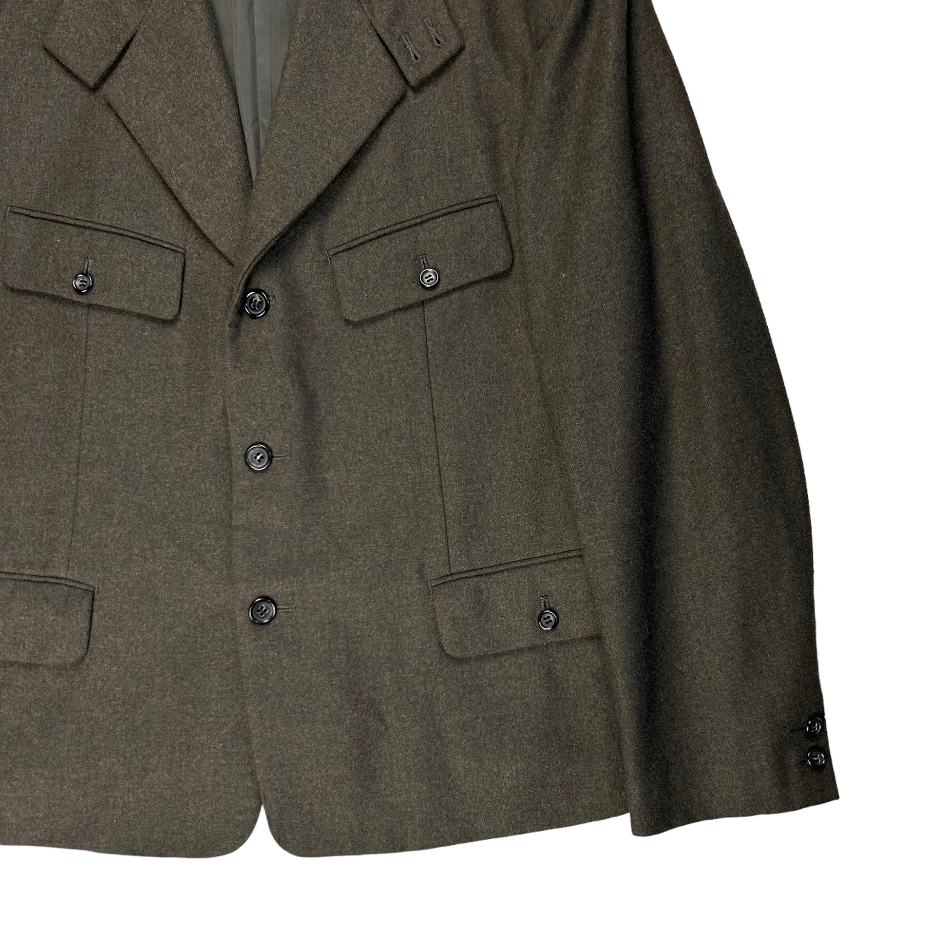 Vintage military inspired wool jacket from the mainline CDGH+. Black button closurw with three buttons at the front. Four flap pockets at the front. Interesting collar construction with two styling options. Subtle exaggerated shoulders. Made from a high quality and smooth wool material in a khaki olive with hints of brown. Short and boxy cut.