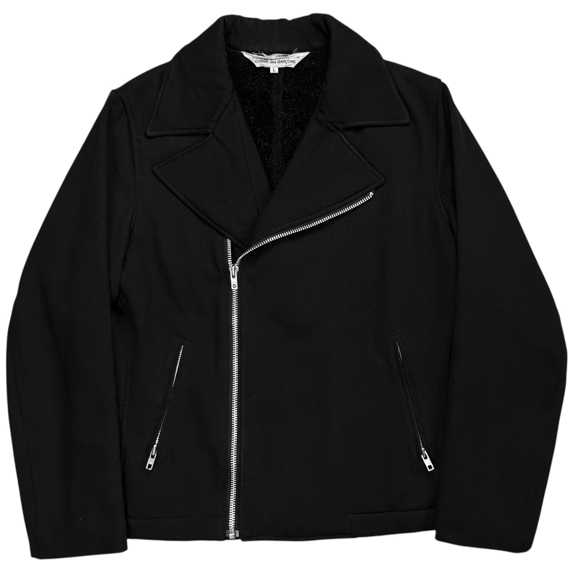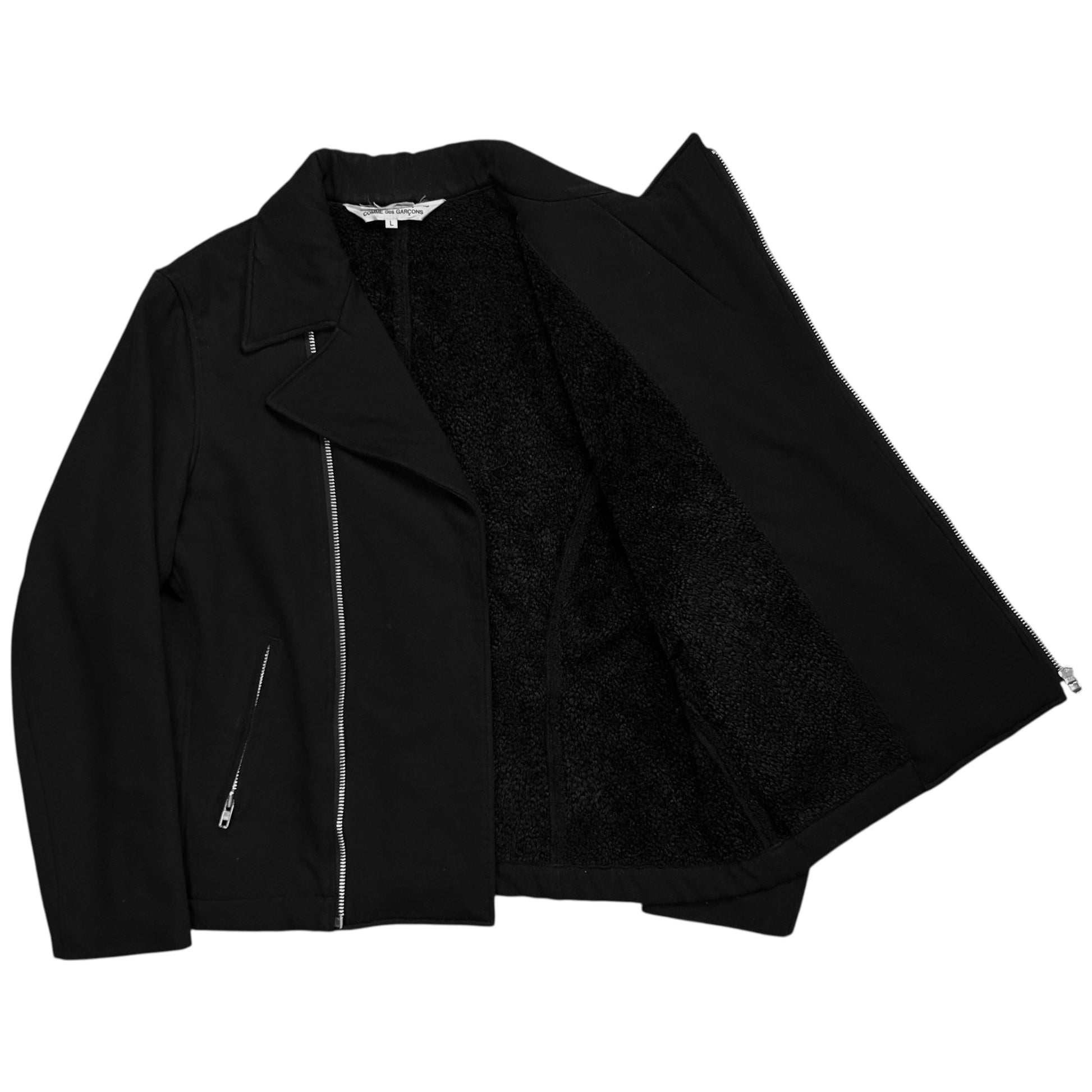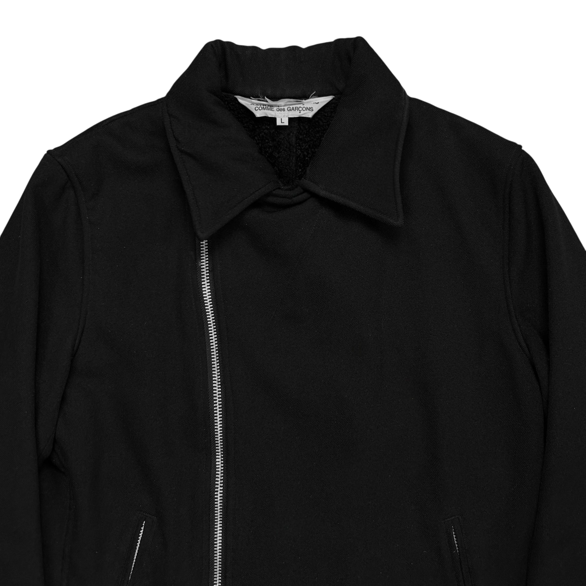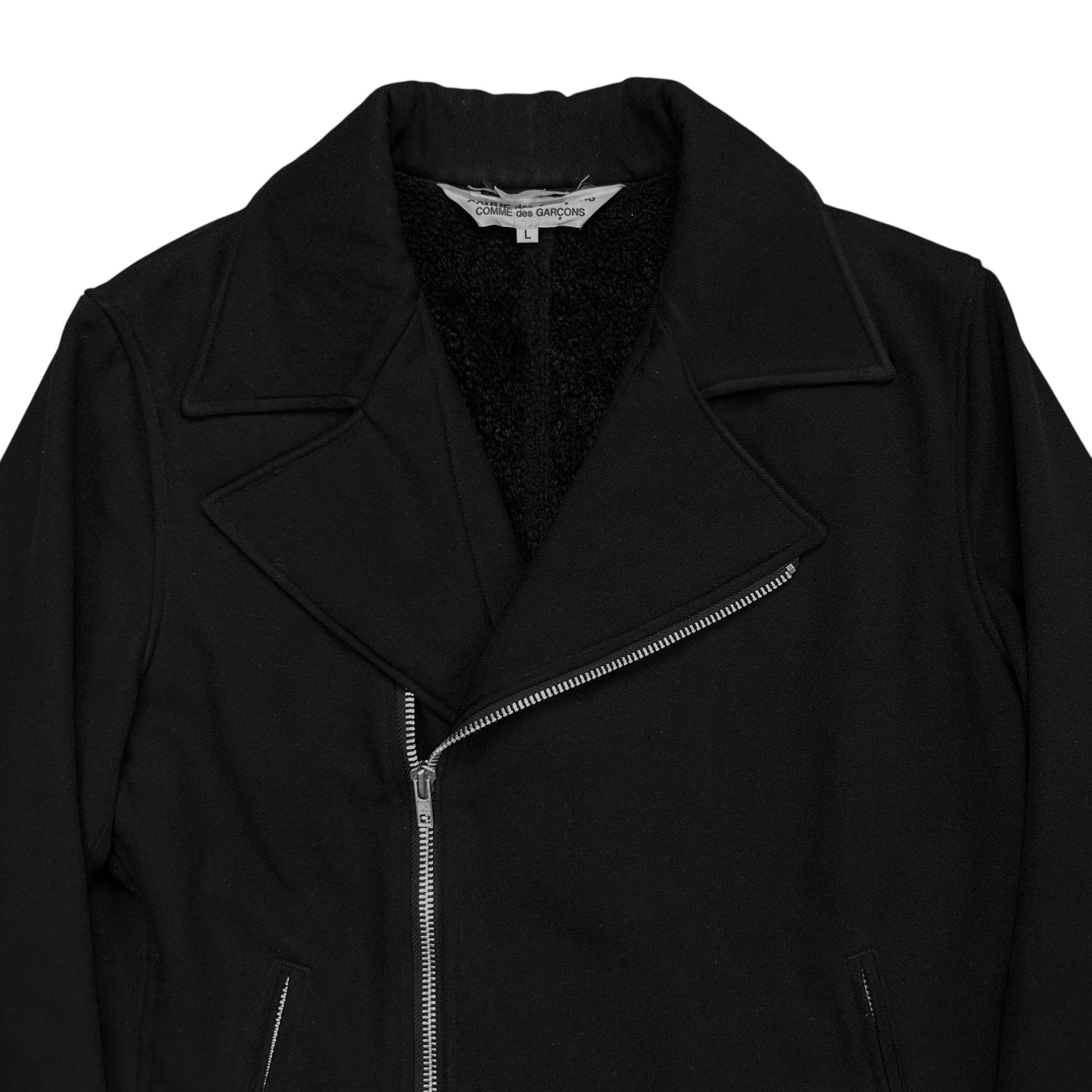 Vintage jacket from the CDG sub line Comme des Garçons Comme des Garçons. Skewed silver zip closure with a a classic biker collar. Further zippers at the front pockets and the sleeves. Made from a black wool material with a tonal sherpa lining on the inside. Boxy cut.