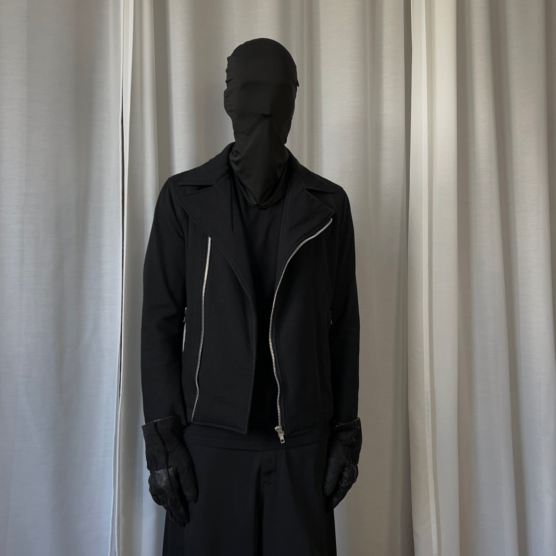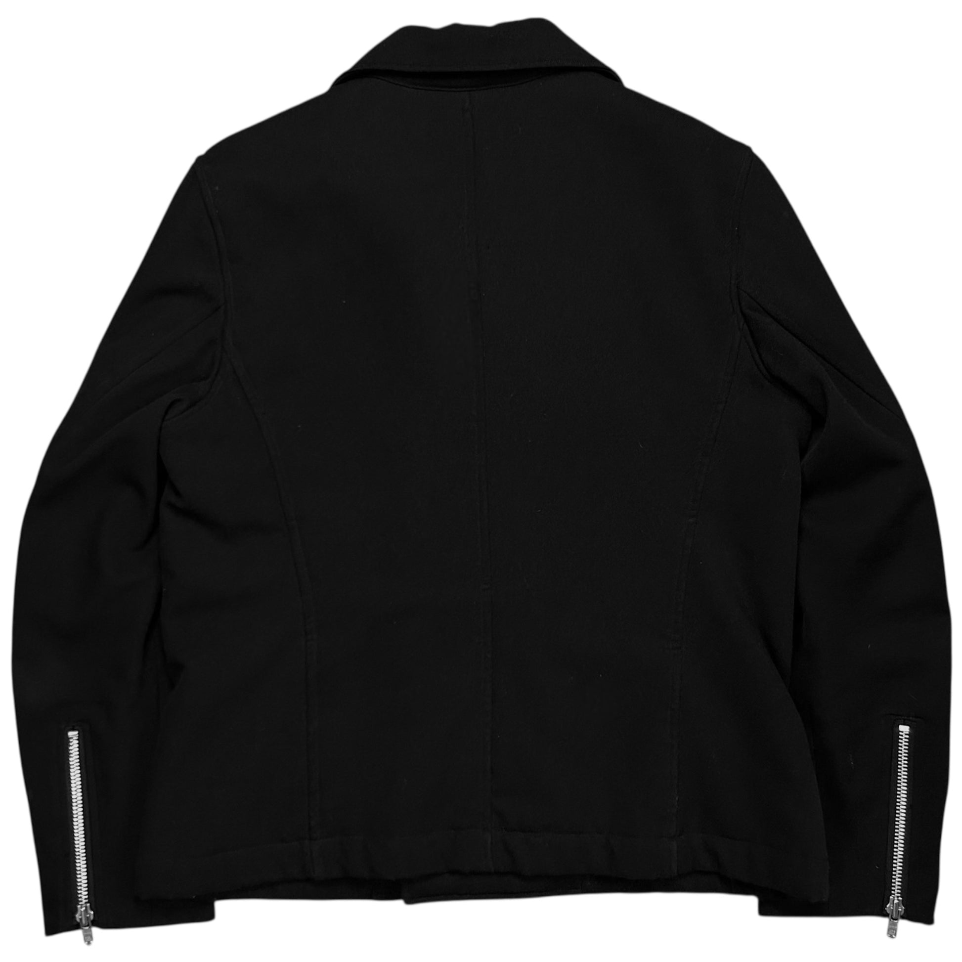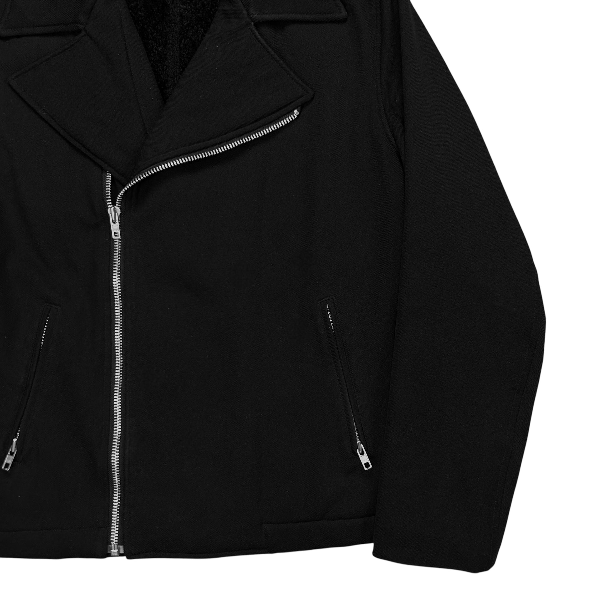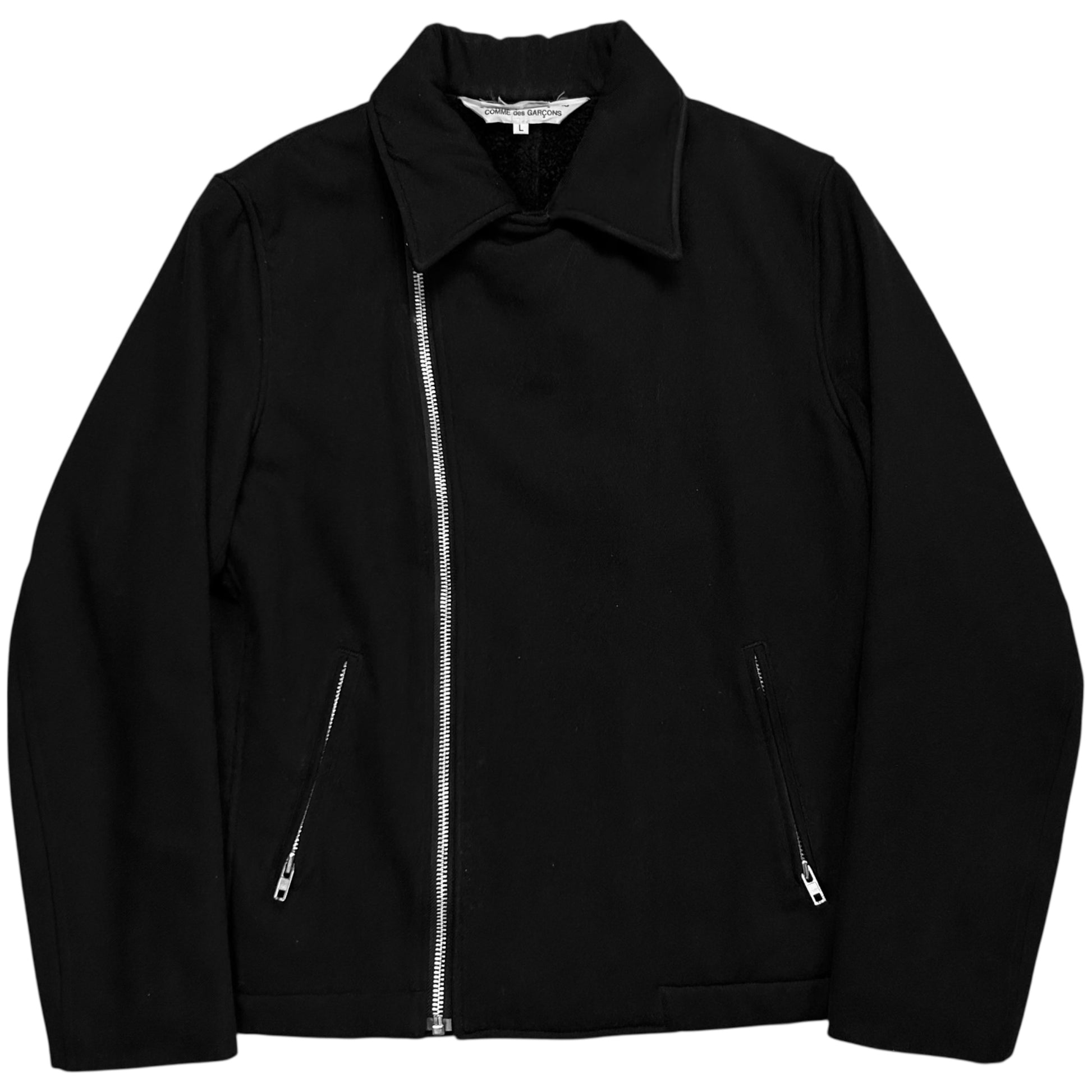 Vintage jacket from the CDG sub line Comme des Garçons Comme des Garçons. Skewed silver zip closure with a a classic biker collar. Further zippers at the front pockets and the sleeves. Made from a black wool material with a tonal sherpa lining on the inside. Boxy cut.