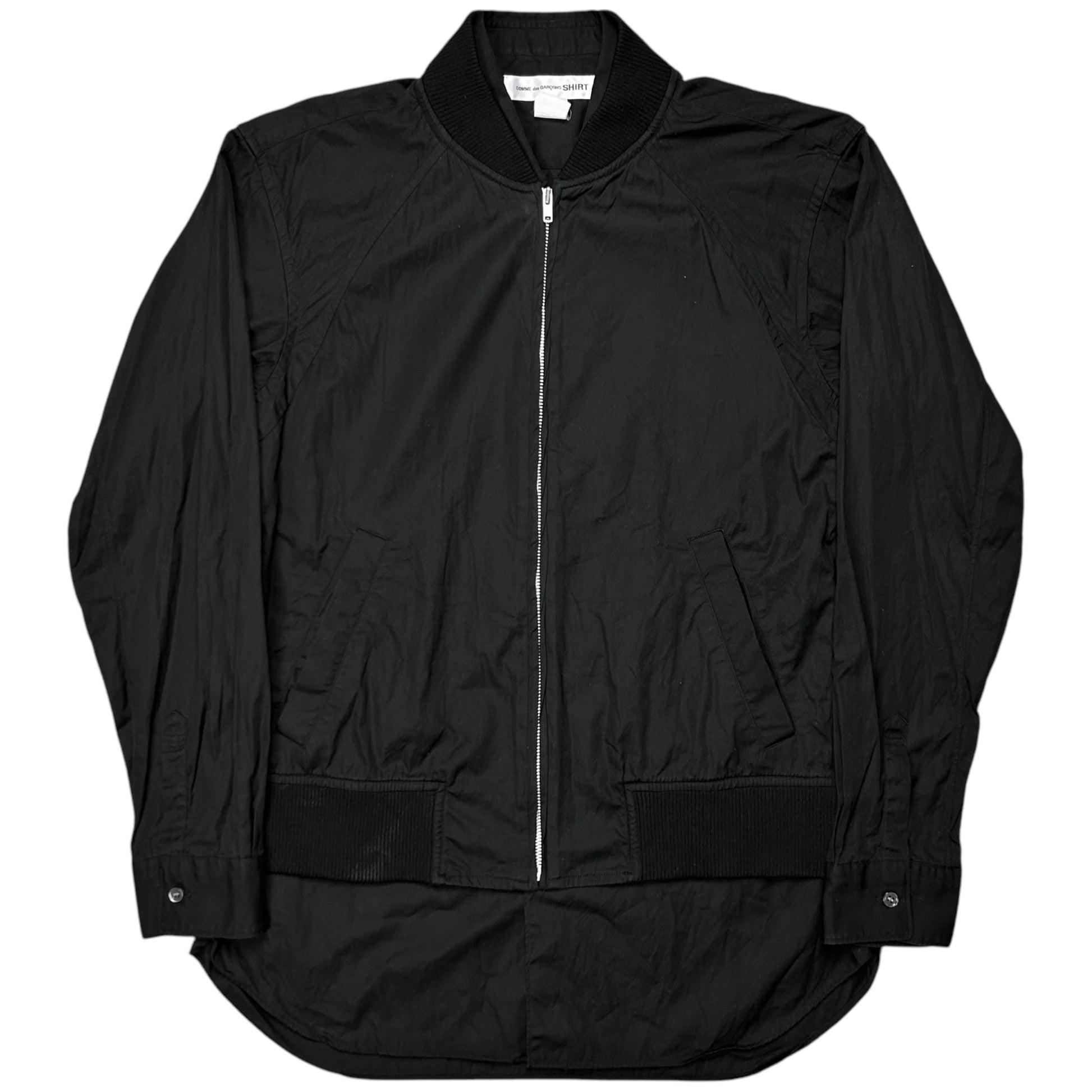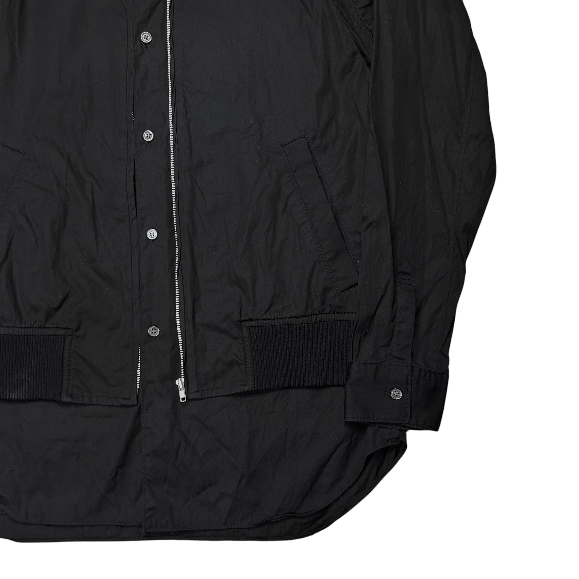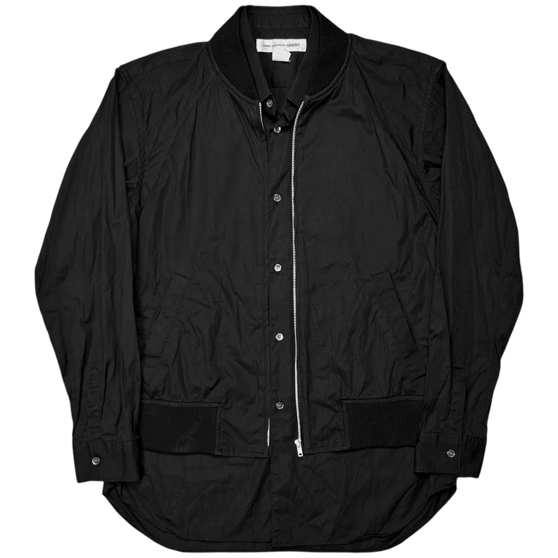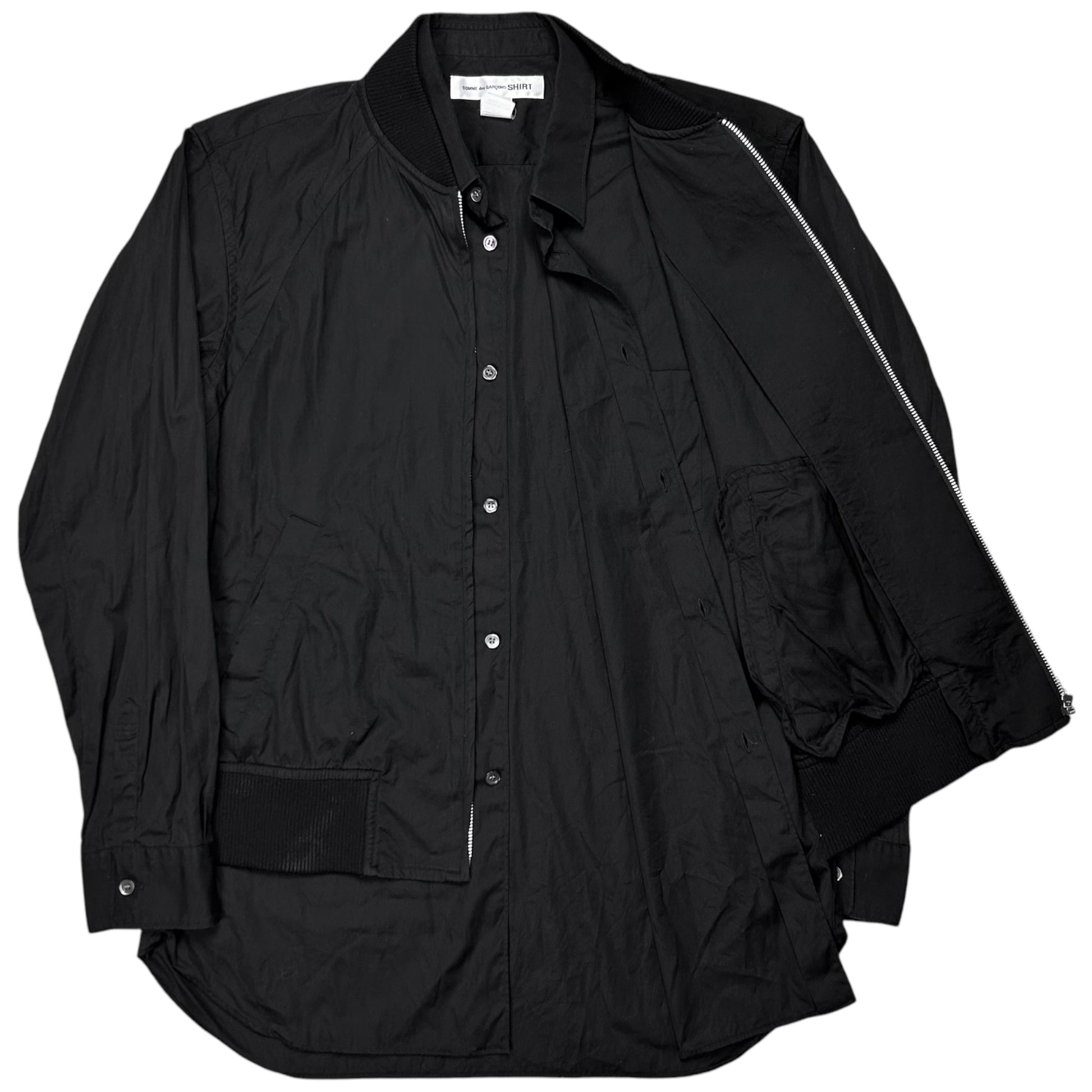 Hybrid shirt jacket from the Fall Winter 2019 collection of the CDG sub line Comme des Garcons shirt. Bomber jacket sewed to the side hems with silver zip closure and rib waistband. Unique design approach with the cropped jacket layer and the button up shirt layer sticking out at the front. Made from black cotton. Relaxed cut. Retailed for around 600€.