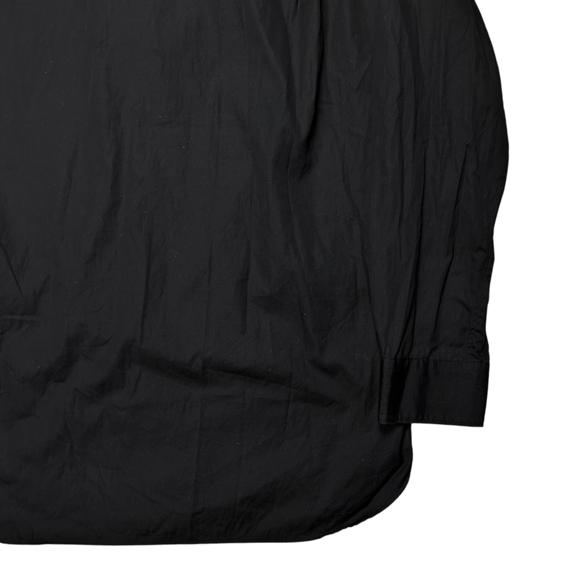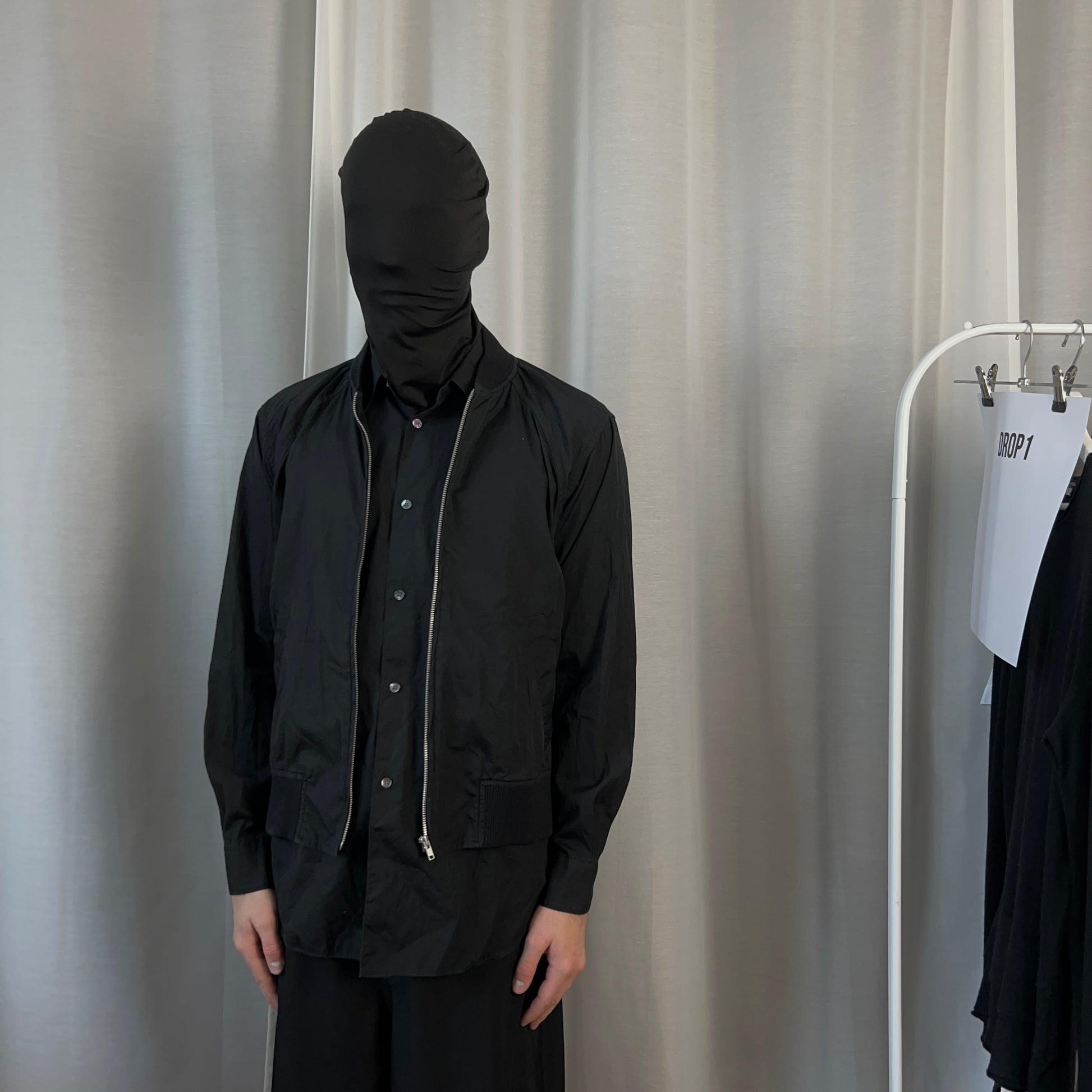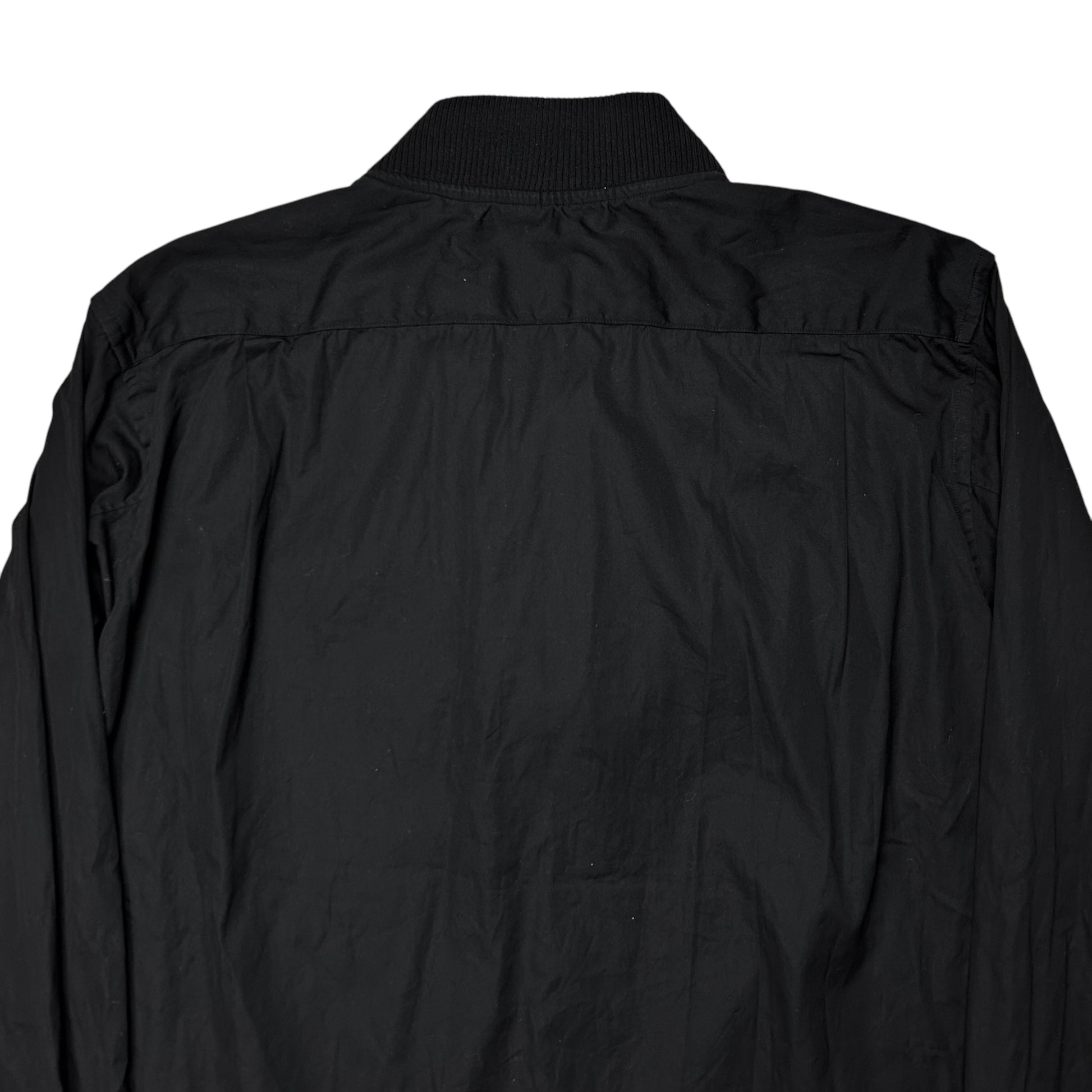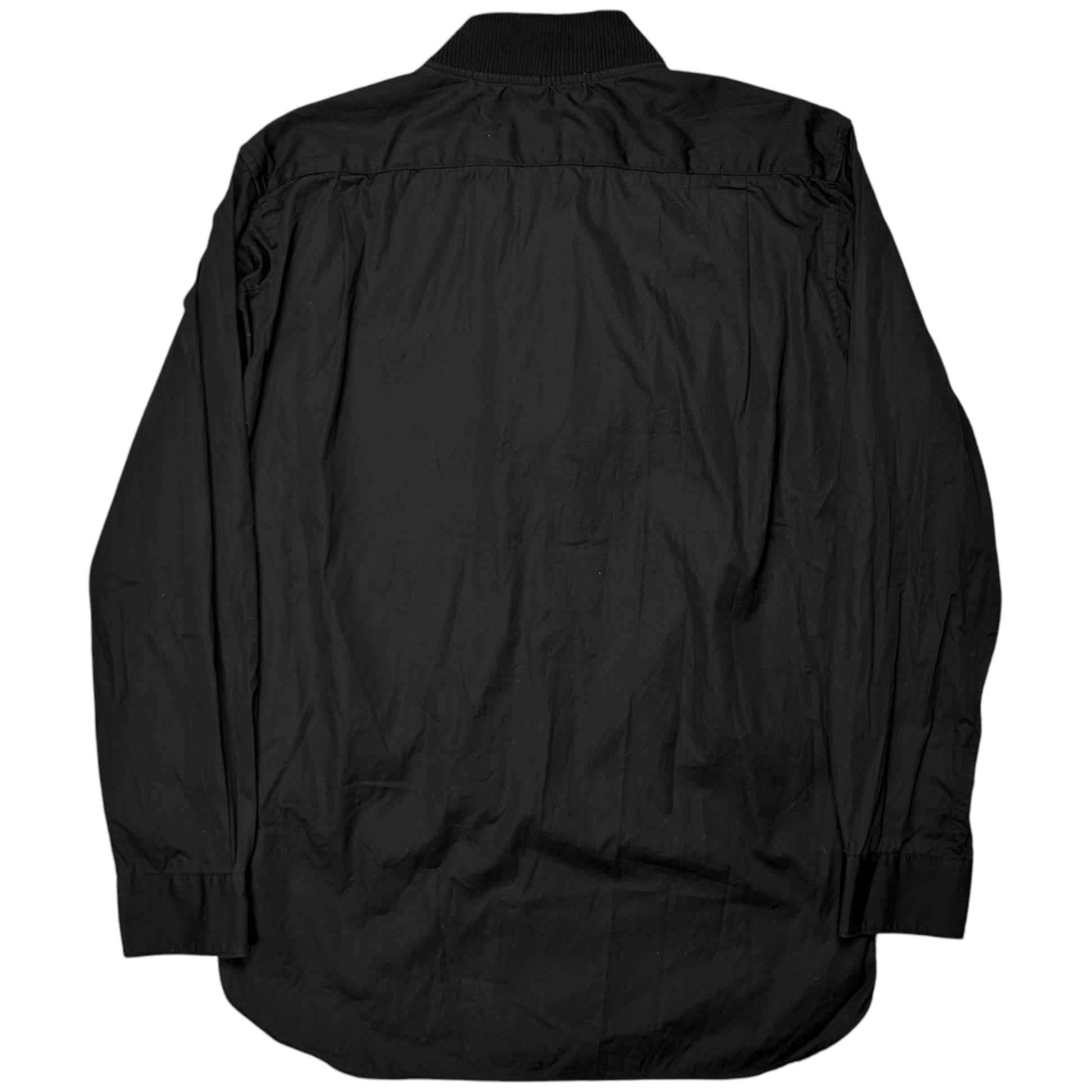 Hybrid shirt jacket from the Fall Winter 2019 collection of the CDG sub line Comme des Garcons shirt. Bomber jacket sewed to the side hems with silver zip closure and rib waistband. Unique design approach with the cropped jacket layer and the button up shirt layer sticking out at the front. Made from black cotton. Relaxed cut. Retailed for around 600€.