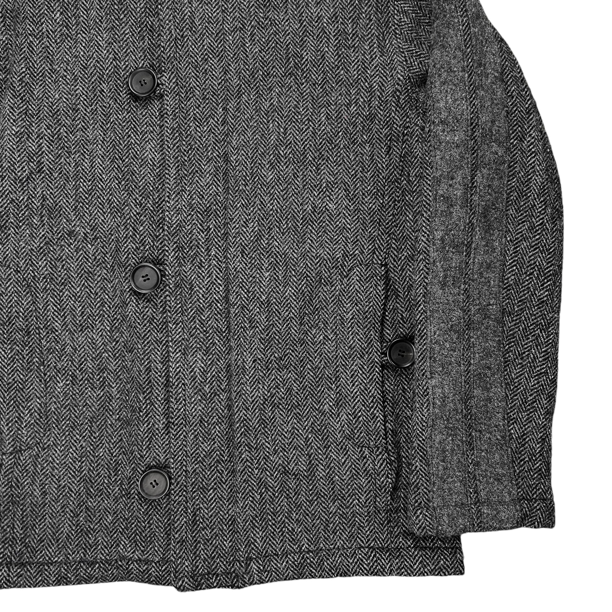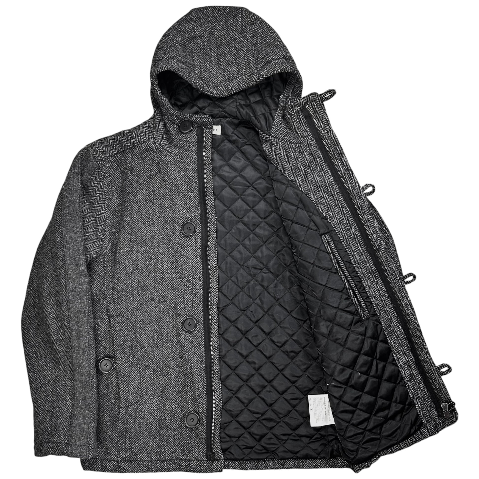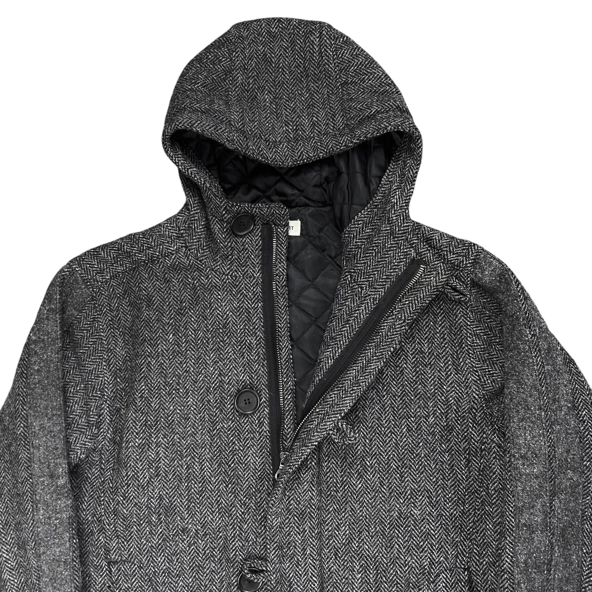 Overcoat from the Fall Winter 2017 collection of the CDG sub line Comme des Garrcons Shirt. Concealed two way Salmi zip with further and button closure which are also used on the front pockets. Tonal reinforced double stripe detail along the sleeves. Made from a wool material with a grey and black texture and black quilted lining on the inside. Oversized cut.