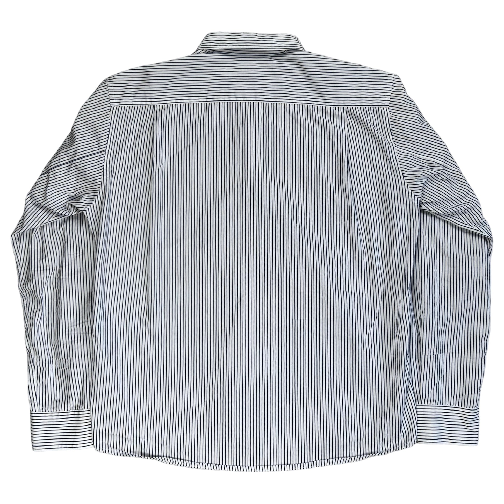 Office button up shirt from the CDG sub line Comme des Garcons Shirt. White shirt with vertical stripes in blue. Runway exclusive which was never produced. Sample tag inside. Colorful print on the front with an African inspired mask print. Boxy cut.