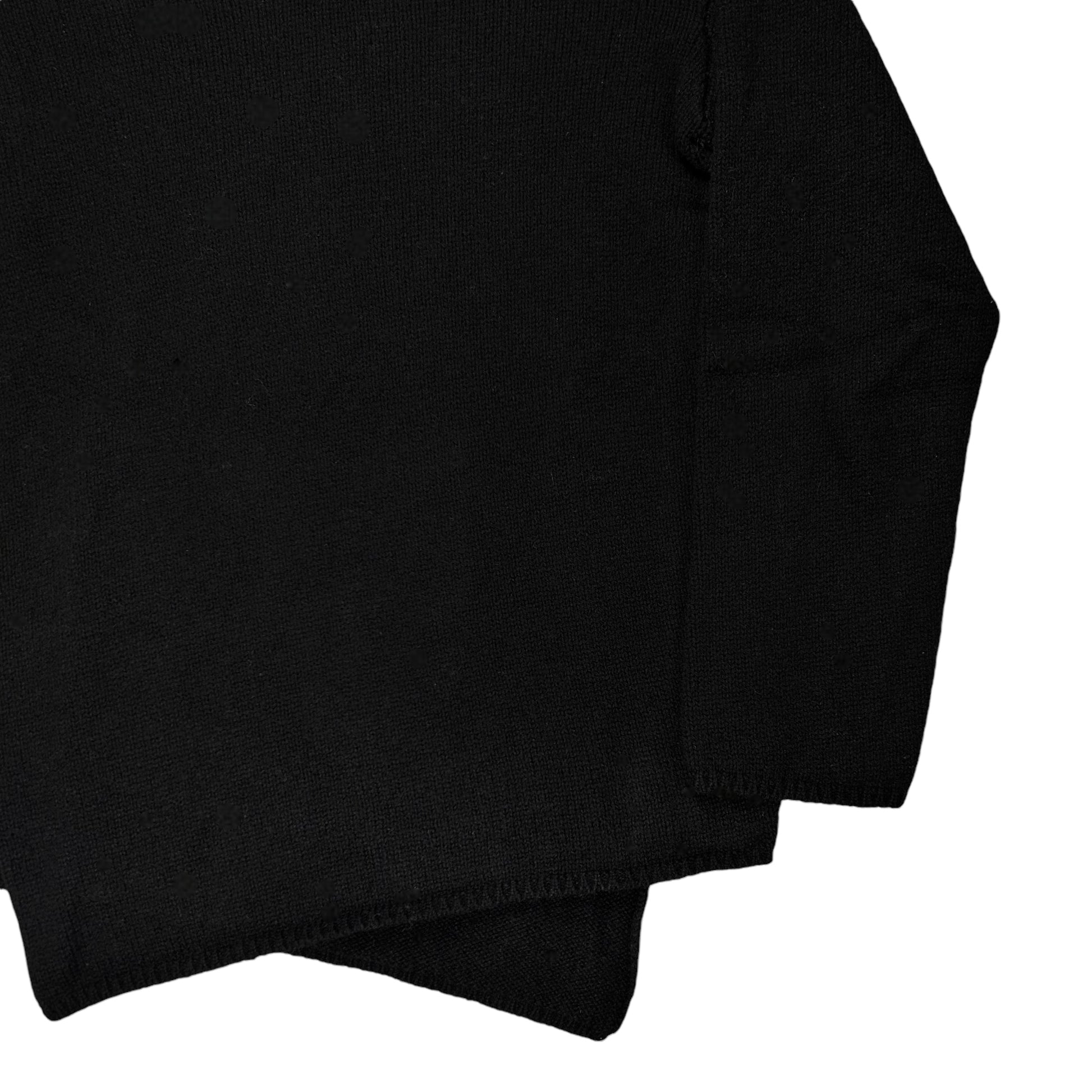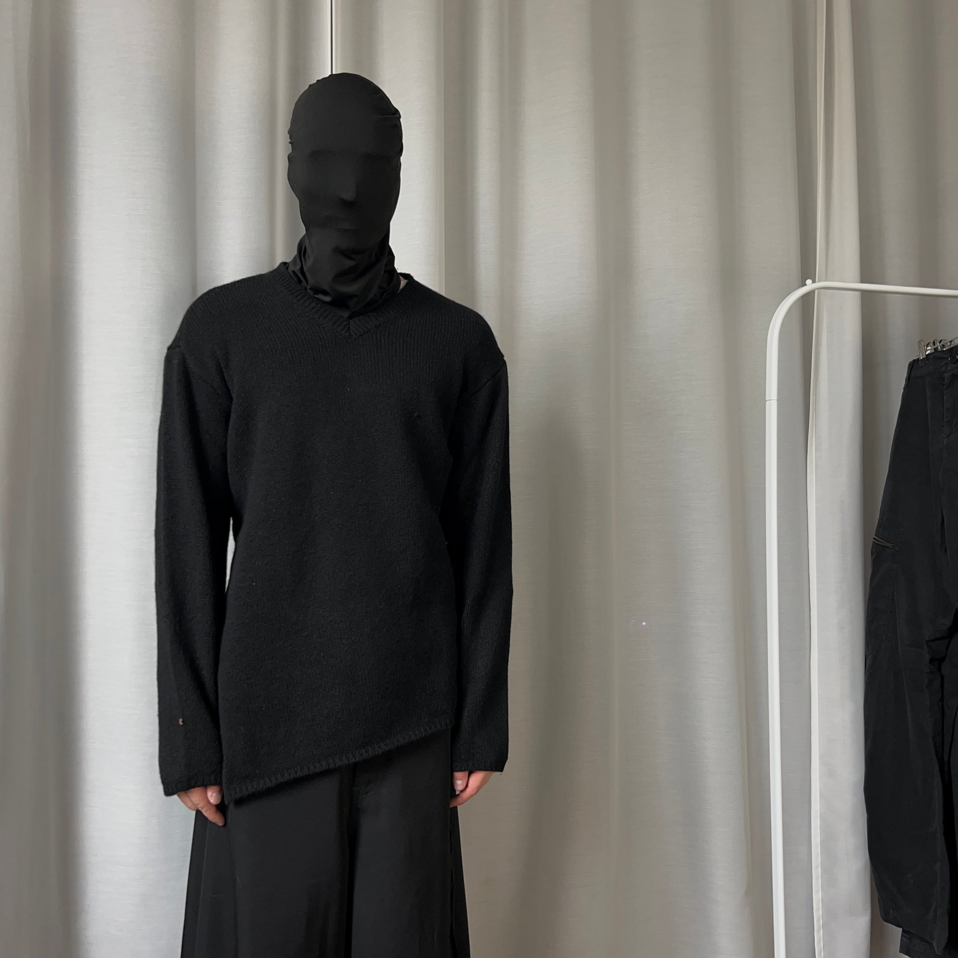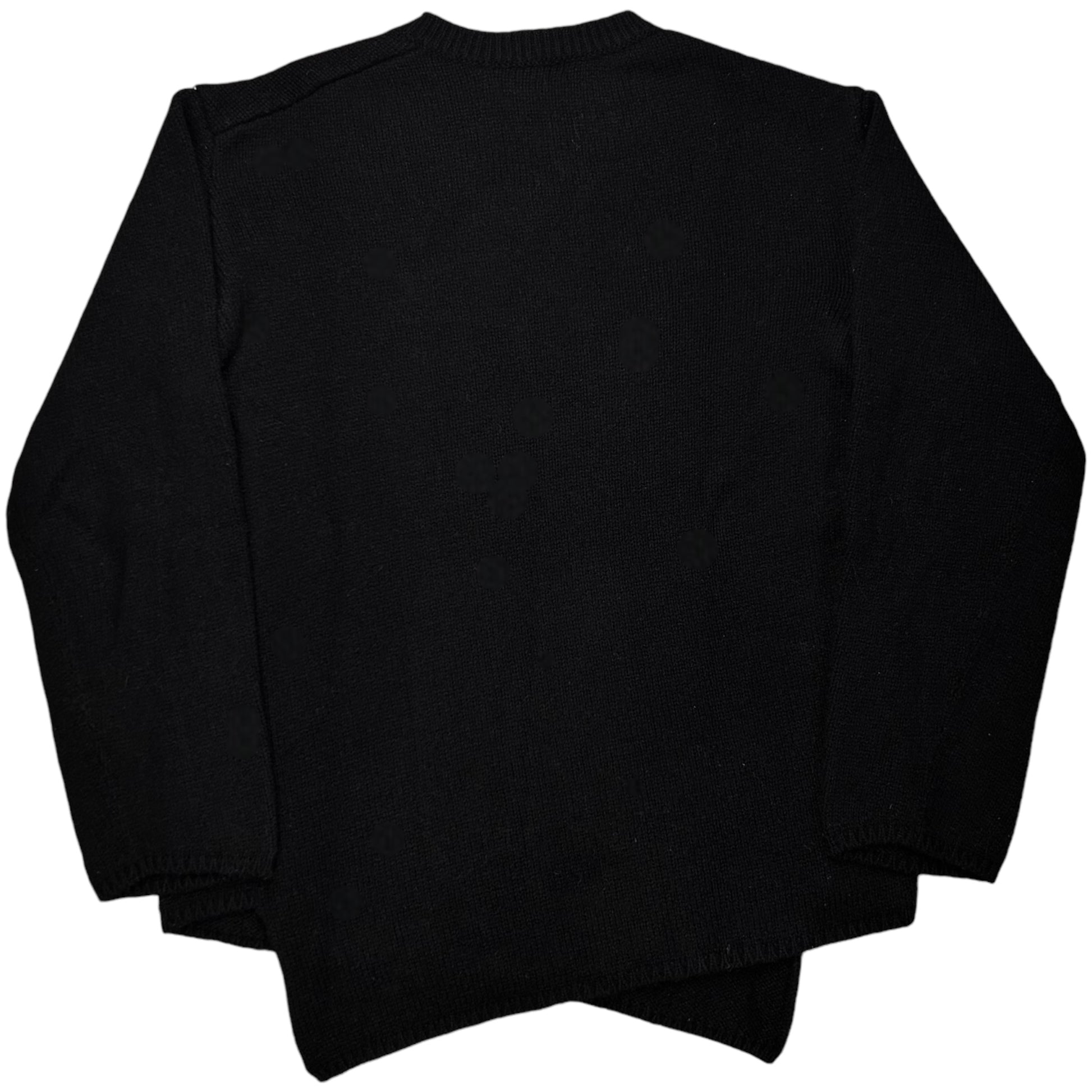 Knit jumper from the CDG sub line Comme des Garcons Shirt. Asymetric construction with twisted seams creating an uneven skewed hem line and protruding and recessing front and back. Small ribbing at the sleeves with regular ribbing at the v neck collar. Made from black wool. Oversized cut. Retailed for around 500€.