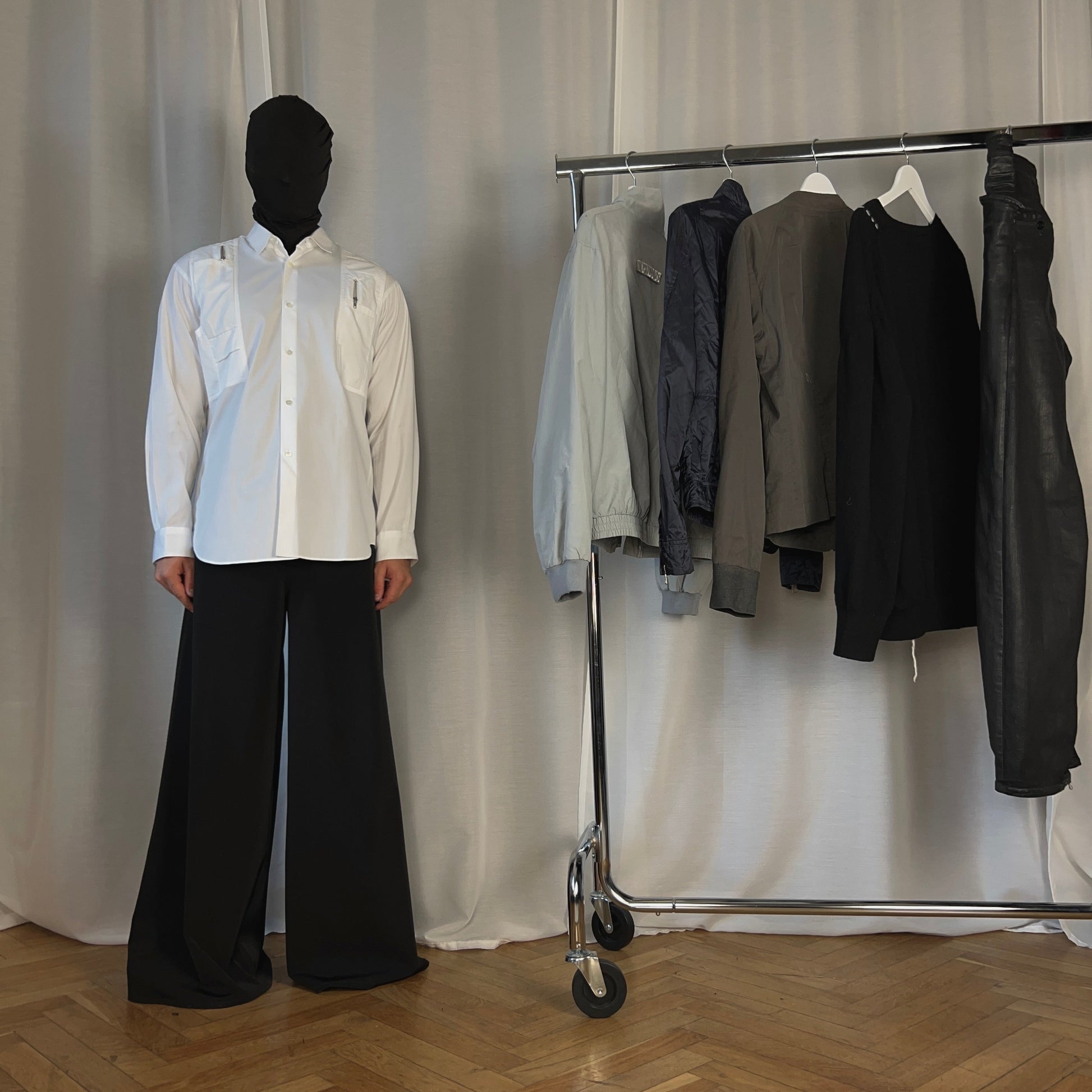 Button up shirt from the Fall Winter 2022 collection  of CDG sub line Comme des Garcons Shirt. Silver zip details at the chest and the upper back which are implemented in a multi pocket construction. Zips can be opened and serve as extra pockets. Sample tag inside which means that it has never been commercially produced in this iteration. Oversized cut.