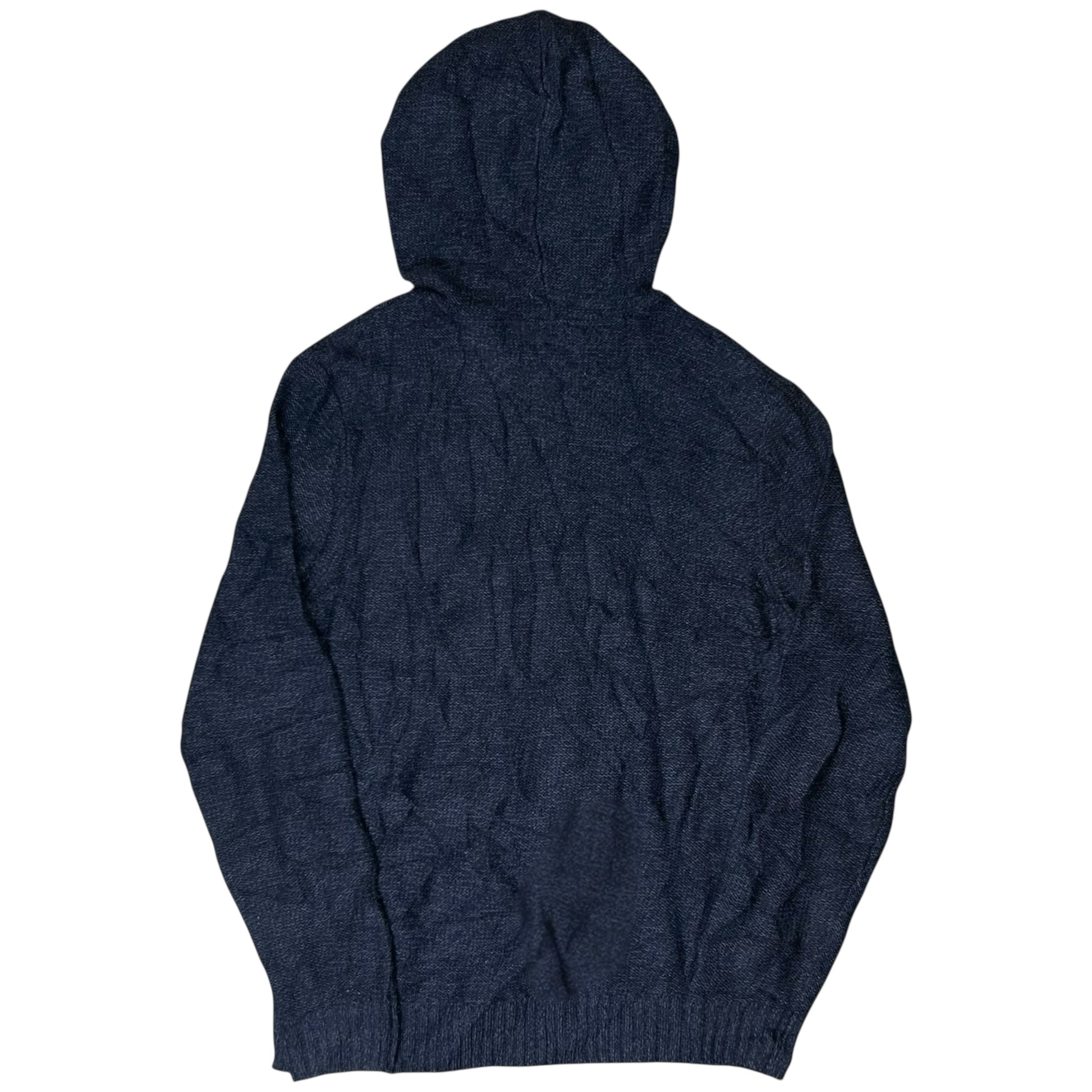 Hooded sweater of the CDG sub line Comme des Garcons Shirt. Tonal canvas finished drawstrings at the hood. Unique distorted texture within the material creating a distorted look. Made from a dry wool material in a muted dark blue. Regular cut.