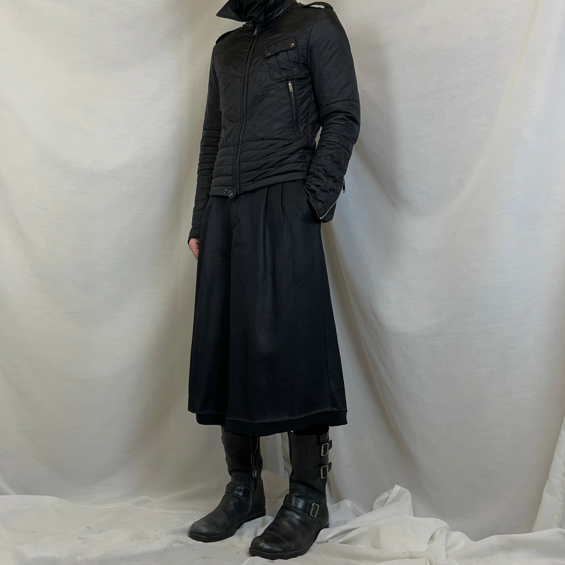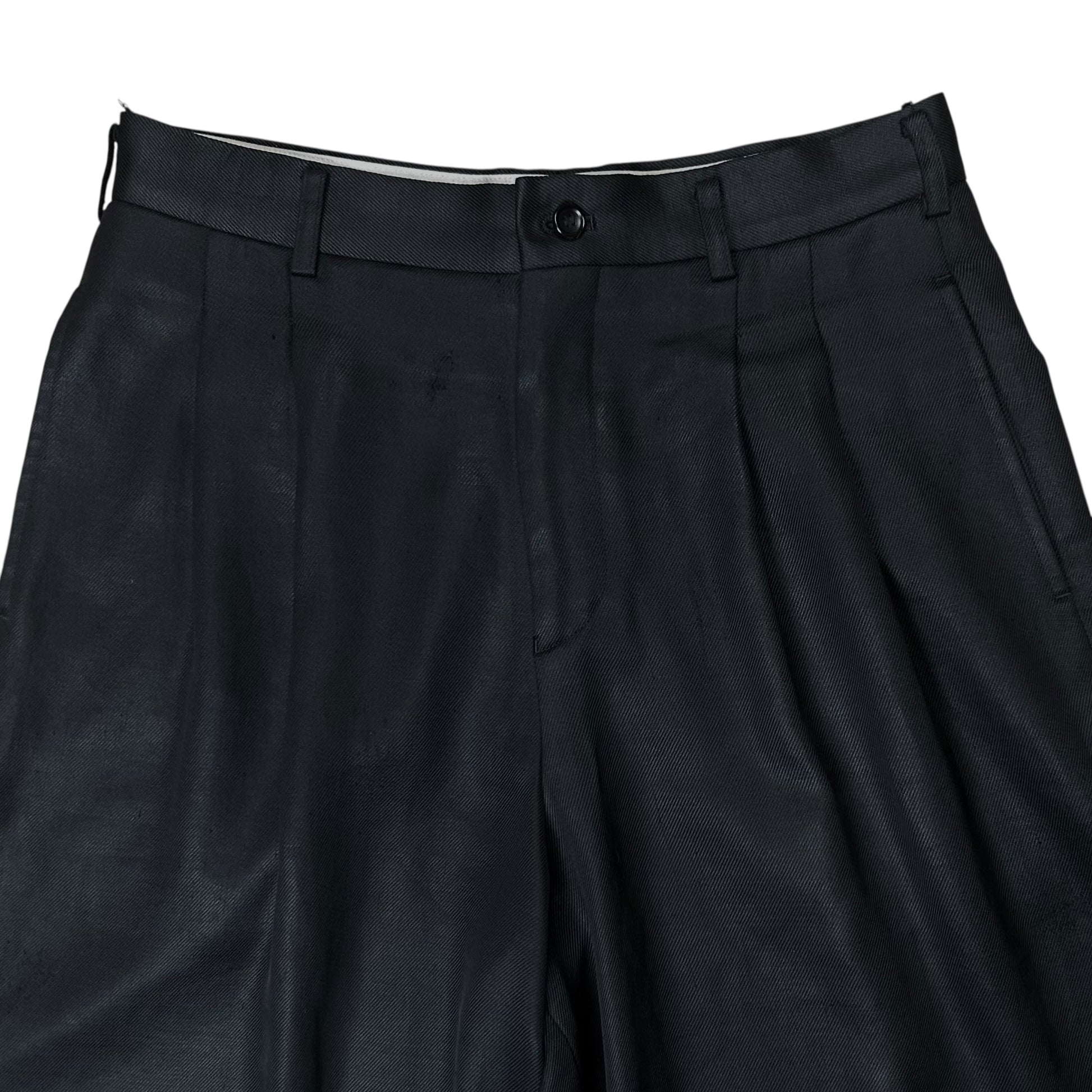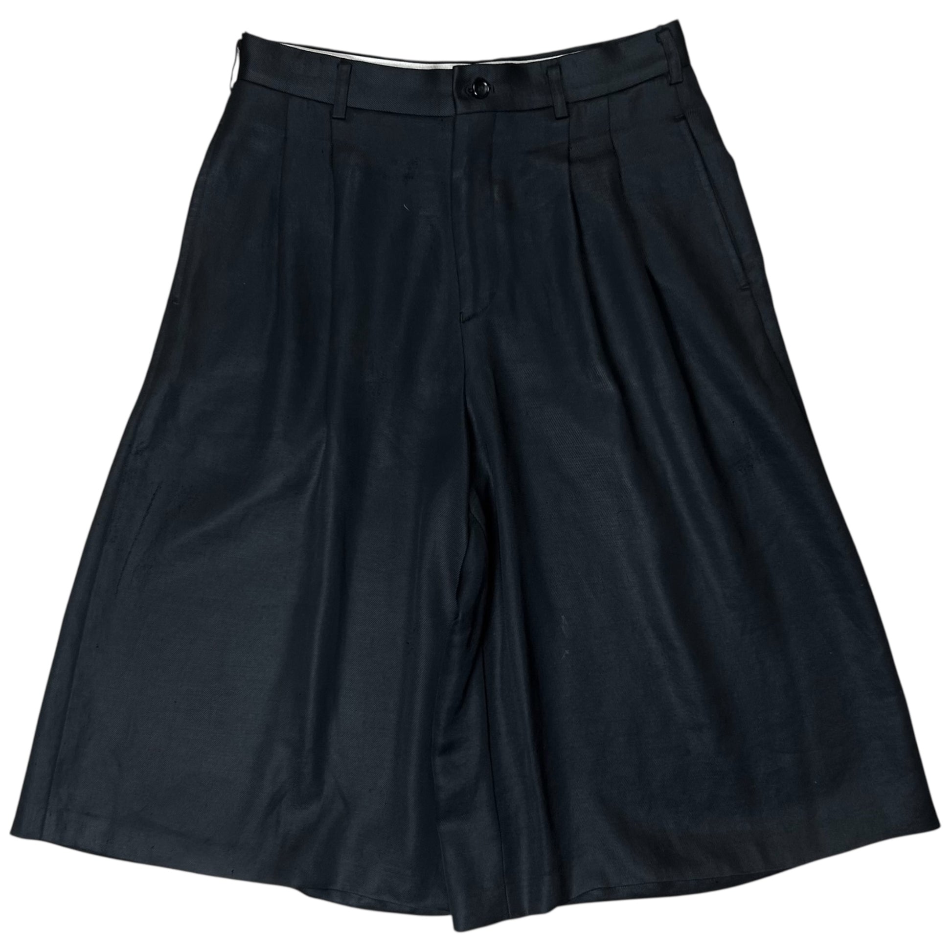 Short pants from the CDG subline Comme des Garcons Comme des Garcons. Classic construction with a concealed zip fly, asymmetric flap back pockets and double wasit pleats at both sides. Made from a smooth wool blend in black. Wide cut with an over knee length.