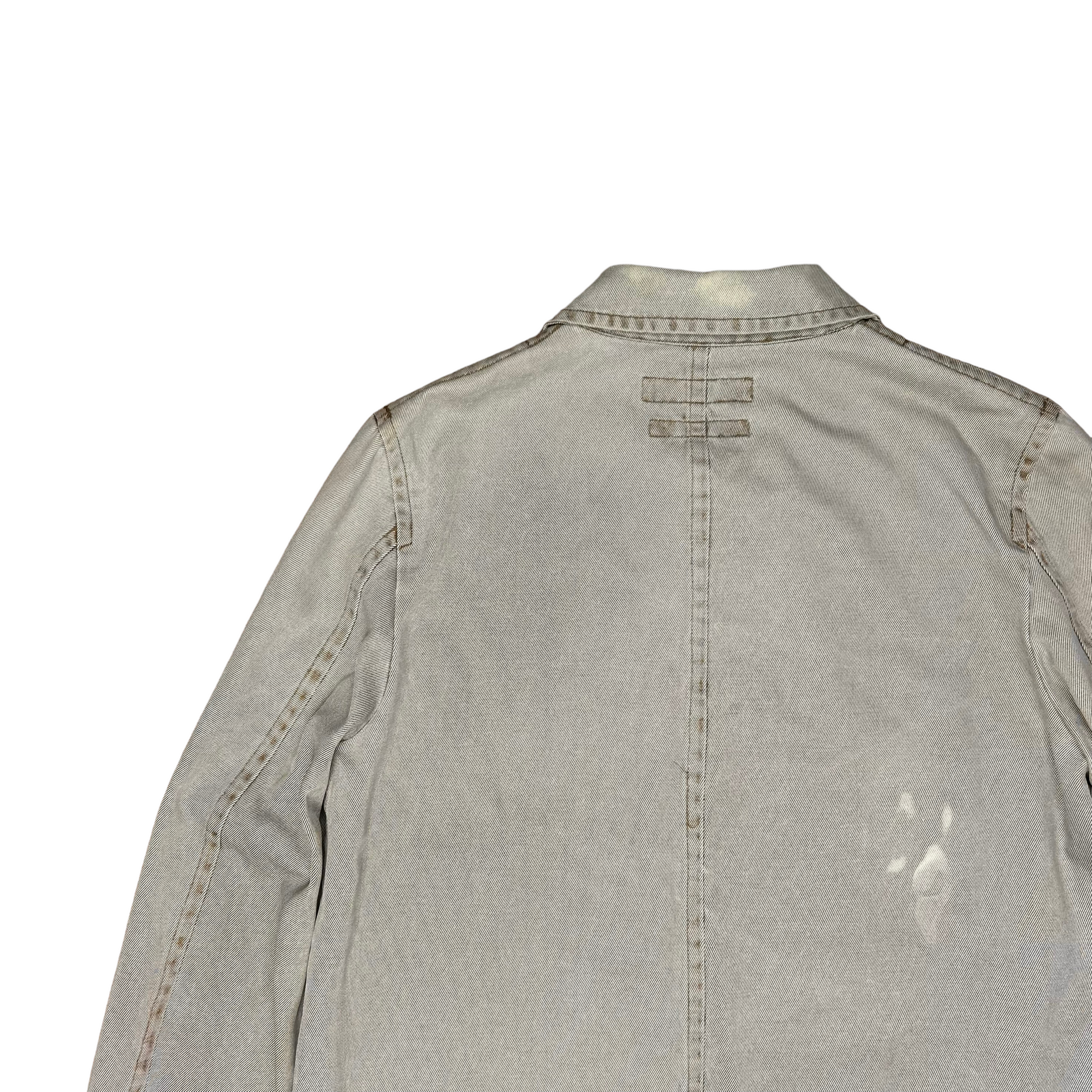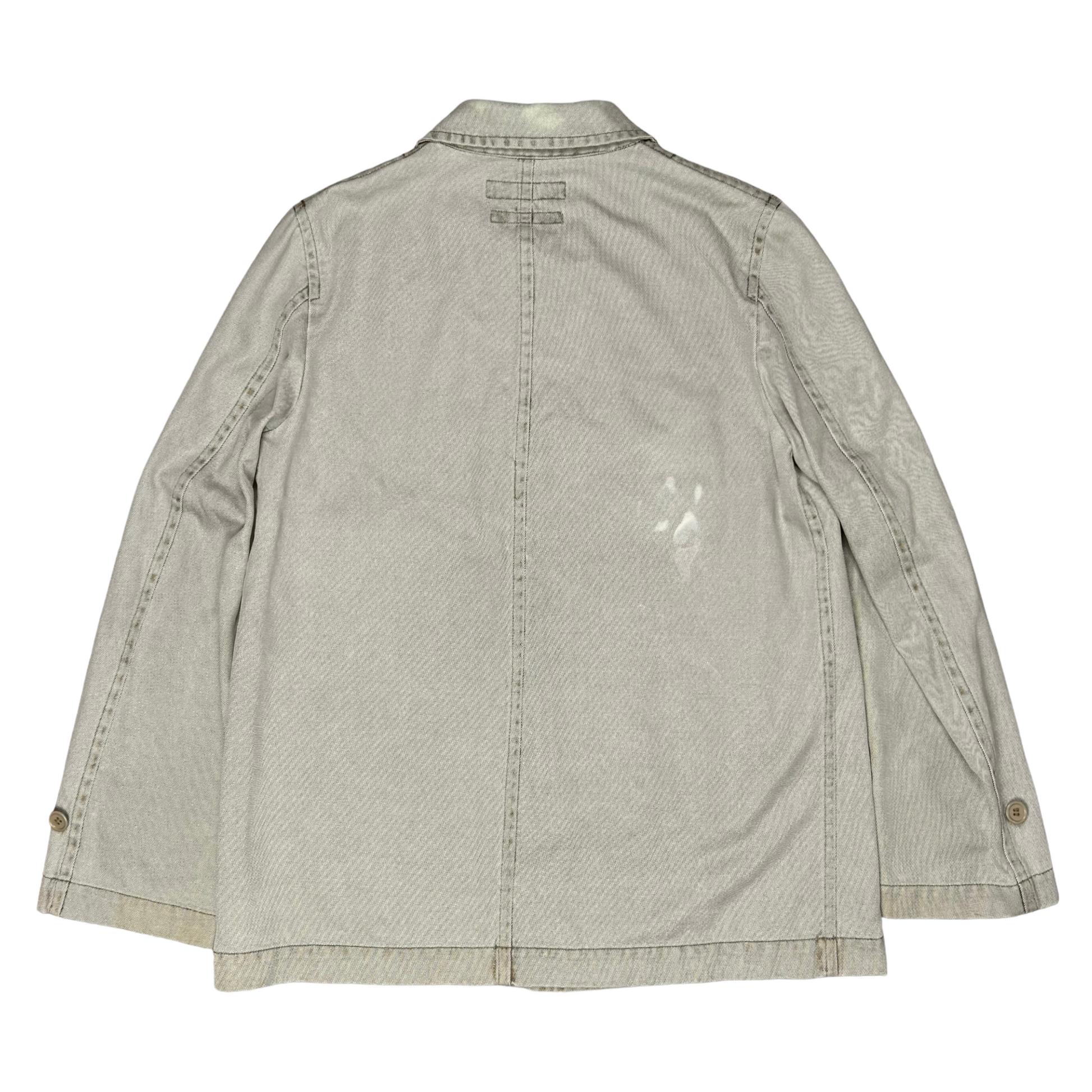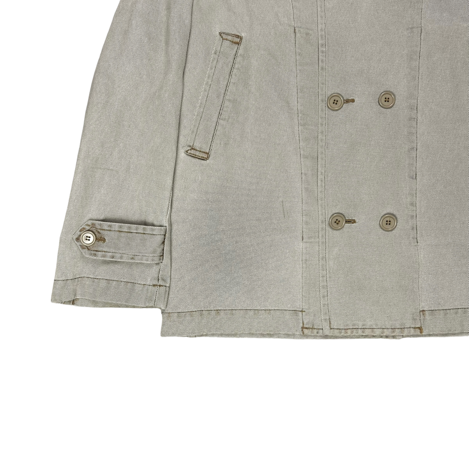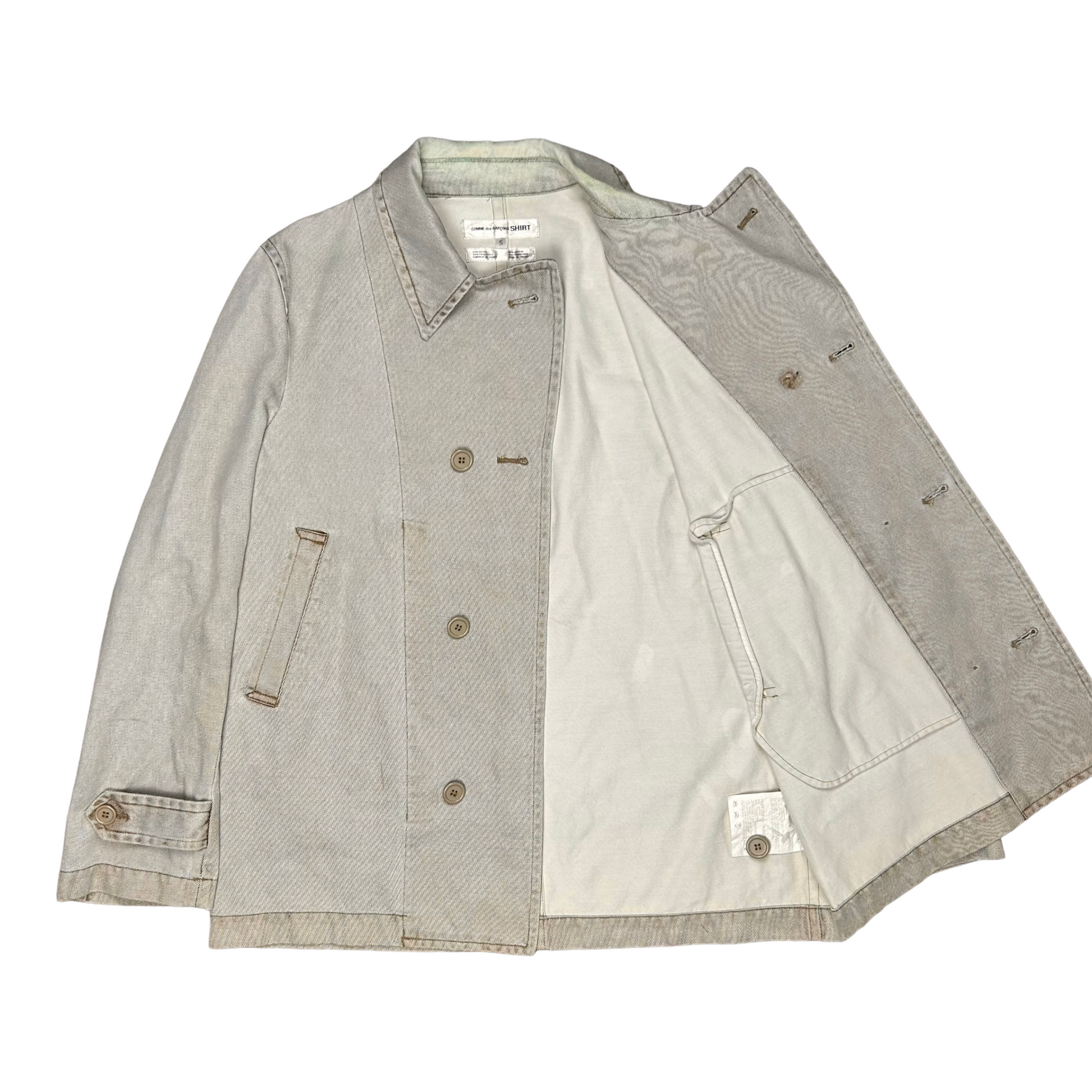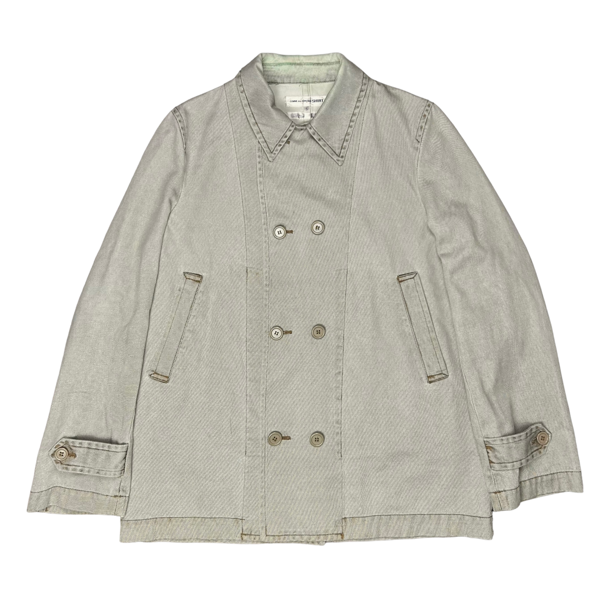 Rare light grey jacket from the CDG Sub line. Double breasted button construction which allows the collar to be worn in two ways. Unique placement of the slid front pockets. Strap details at the sleeves. Subtle contrast stitching. Made out of a cotton triacetat blend which makes the piece resistant to wrinkles. Retailed for around 500€.