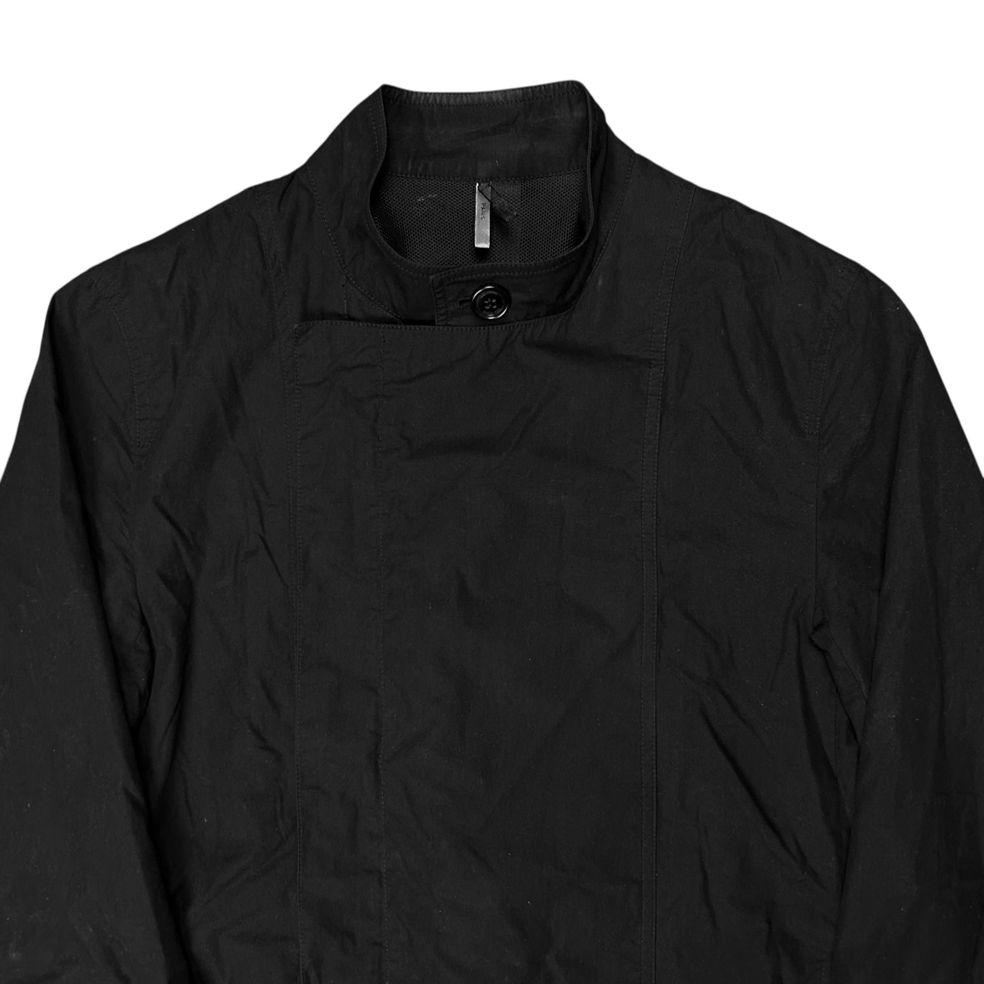 Blouson jacket from the Dior Homme Spring Summer 2010 collection when Kris Van Assche was creative director. Two way Lampo zip closure with the signature rectangle Dior pullers which allow different styling options. Additional silver snap button closure under the front flap. Extra layer underneath with black button closure. Made from a black cotton material. Regular cut.