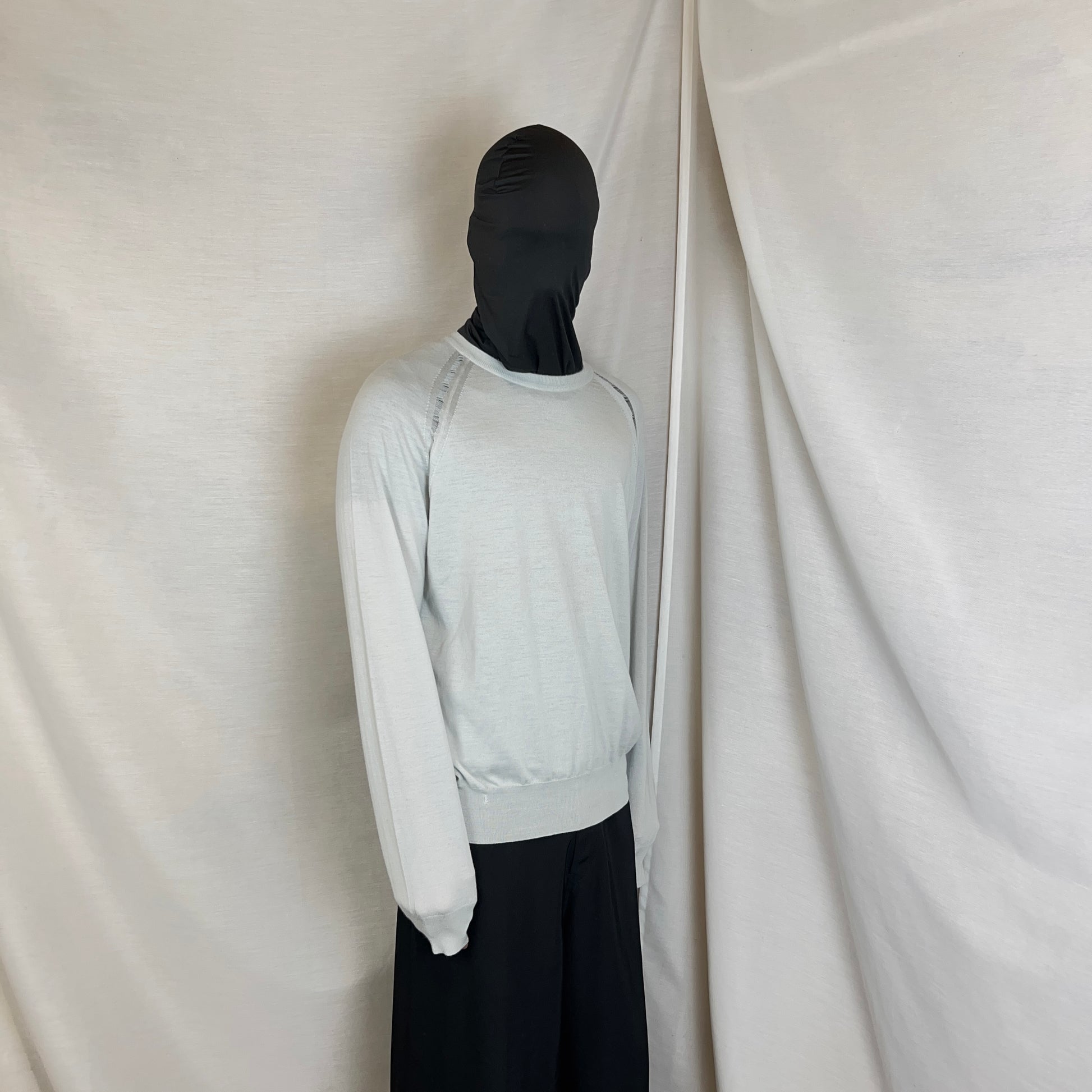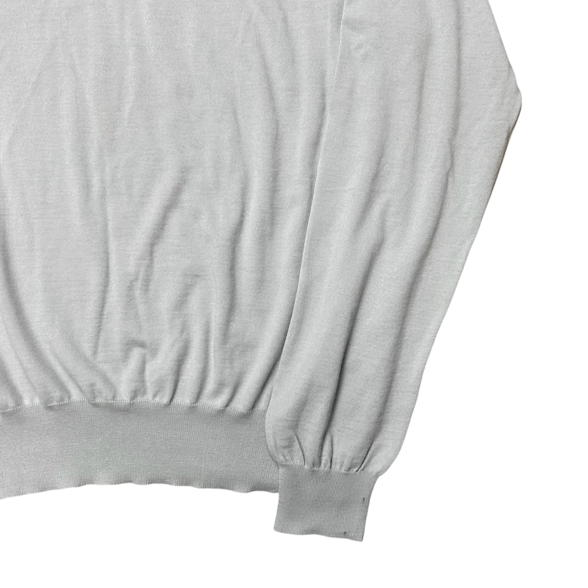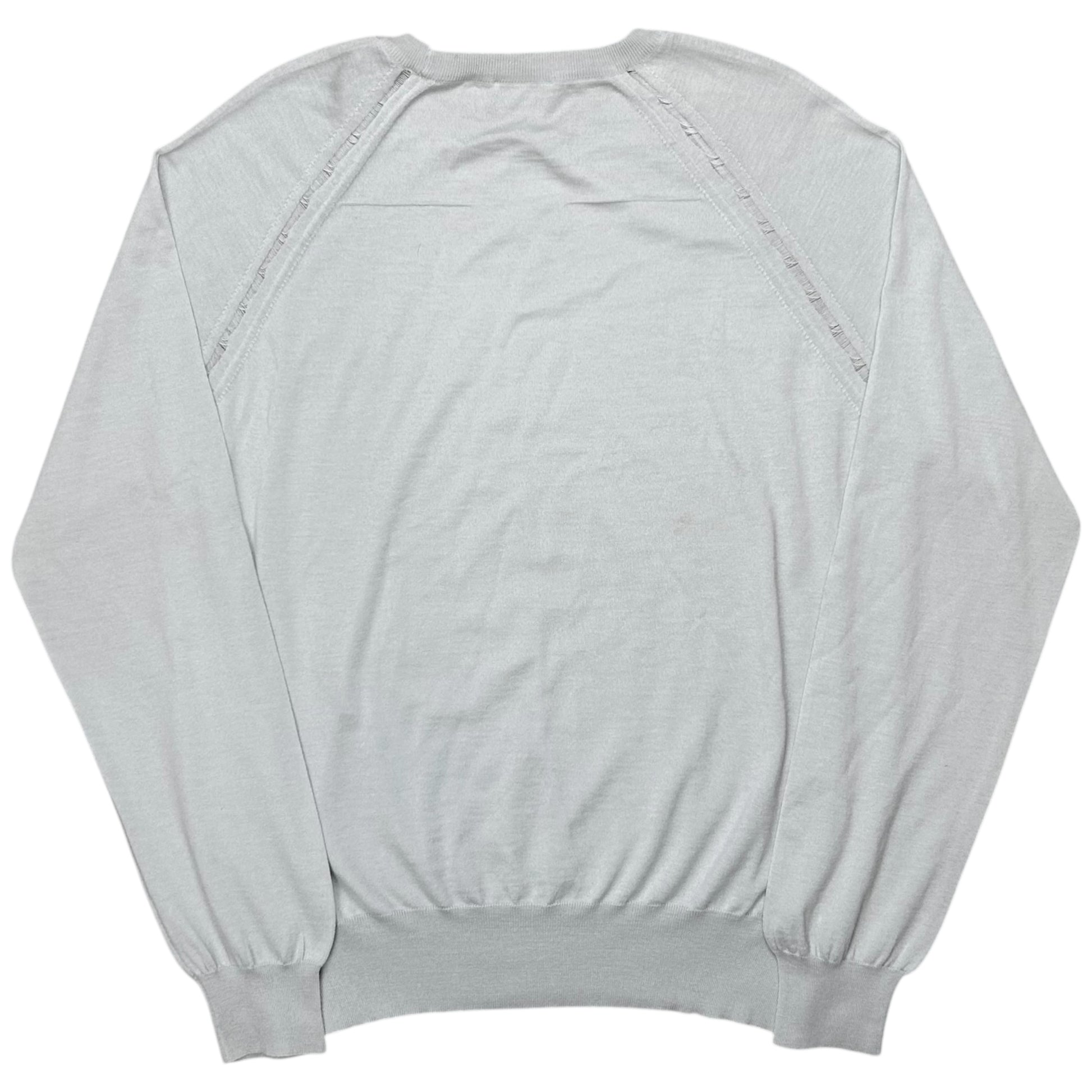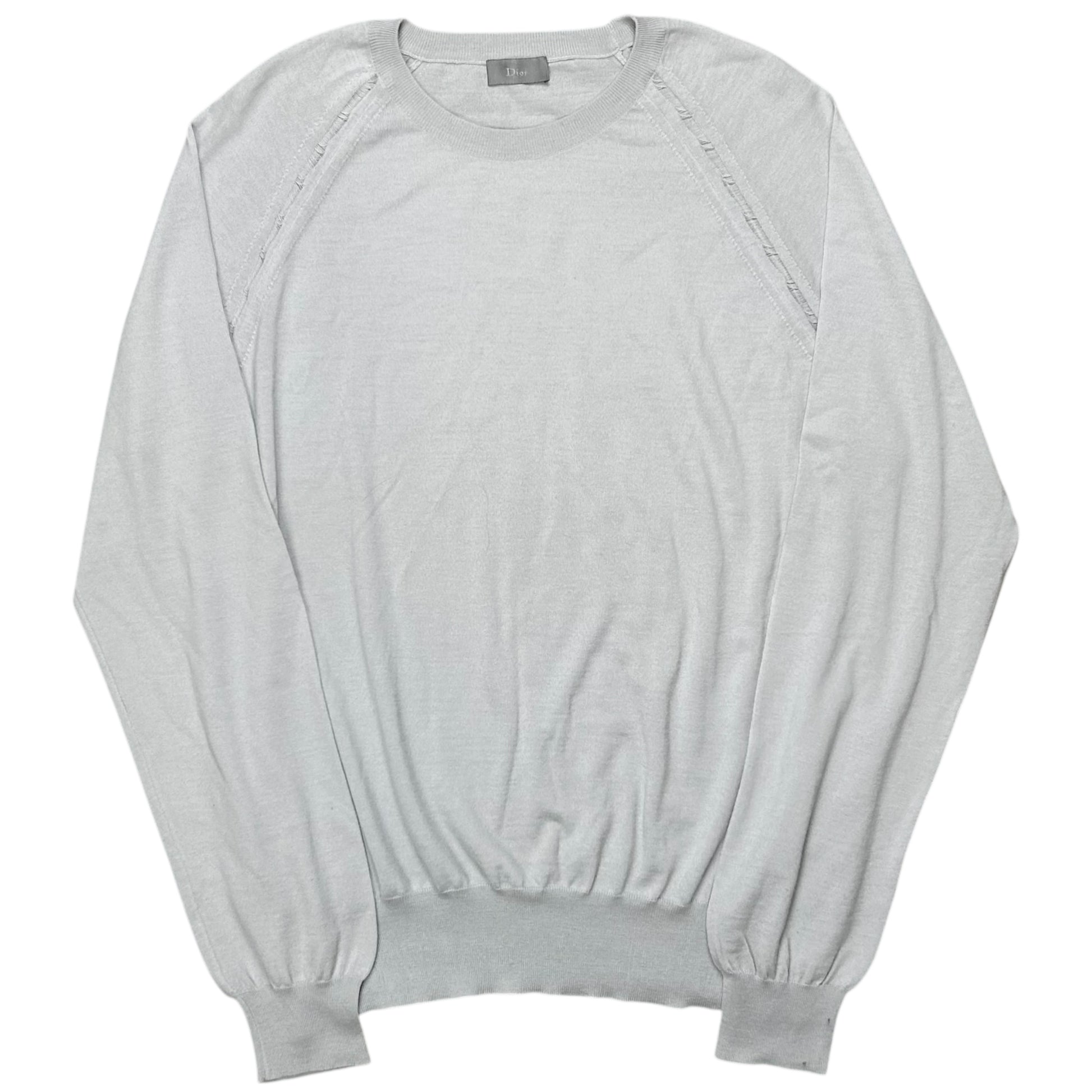 Jumper from the Dior Homme Fall Winter 2009 collection back when Kris Van Assche was designing for the brand. Distressing with visible open seam at the hems of the collar and shoulders. Signature design which was first implemented by Hedi Silmane and was used a signature throughout the seasons. Made from a light grey wool material with a slight shade of light blue. Boxy cut.