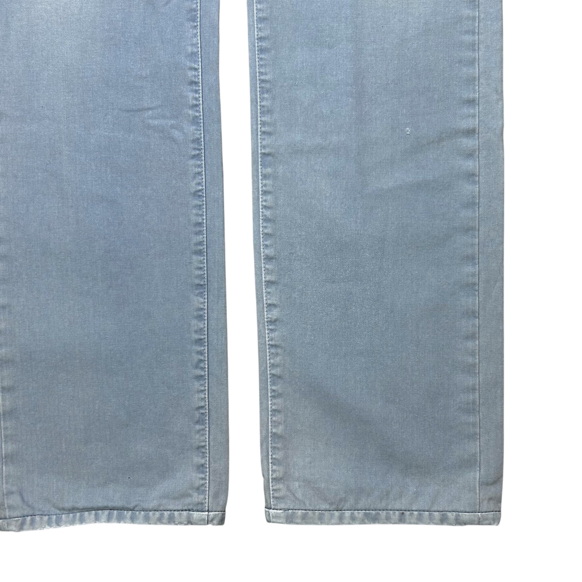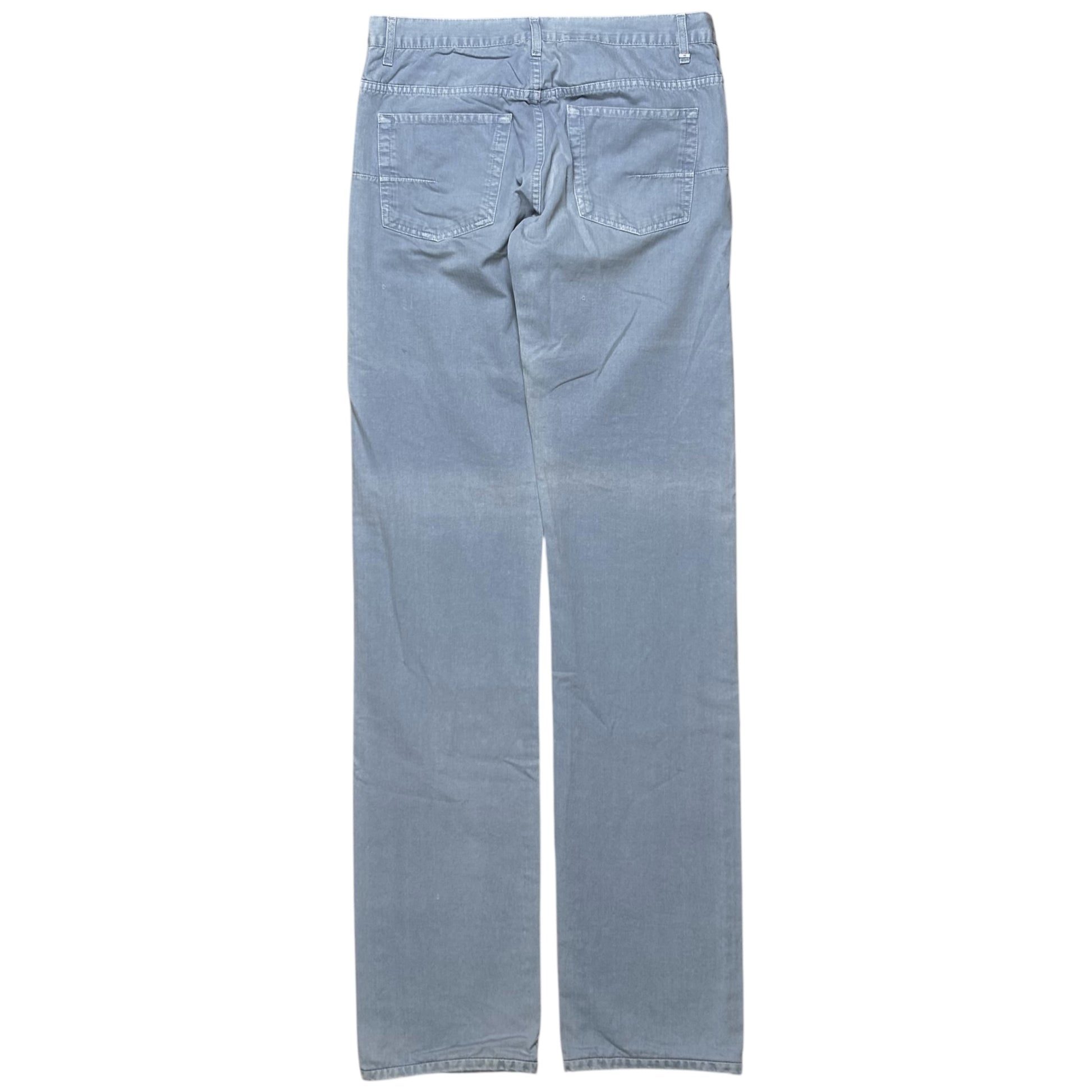 Denim pants from the Dior Homme Spring Summer 2013 collection. Unique heavy wash with bright fading over a saturated blue creating this ice fade. Silver eyelet hardware details at the waist. Signature silver branded hardware detail at the belt loop as well as the scar stitch on the back pocket. Made from a dyed light blue cotton and elastane fabric. Slim cut.