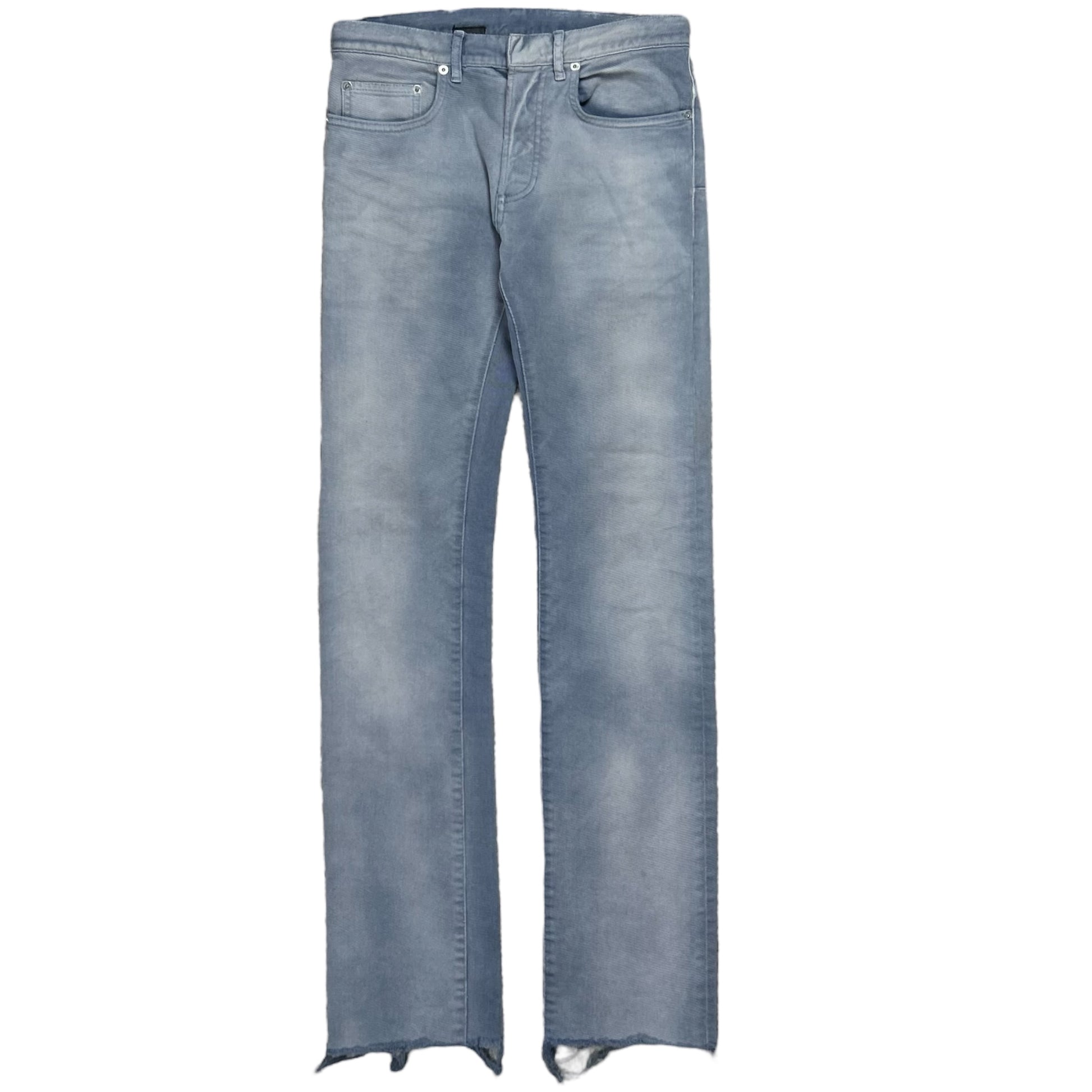 Denim pants from the Dior Homme Spring Summer 2013 collection. Unique heavy wash with bright fading over a saturated blue creating this ice fade. Silver eyelet hardware details at the waist. Signature silver branded hardware detail at the belt loop as well as the scar stitch on the back pocket. Made from a treated cotton and elastane fabric. Skinny cut with a raw hem.