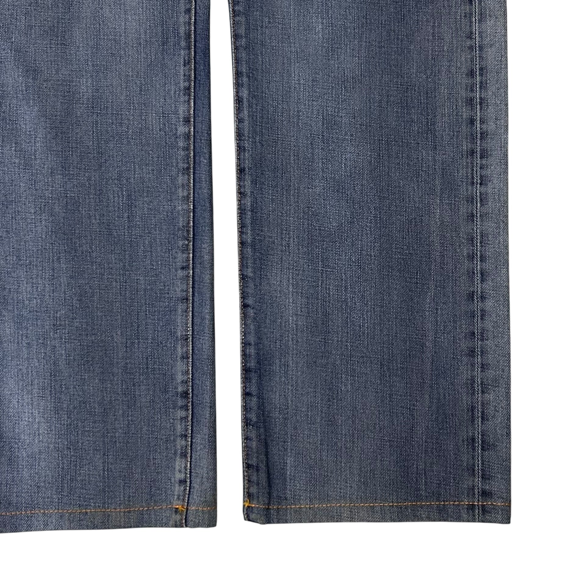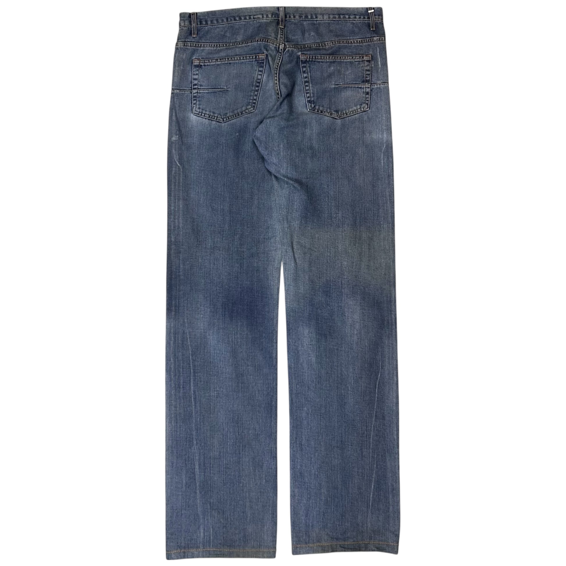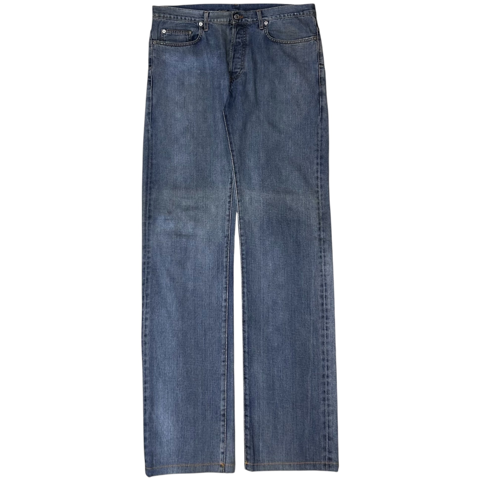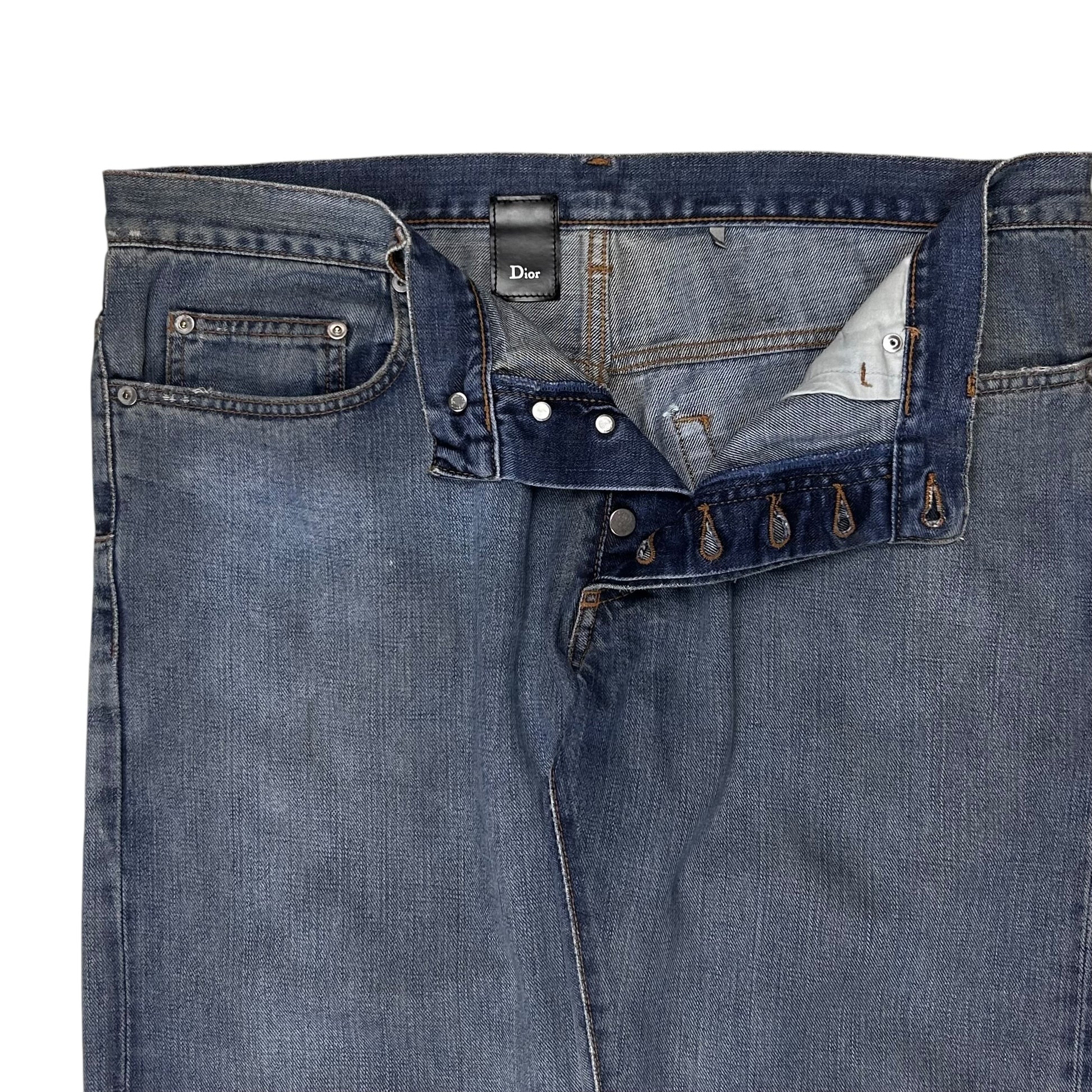 Denim pants from the Dior Homme Spring Summer 2009 collection back when Hedi Kris Van Assche was creative director. Silver eyelet hardware details at the waist. Signature silver branded hardware detail at the belt loop as well as the scar stitch on the back pocket. Made from a washed light blue cotton material with wet wax with silver finishes. Straight cut.
