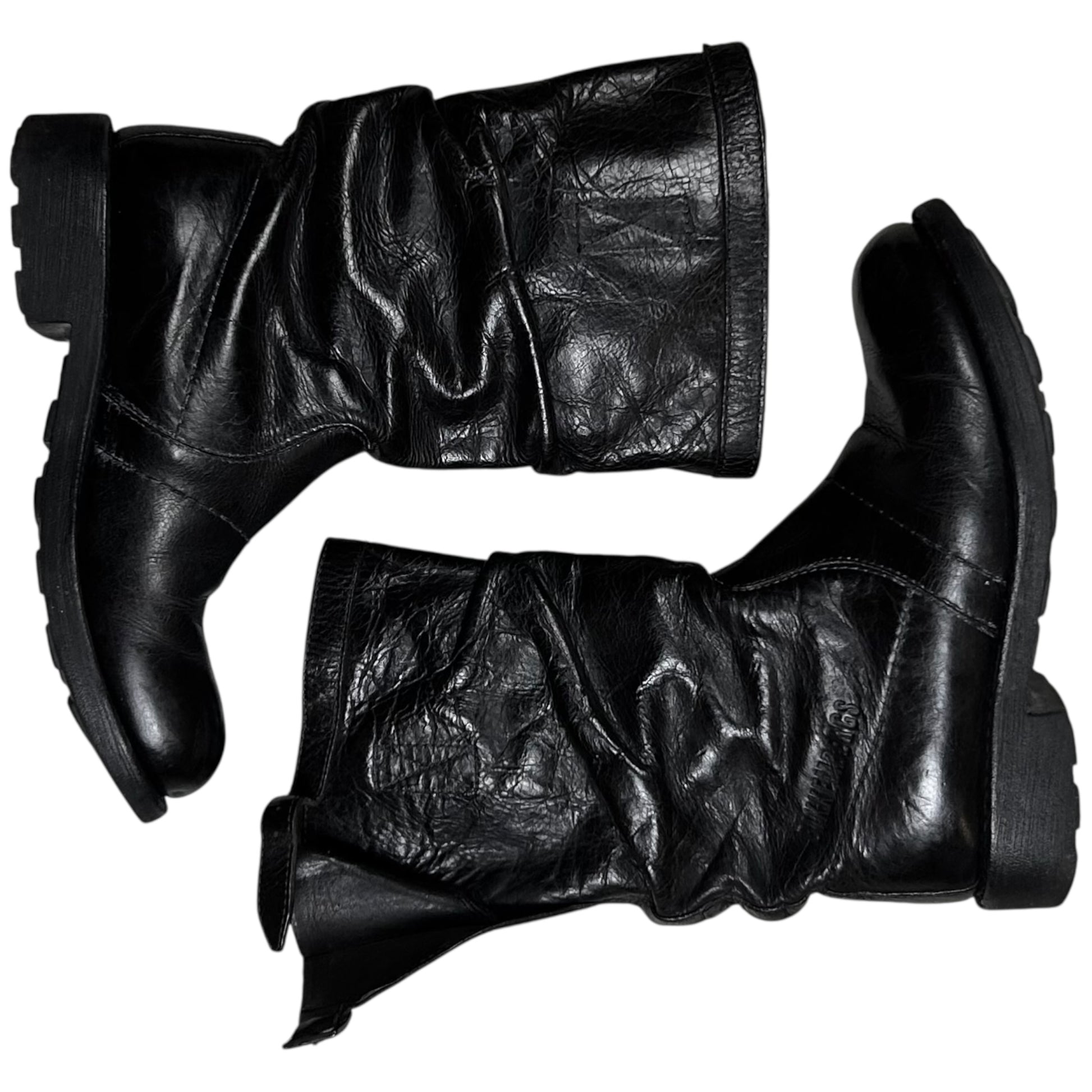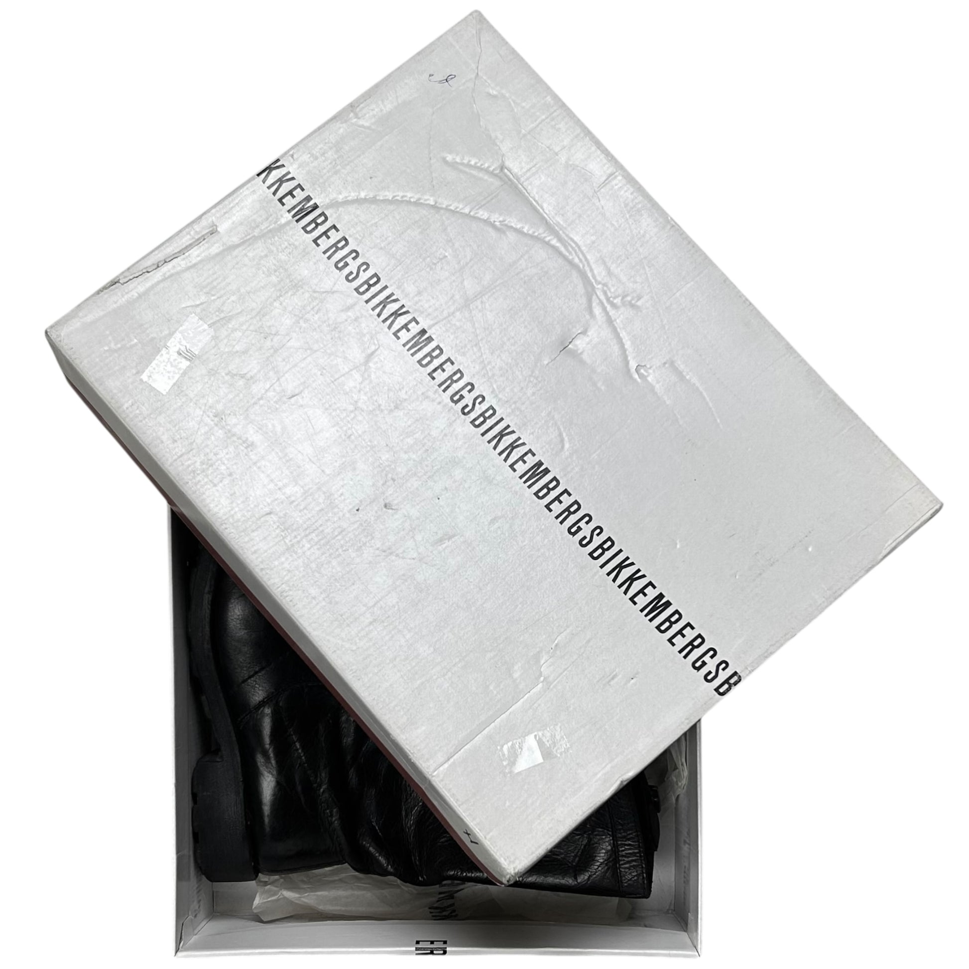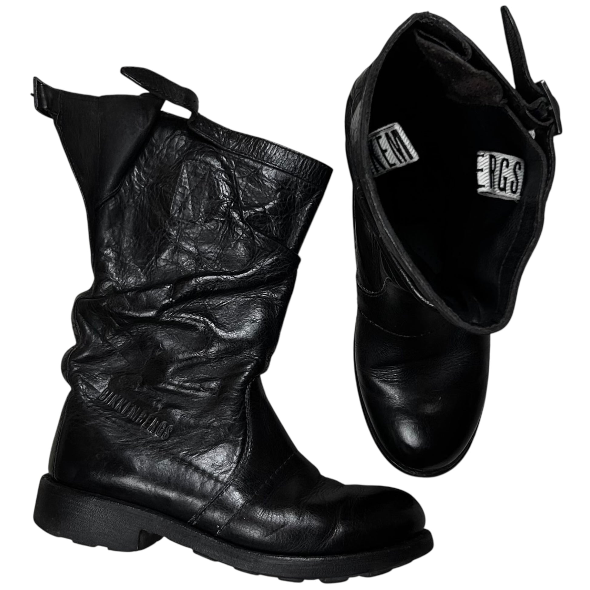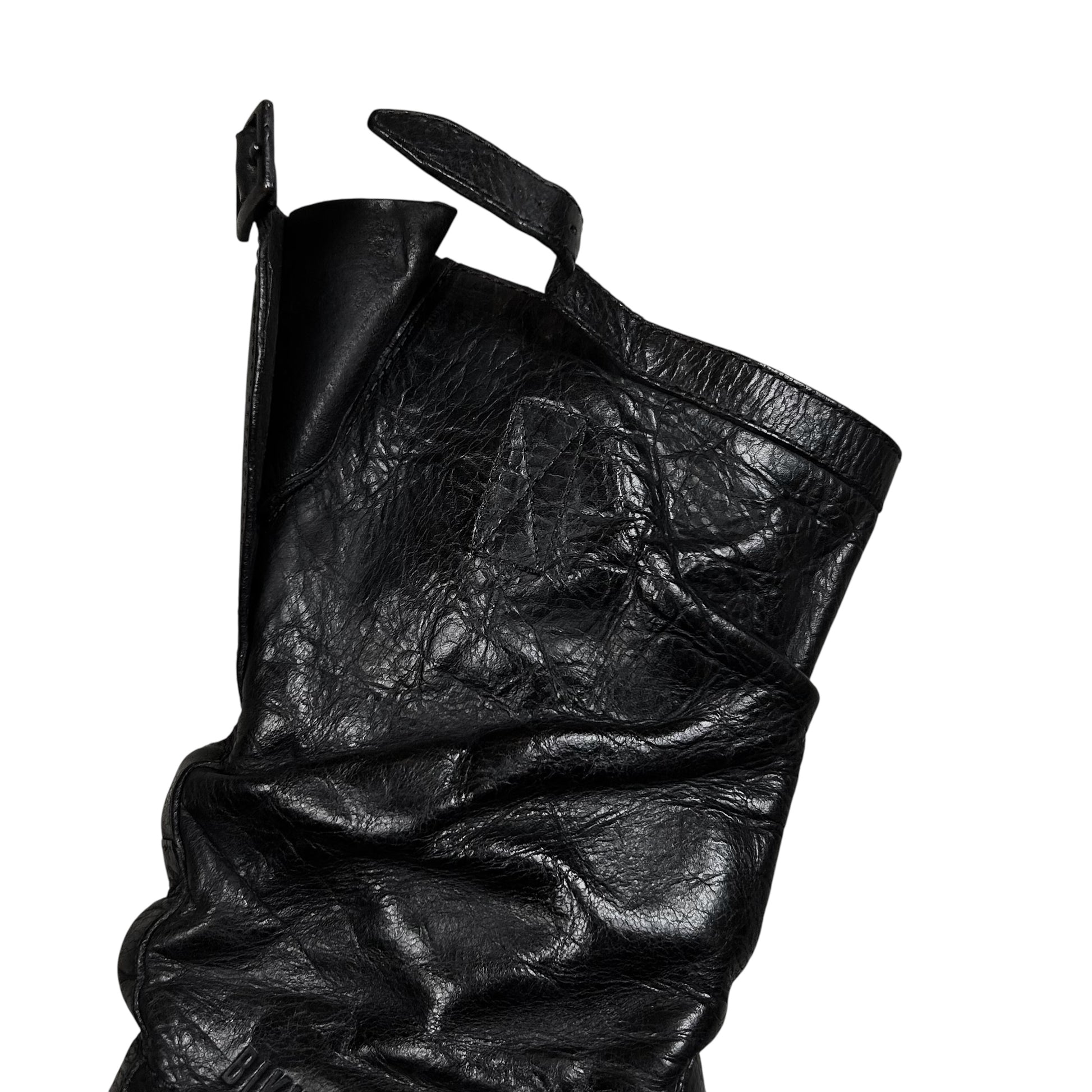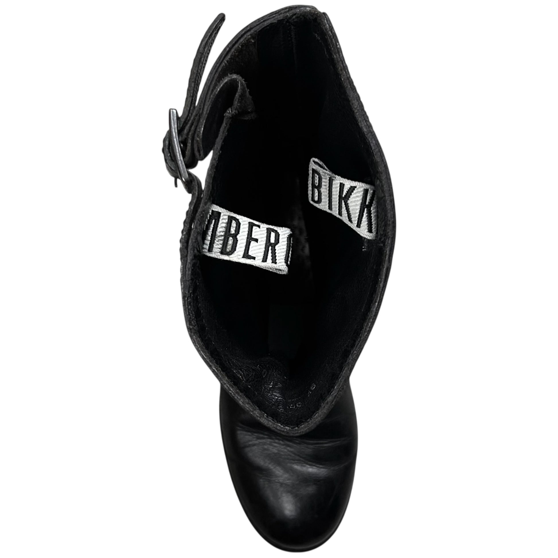 Vintage high top boots from Dirk Bikkembergs. Interesting panel construction with a debossed logo next to the reinforced seams. Strap detailing at the shaft with silver buckle hardware. Rounded toe shape with a contrast grey sole. Made from black leather with a shiny waxed treatment.
