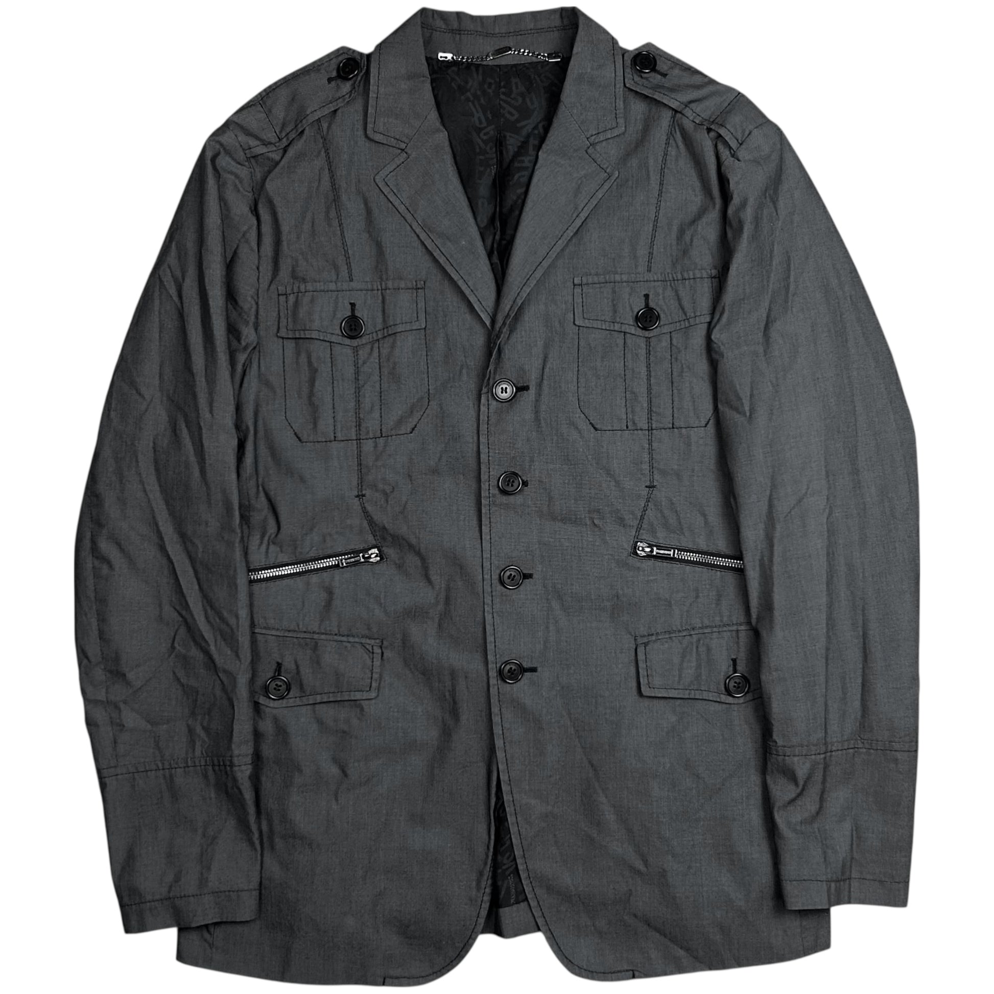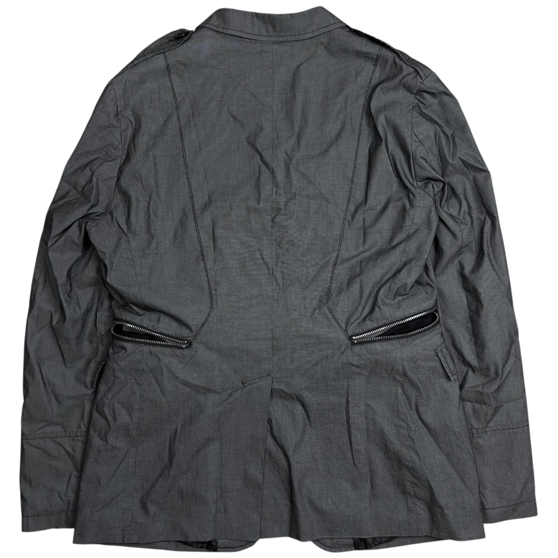 Field jacket from Dirk Bikkembergs. Silver zip at the both sides going from the front to the back. Multiple cargo utility pockets at the front with button closure. Military inspired straps at the shoulder. Interesting paneling with visble stitching. Made from a textured grey cotton blend. Regular cut.
