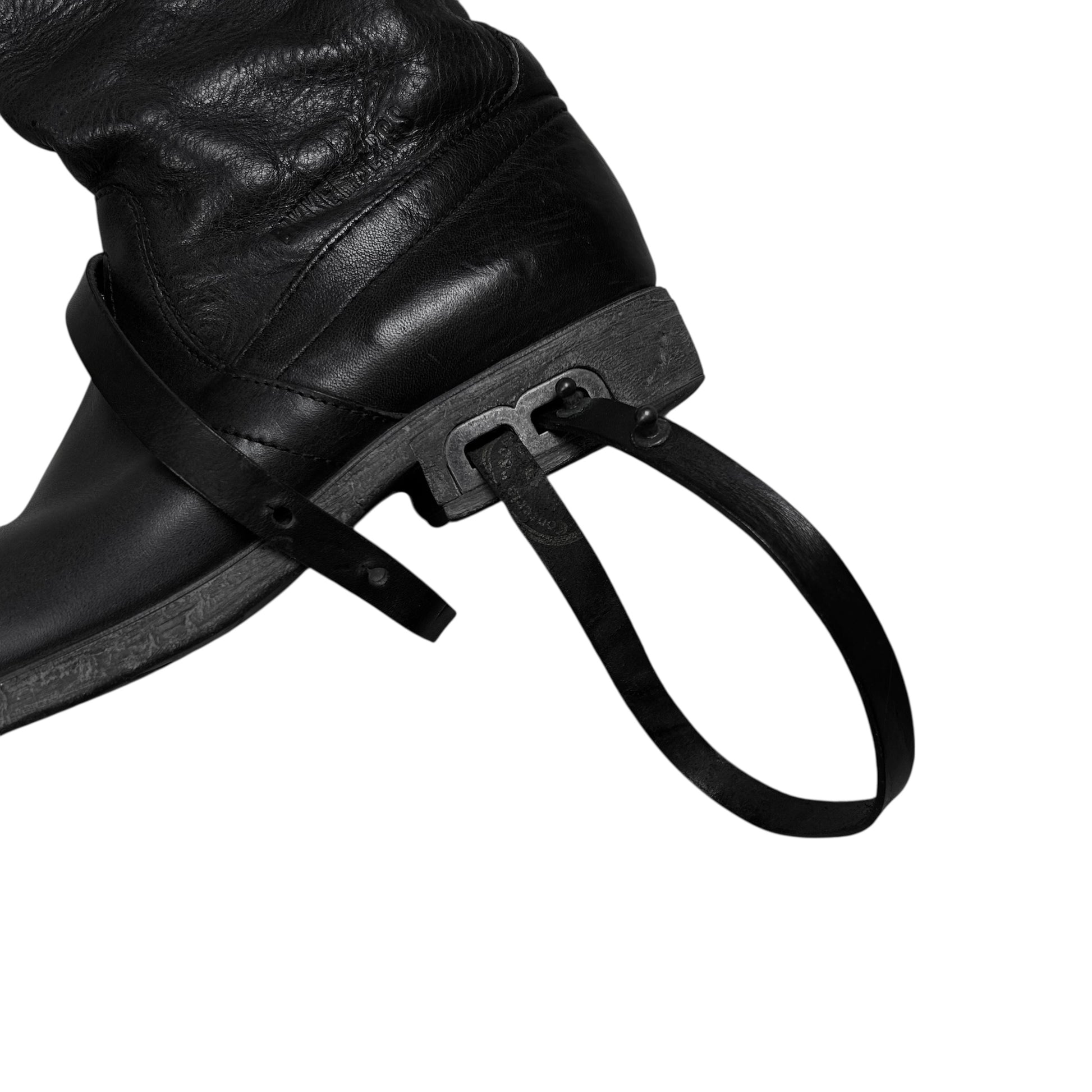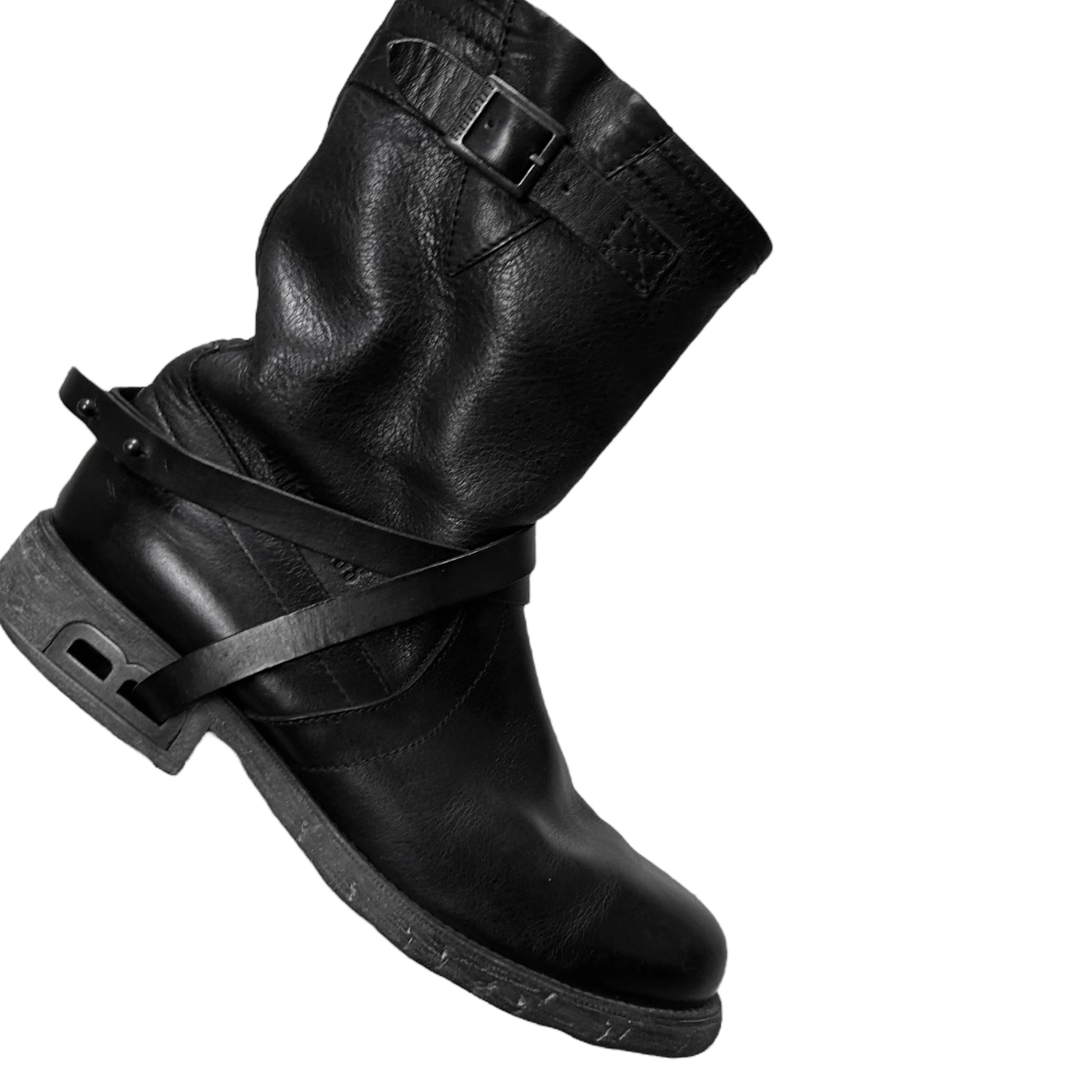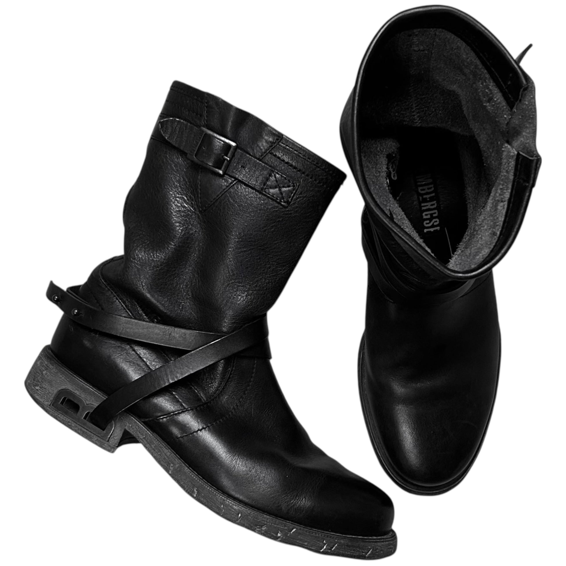 Vintage combat boots from Dirk Bikkembergs. Lace construction which goes through the signature B cut out heel. Further strap at the wide shaft with silver hardware buckle fastening. Zip at the side with branded puller. Rounded toe box. Made from a soft faded black leather.