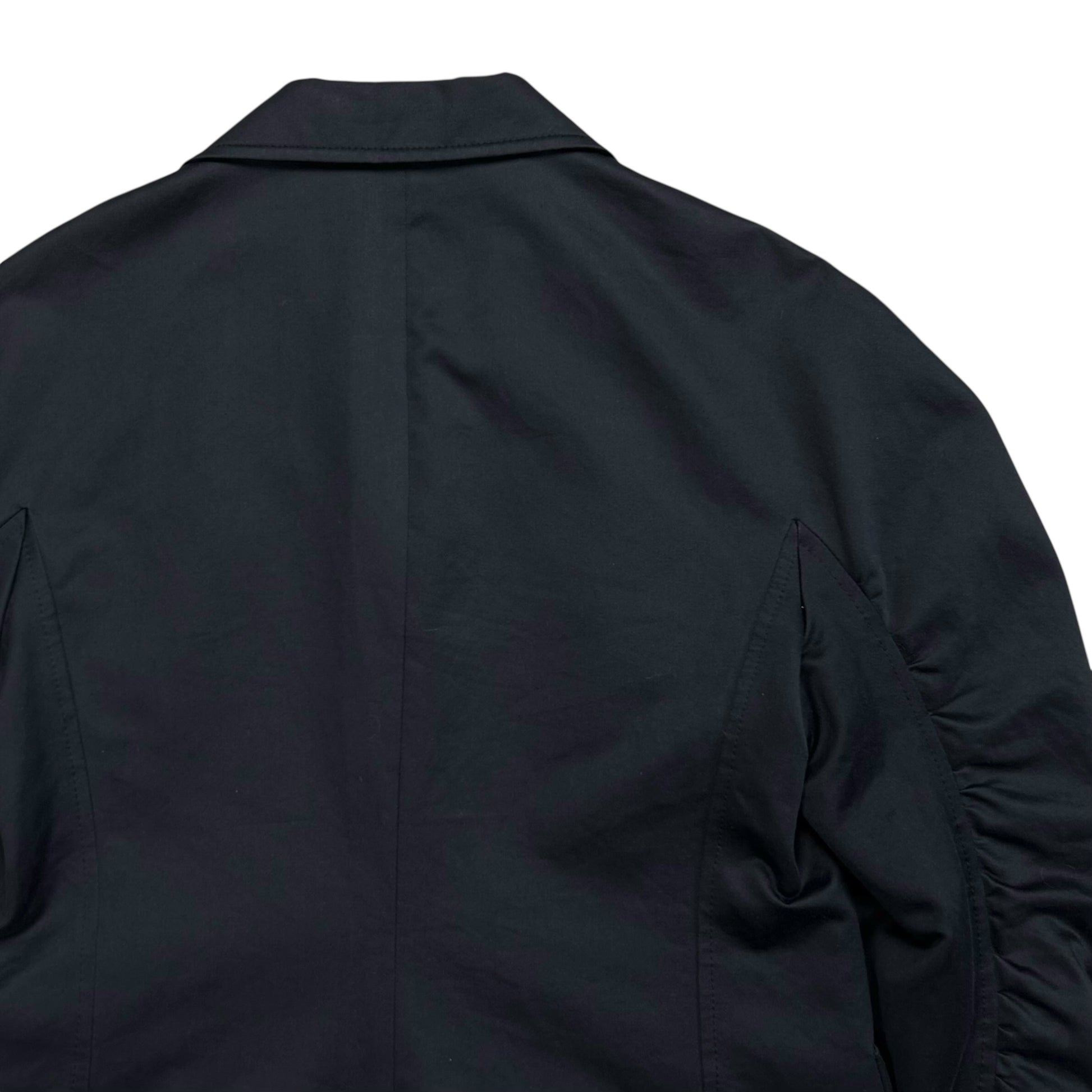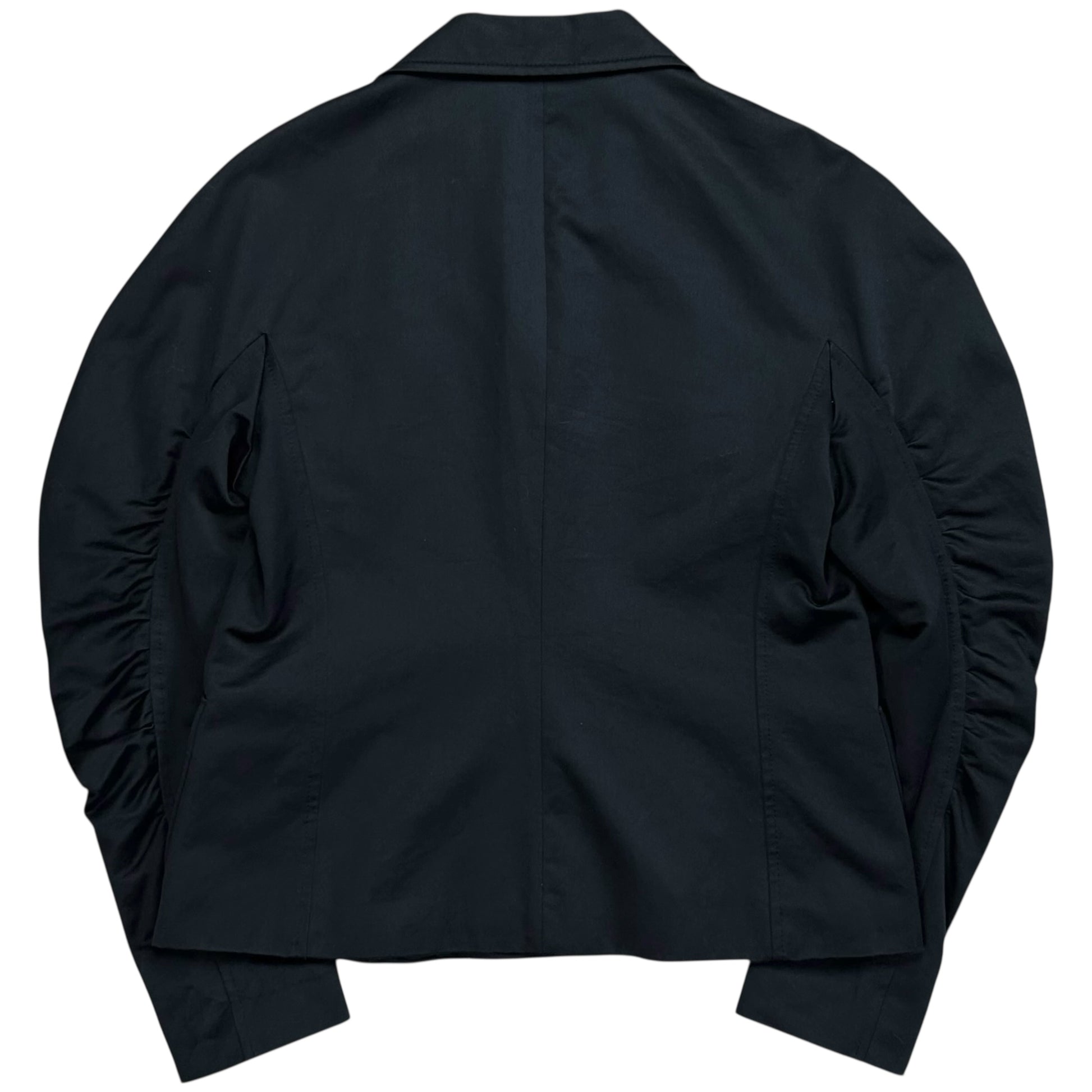 Raglan blazer jacket from the Dries Van Noten Fall Winter 2018 collection. Interesting ruched o-o-shape arms creating a distorted stacked effect. Tonal button closure with a wide notched lapel collar. Made from a dark blue cotton twill fabric. Cropped and boxy cut with elongated a sleeves. Retailed for around 800€.