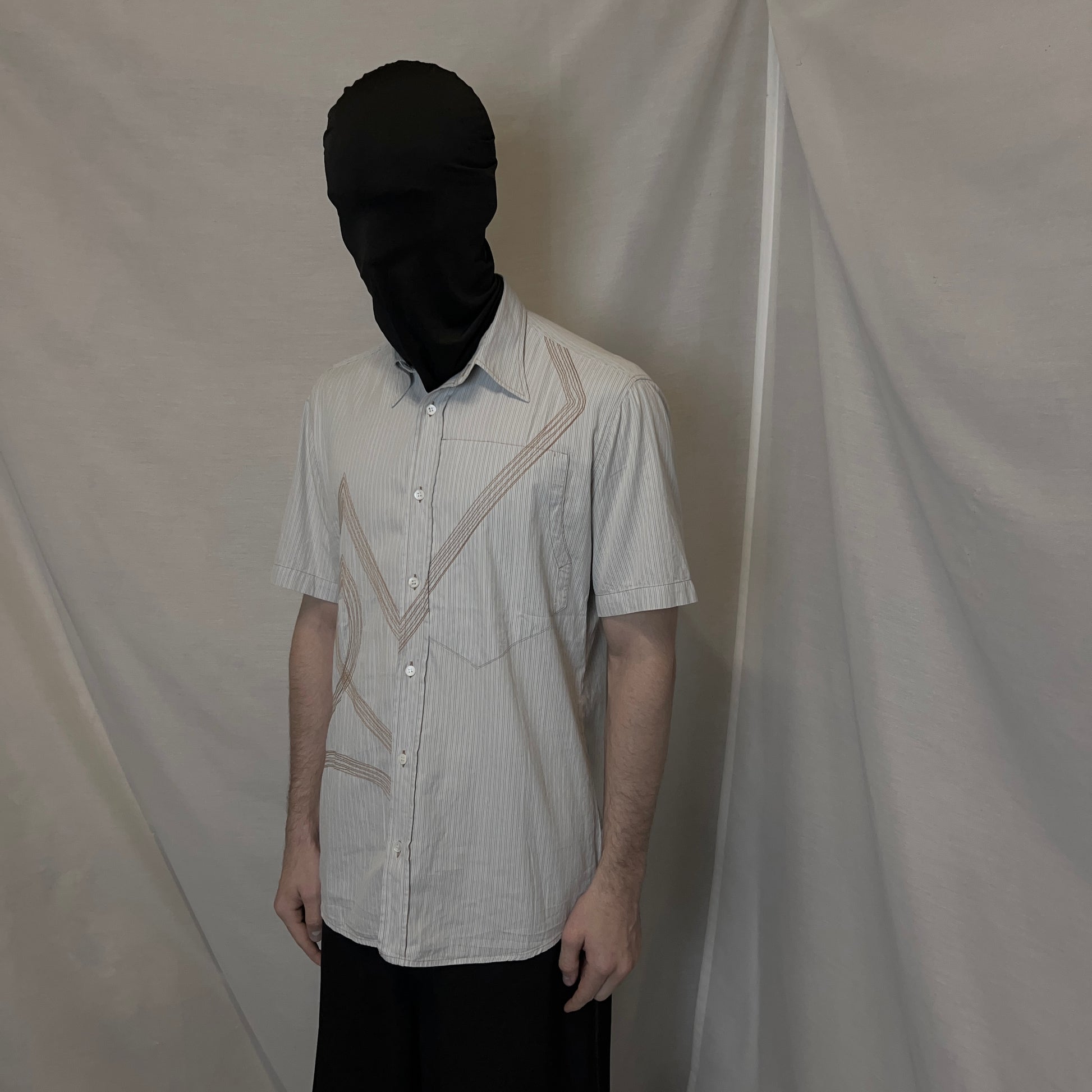 Vintage bowling shirt from Dries Van Noten. Contrast orange embroidery stitching throughout the front in abstract lines. Interesting exaggerated patch pocket at the shirt. Button closure with a pointy collar. Made from a cotton poplin fabric with a striped texture consisting of blue white and orange. Regular cut.