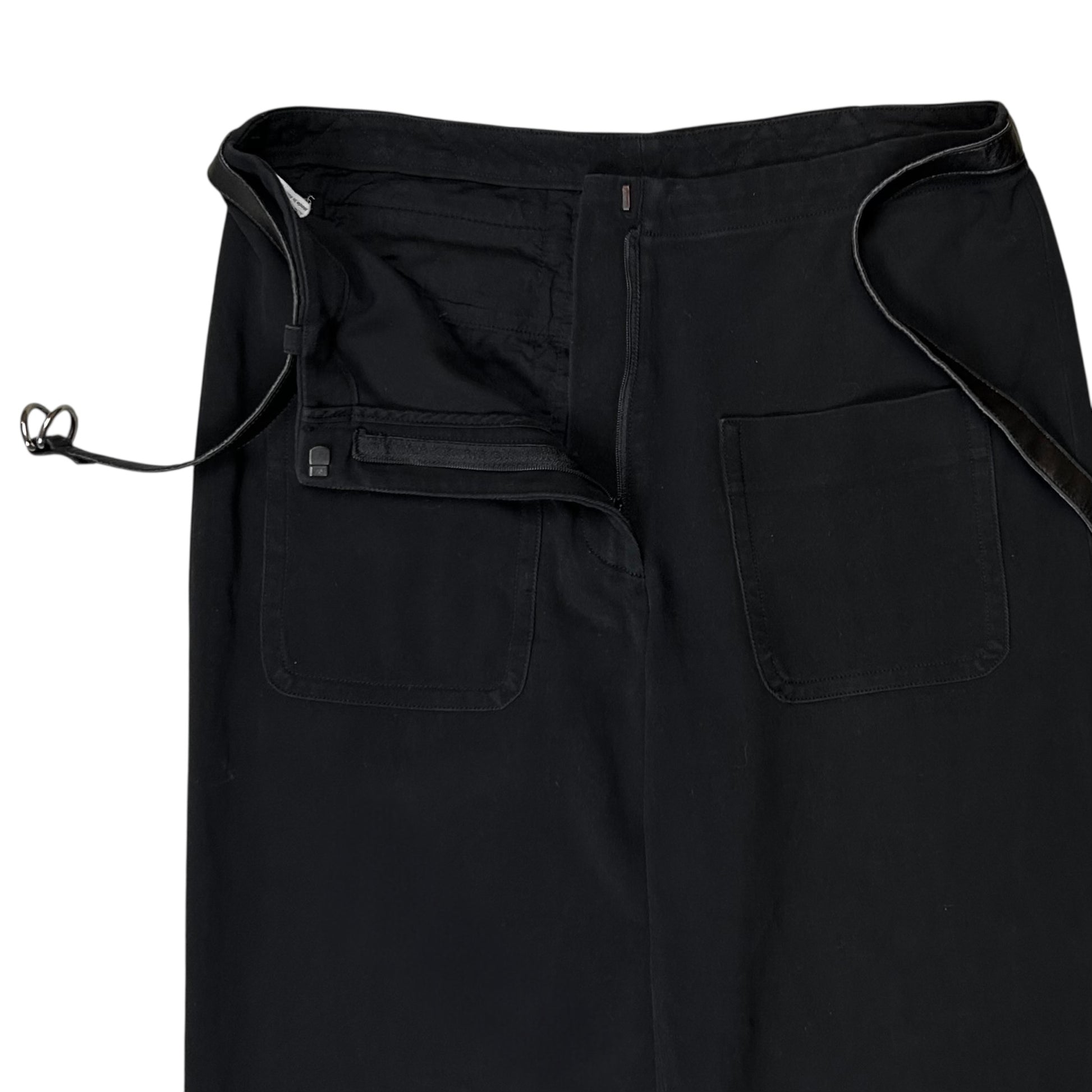 Vintage pants from Dries Van Noten. Implemented leather belt with silver double d-ring hardware closure to adjust the waist width. Front panel pockets around the fly. Concealed tonal zip closure at the hook fly. Made from a faded black cotton material. Straight cut.