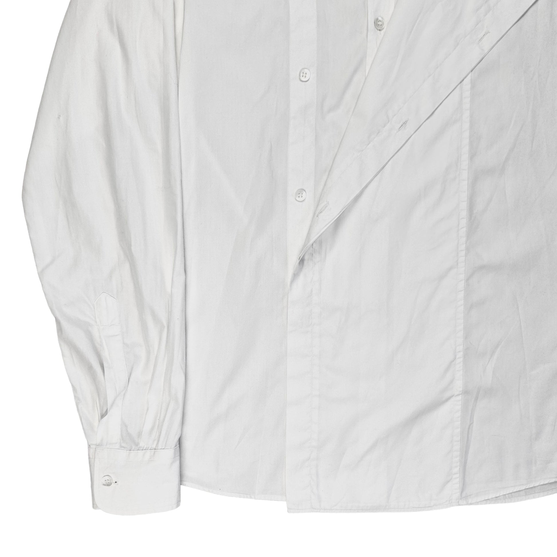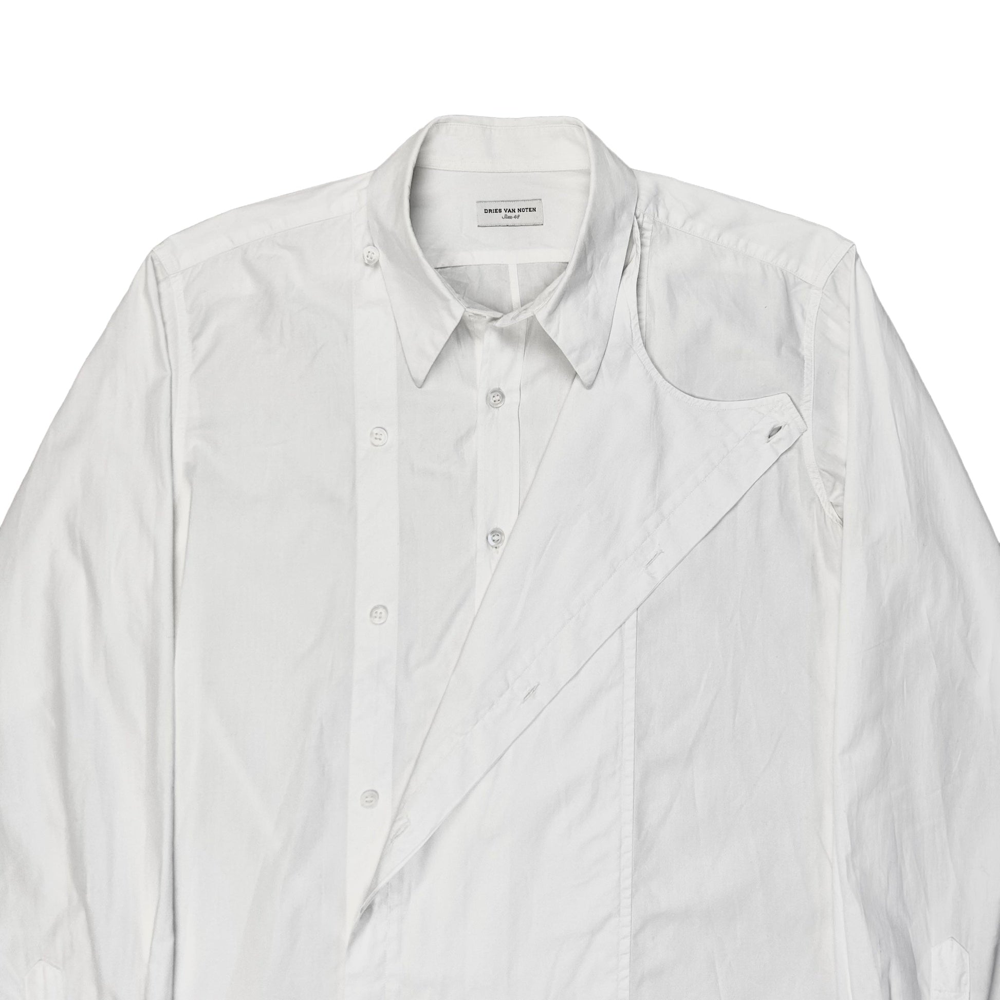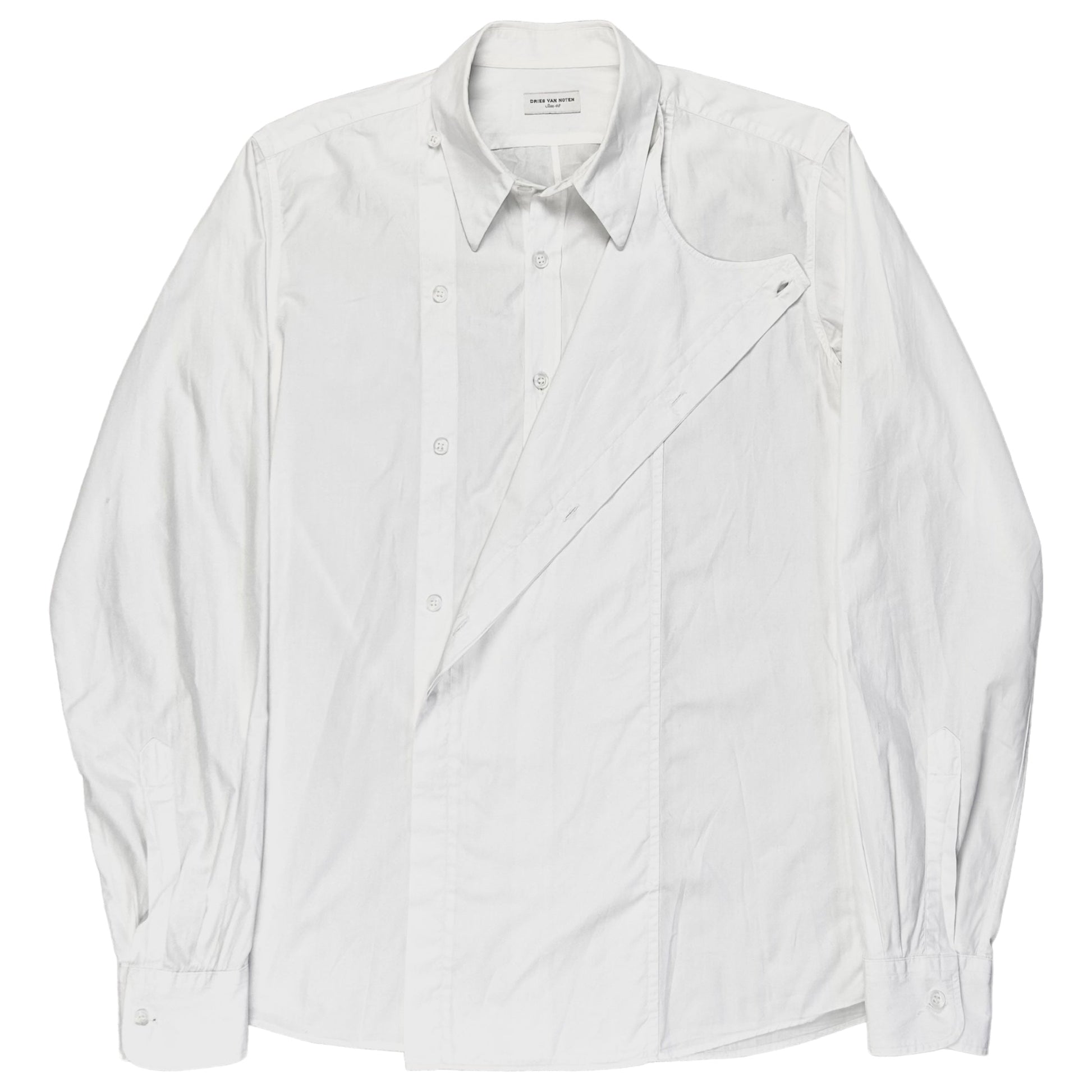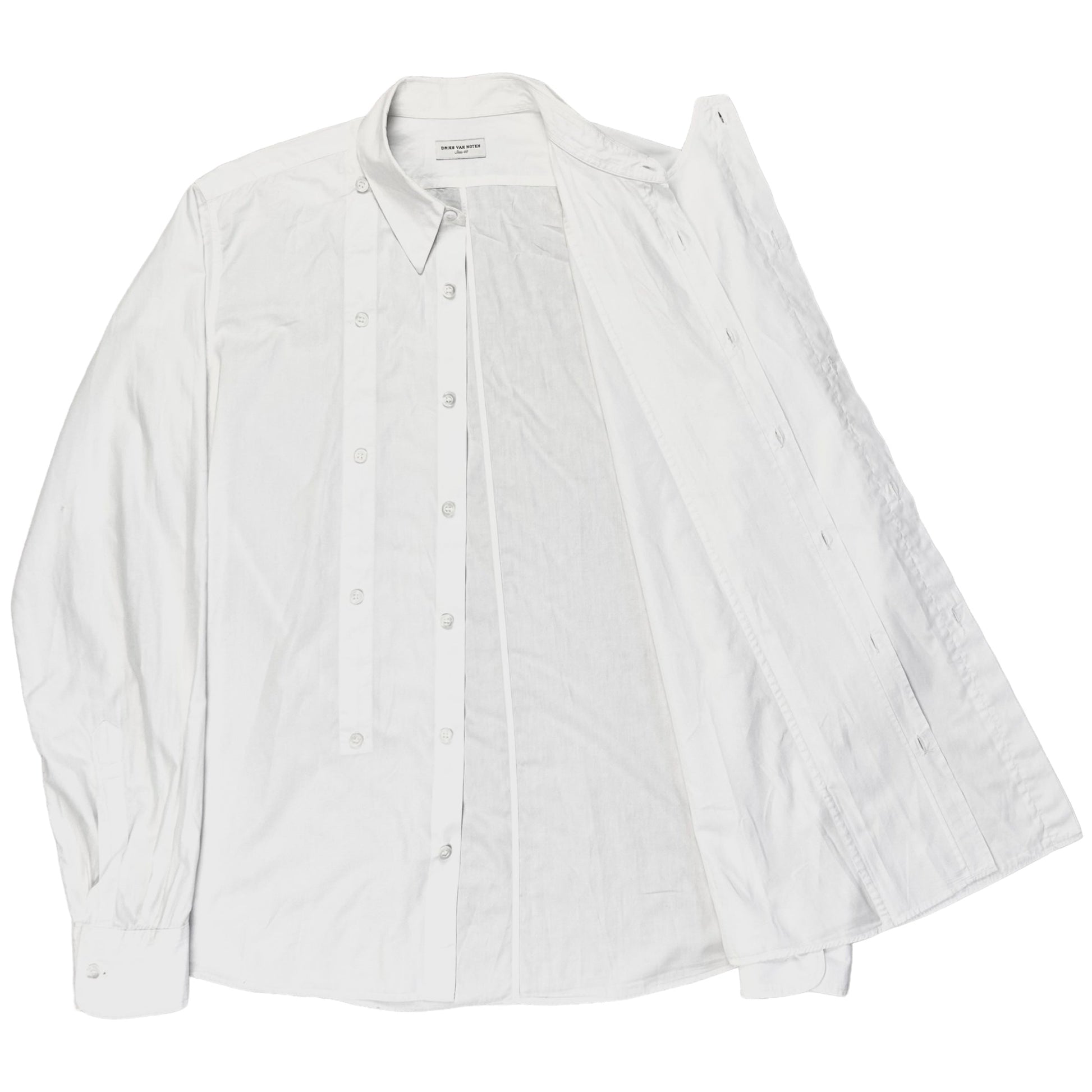 White button up shirt from Dries Van Noten. Extra layer panel at the center with button fastening allowing multiple versatile styling options. Made from a cotton poplin fabric. Slightly boxy cut.