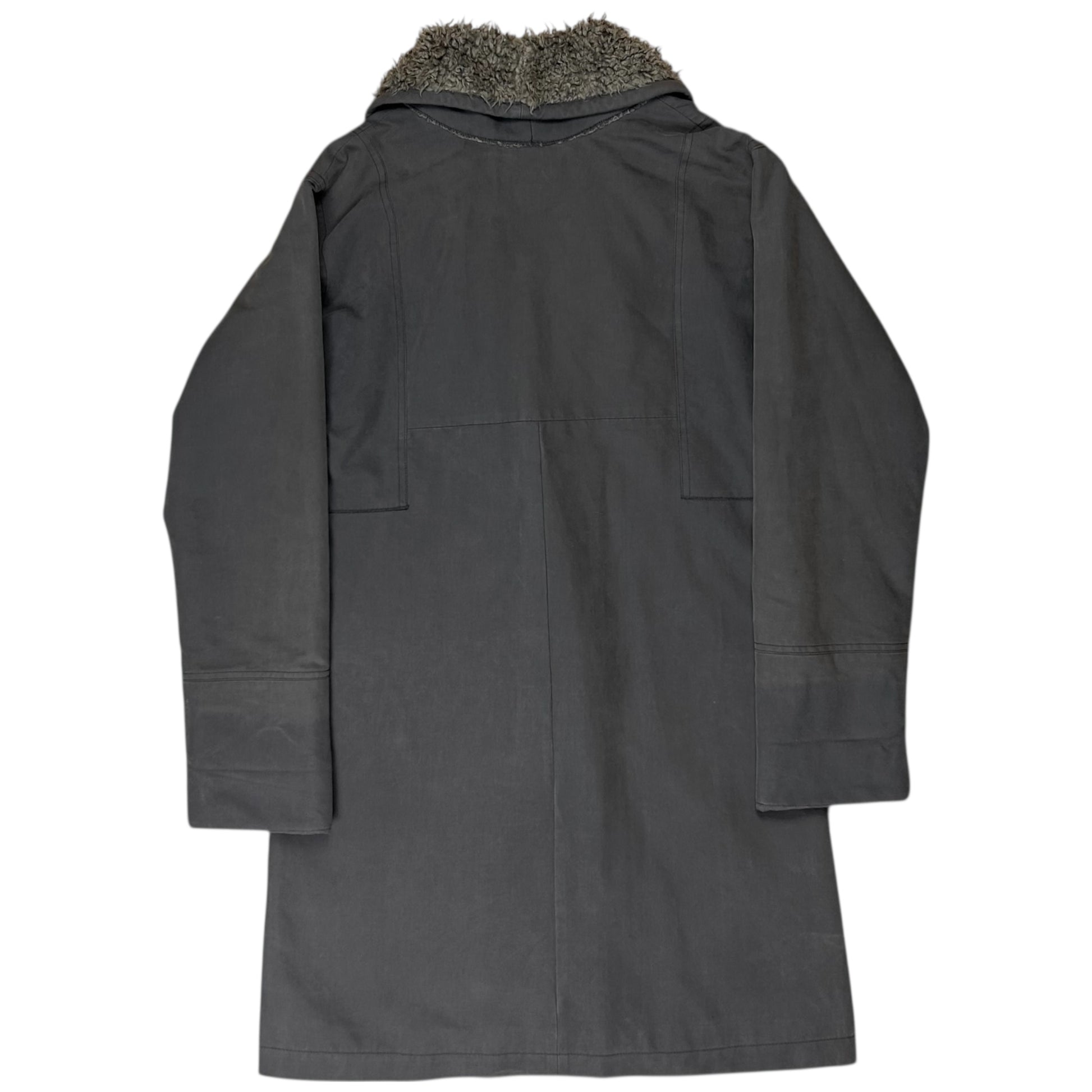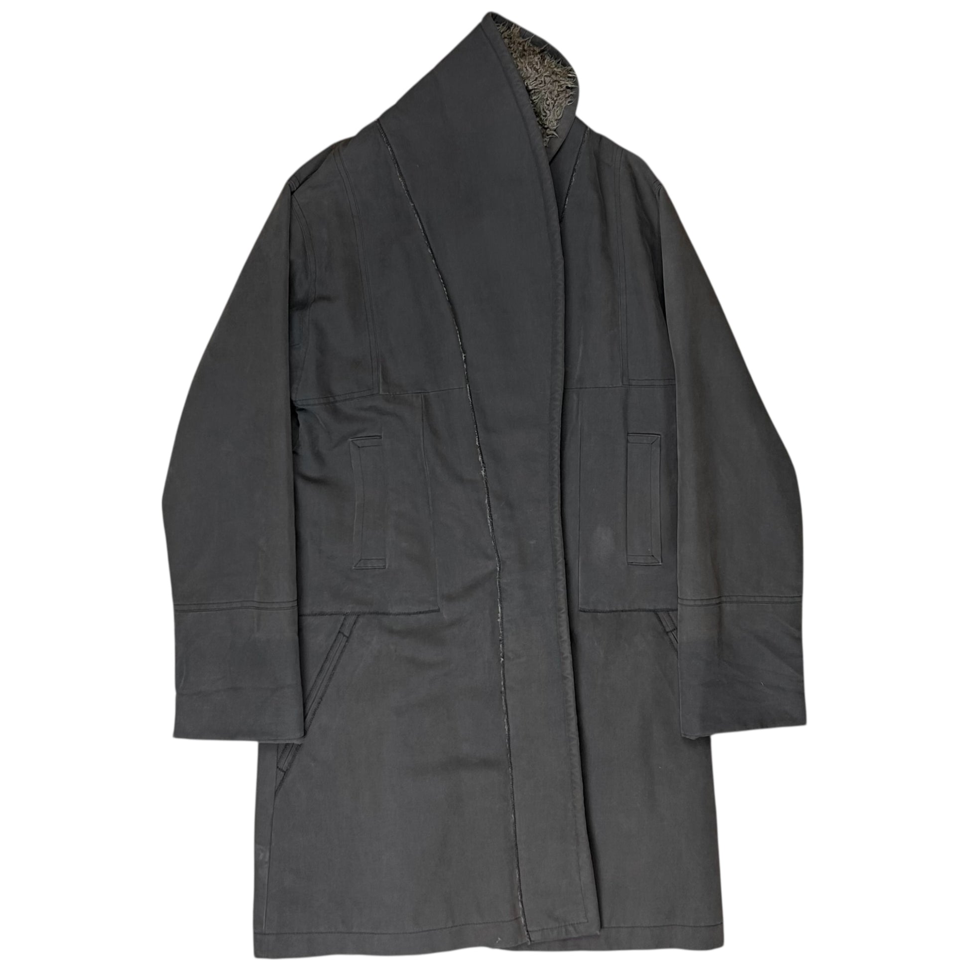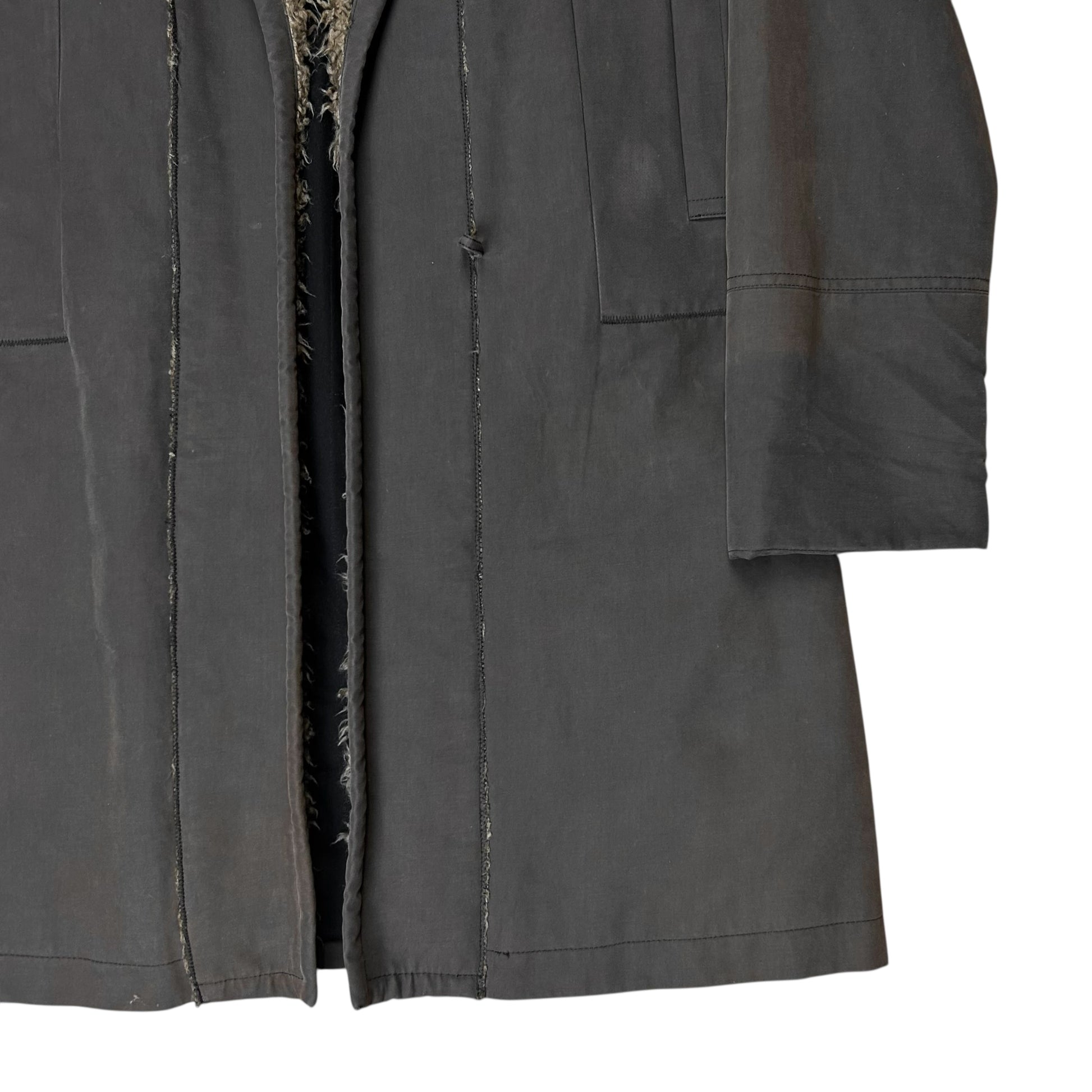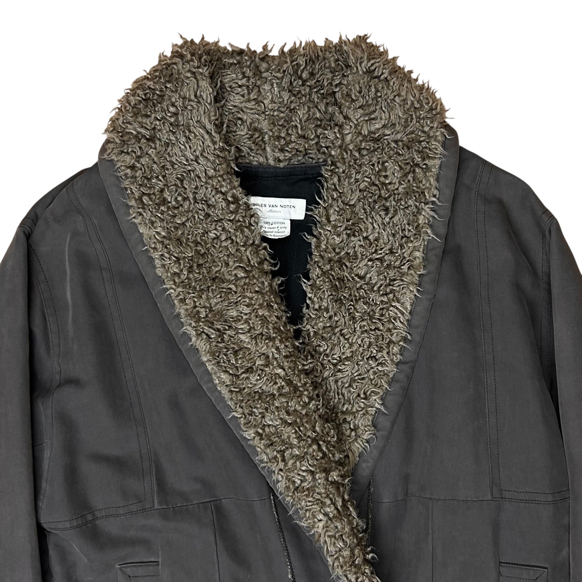 Mid length overcoat from the Dries Van Noten Fall Winter 2002 ready to wear collection. Shawl collar with light brown shearling going from neck to bottom. Interesting patchwork panelling with uniquely placed slid pockets. Single button closure at the center. Made from a thick brown cotton material. Relaxed cut.