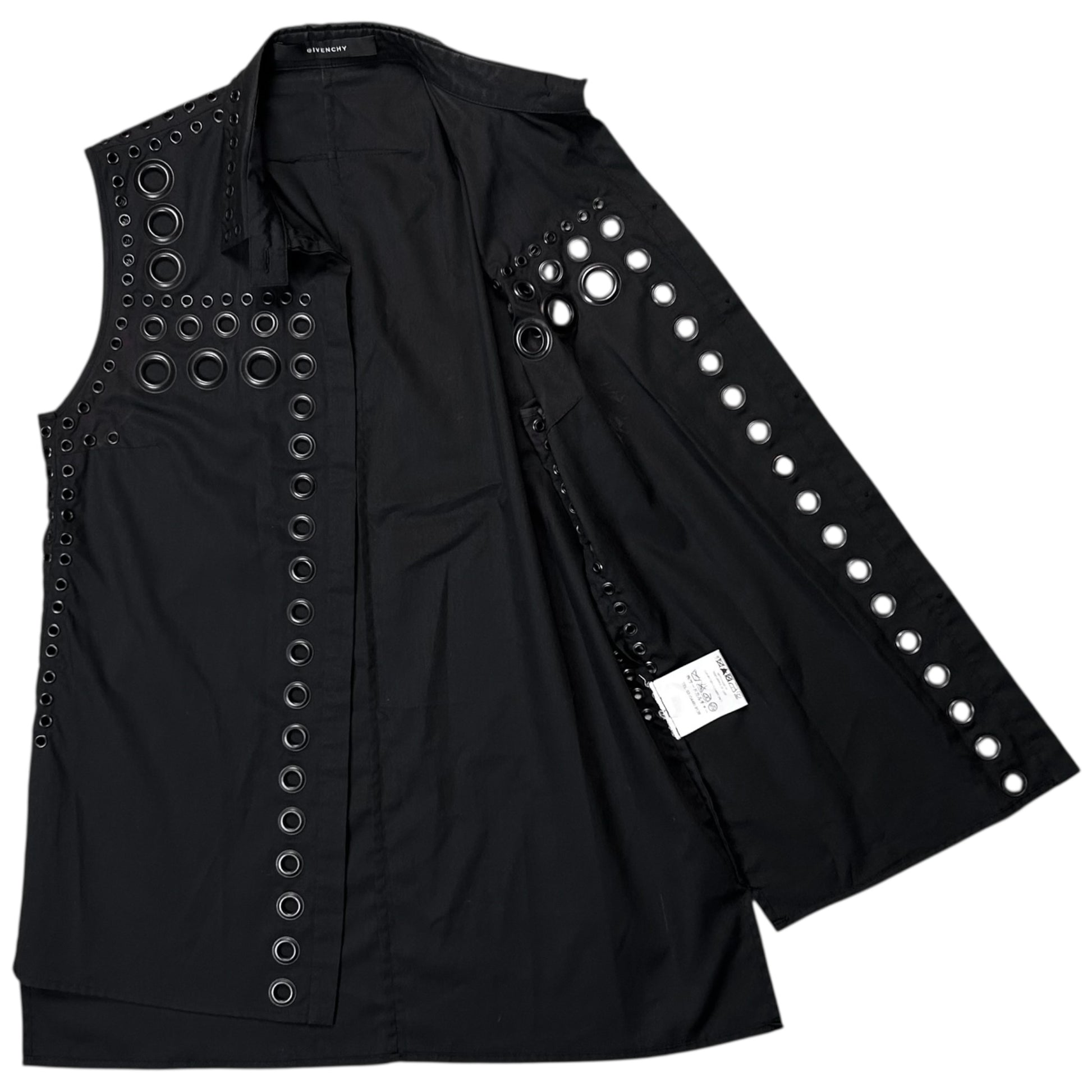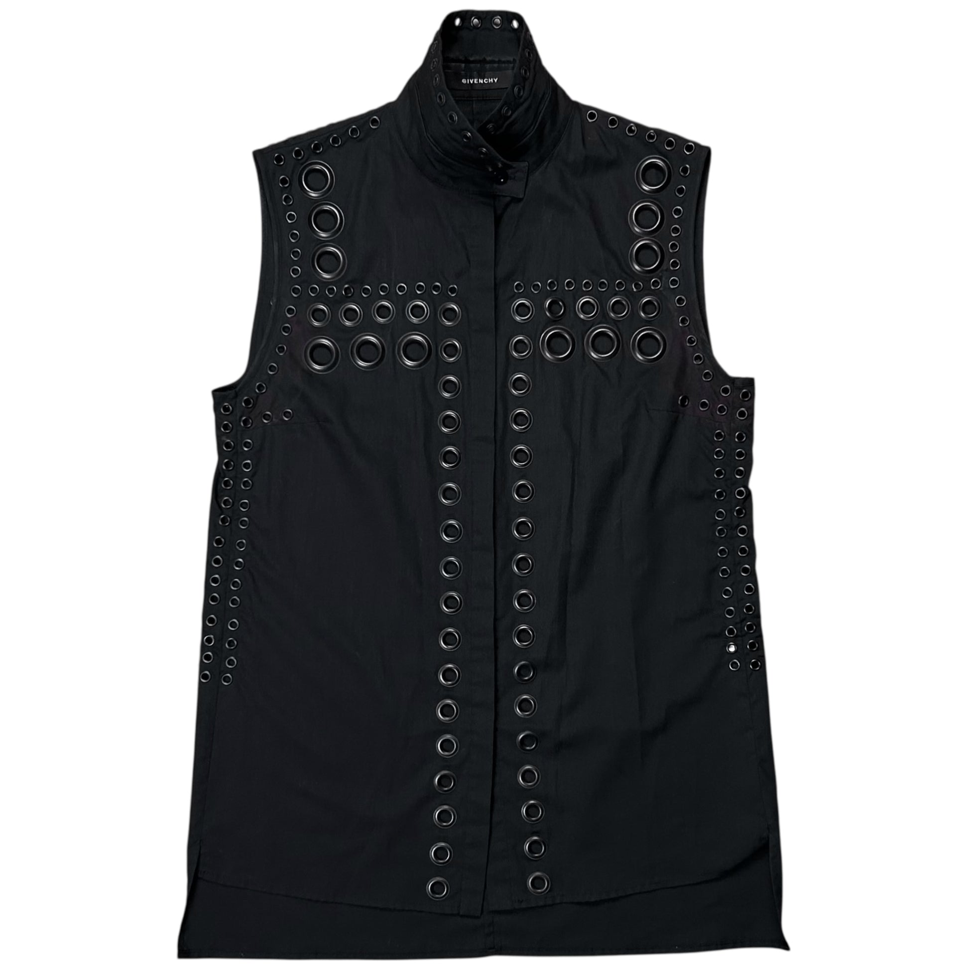 Gillet vest from the Givenchy Spring Summer 2011 collection which was designed by Ricardo Tisci. Giant tonal eyelets in multiple around the placket, the chest, shoulders and the neck. Classic shirt construction with a foldable collar and concealed button closure. Made from a black polyester and cotton blend. Relaxed cut.