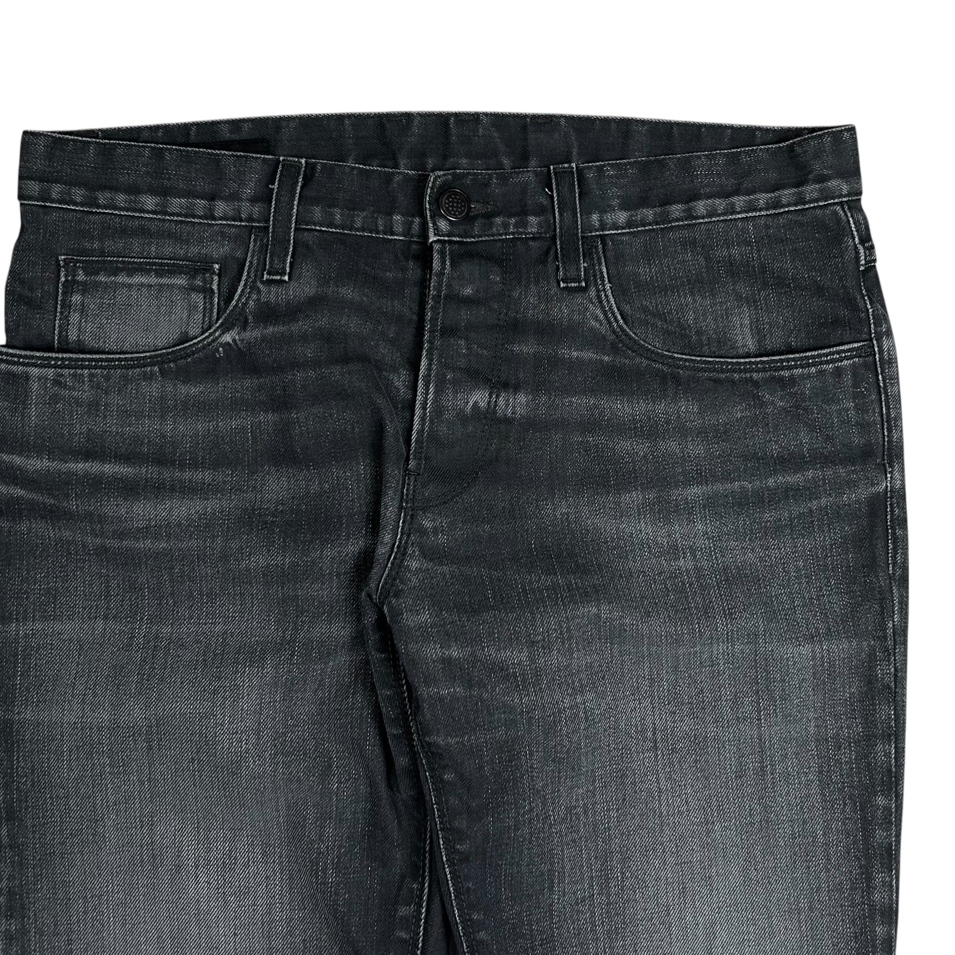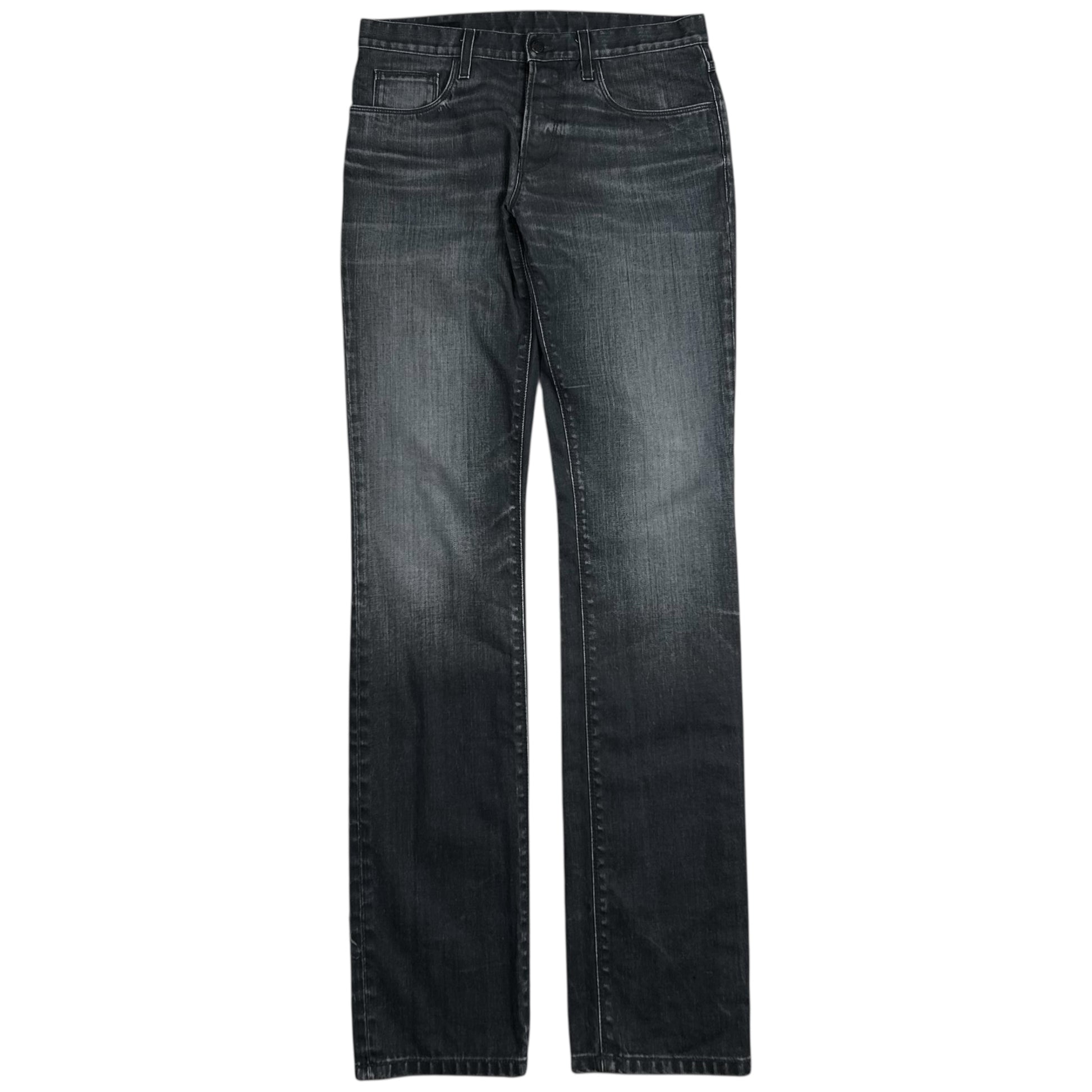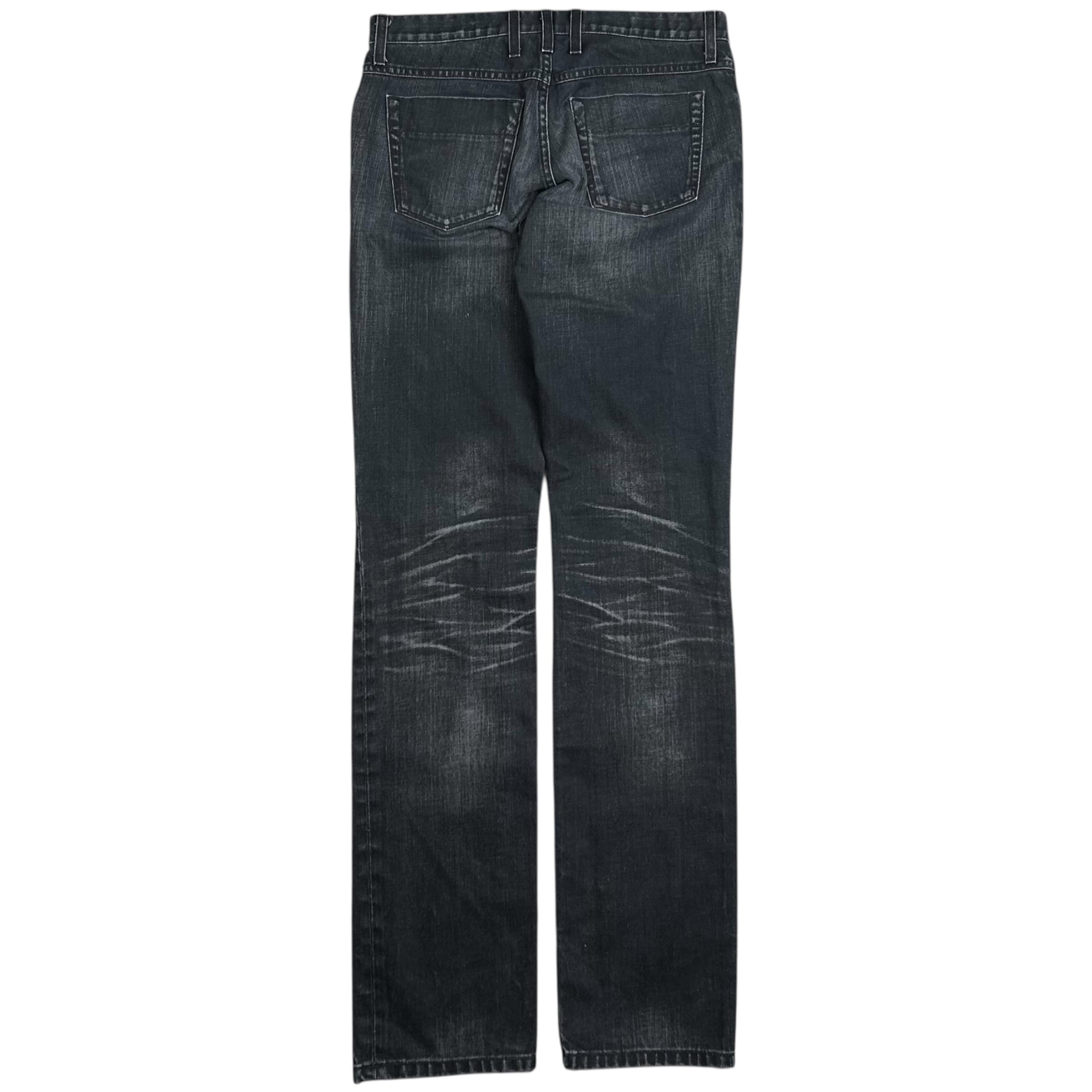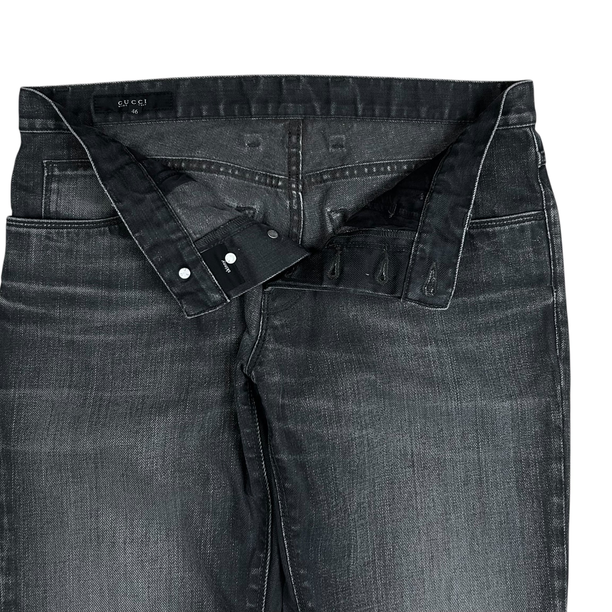 Denim pants from the early 2000s of Gucci back when Tom Ford was designing fot he brand. Heavy wash with some whisker detailing at the waist. Concealed silver burron fly. Made from a dark indigo that is almost dark grey cotton material. Skinny cut.