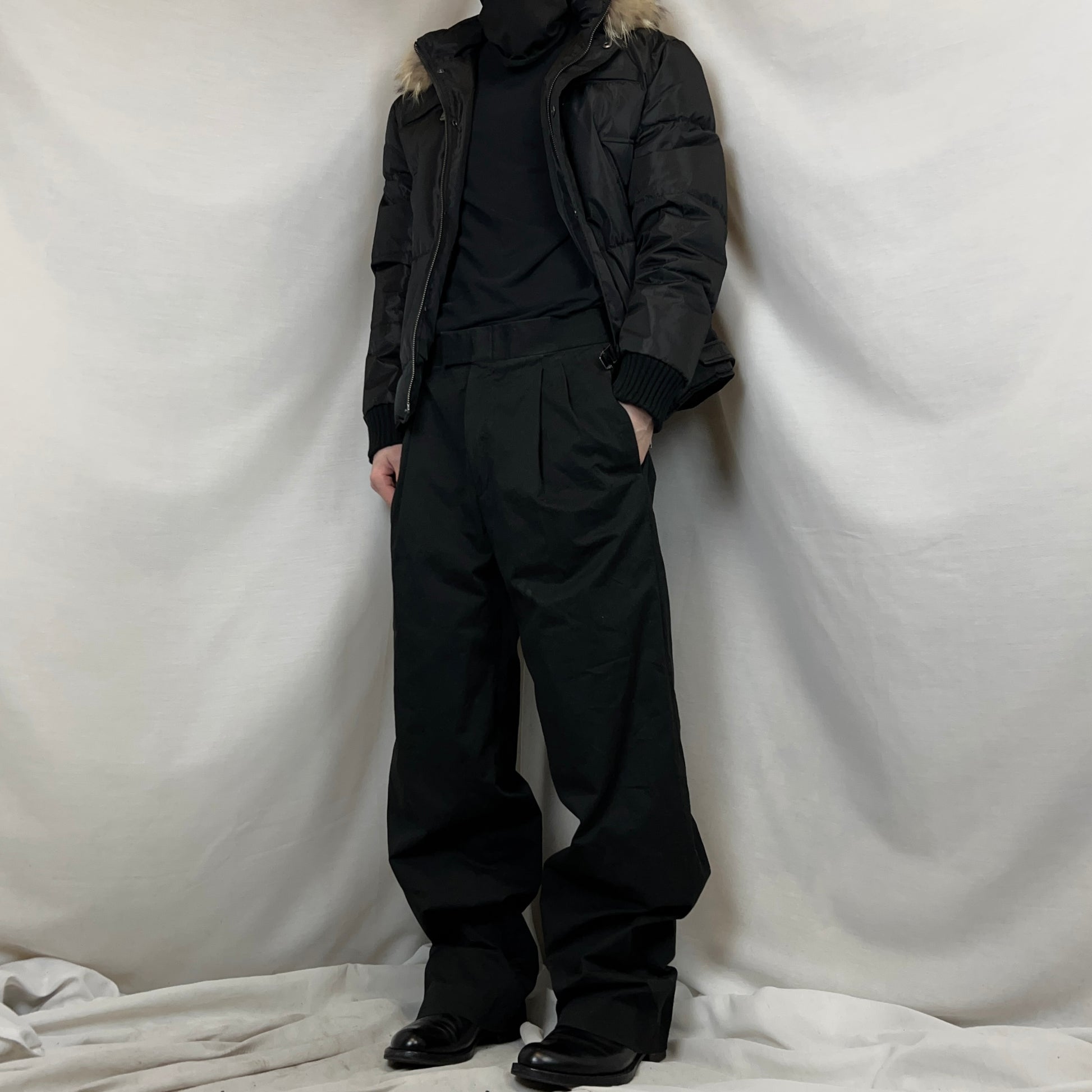 Work pants from the 90s of Gucci back when Tom Ford was creative director. Belt straps at both waist side with silver branded metal hardware allowing to slightly adjust the waist width. Double waist pleats with a tonal concealed zip fly with double hook closure. MAde from black cotton and elastane blend. Straight cut.