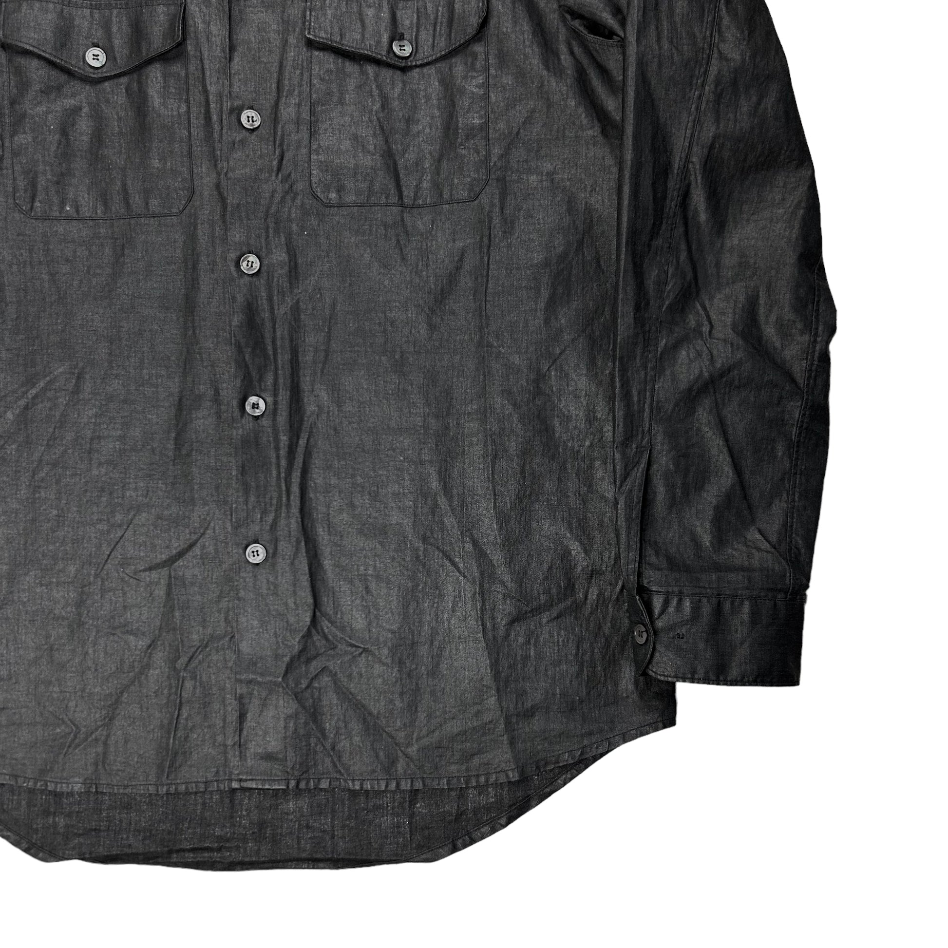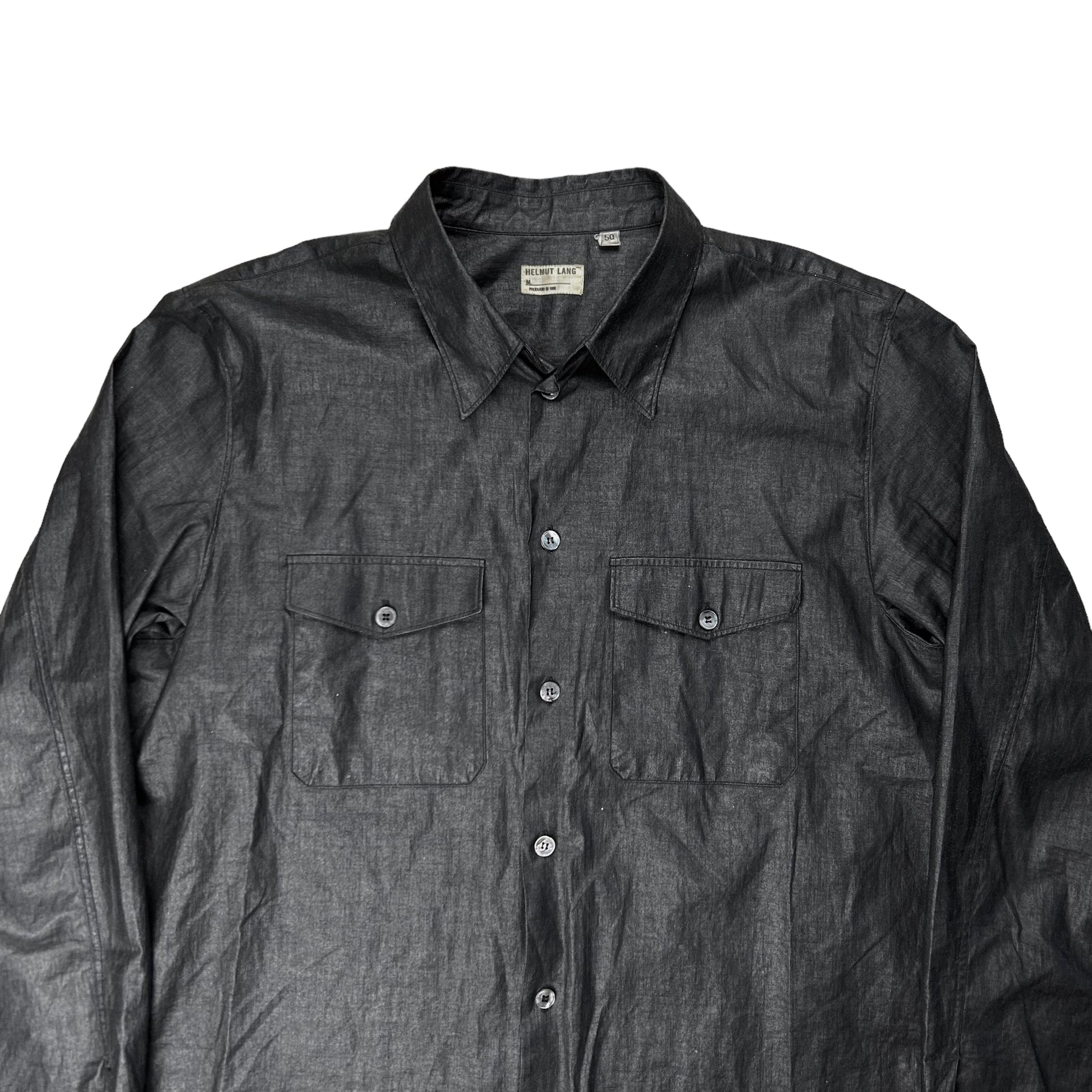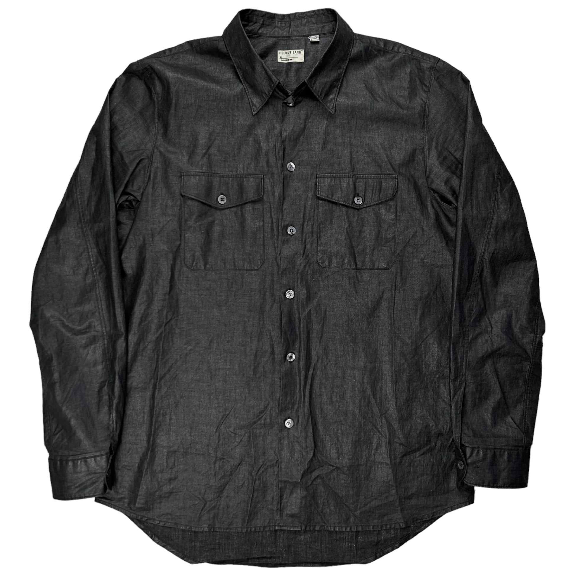 Over shirt from the Helmut Lang Spring Summer 1998 back when Helmut was still designing for the brand. Waxed texture which gives the black a lighter finishing. Distinctive work flap pockets at the chest with contrast button closure. Made from a cotton and polyurethane. Oversized cut.