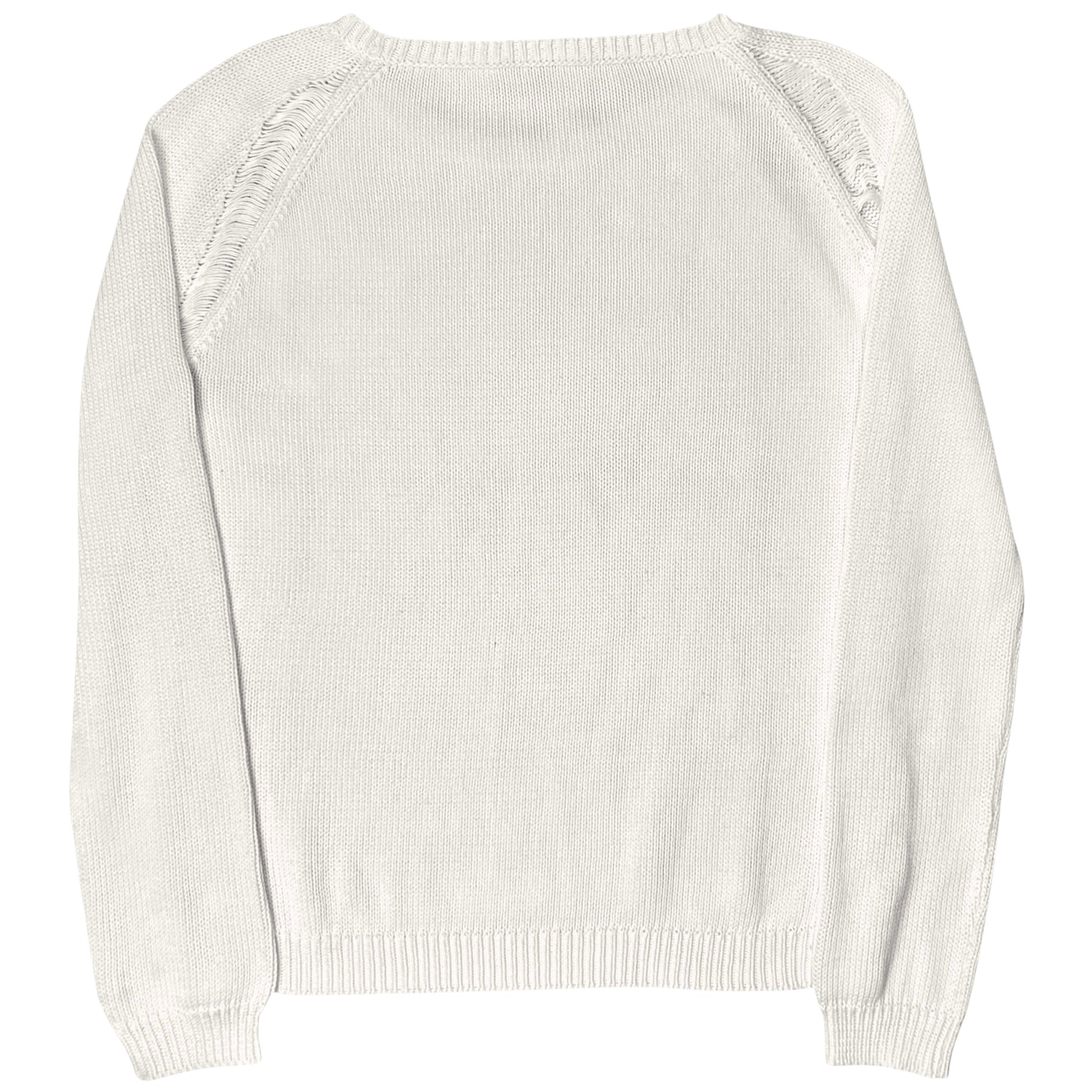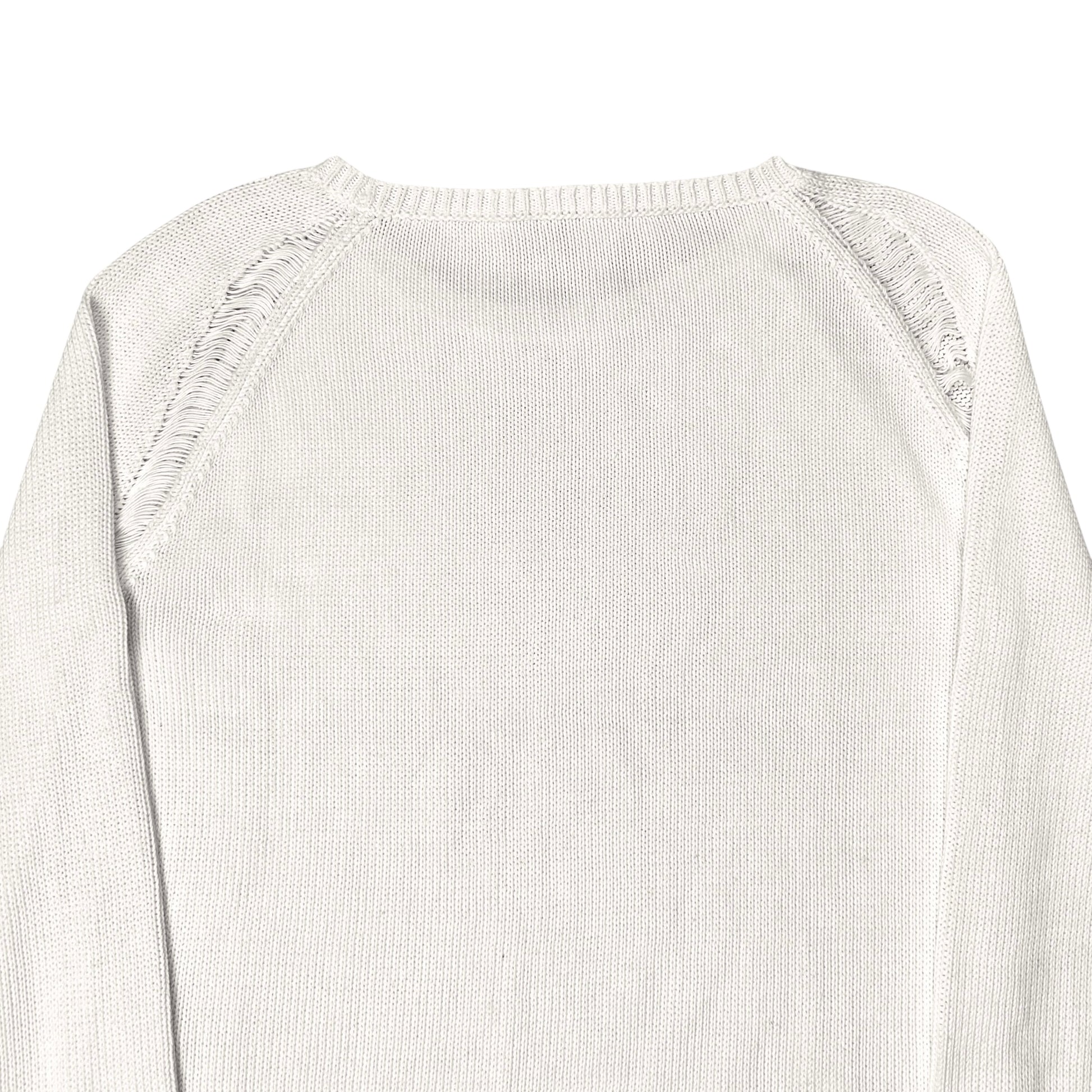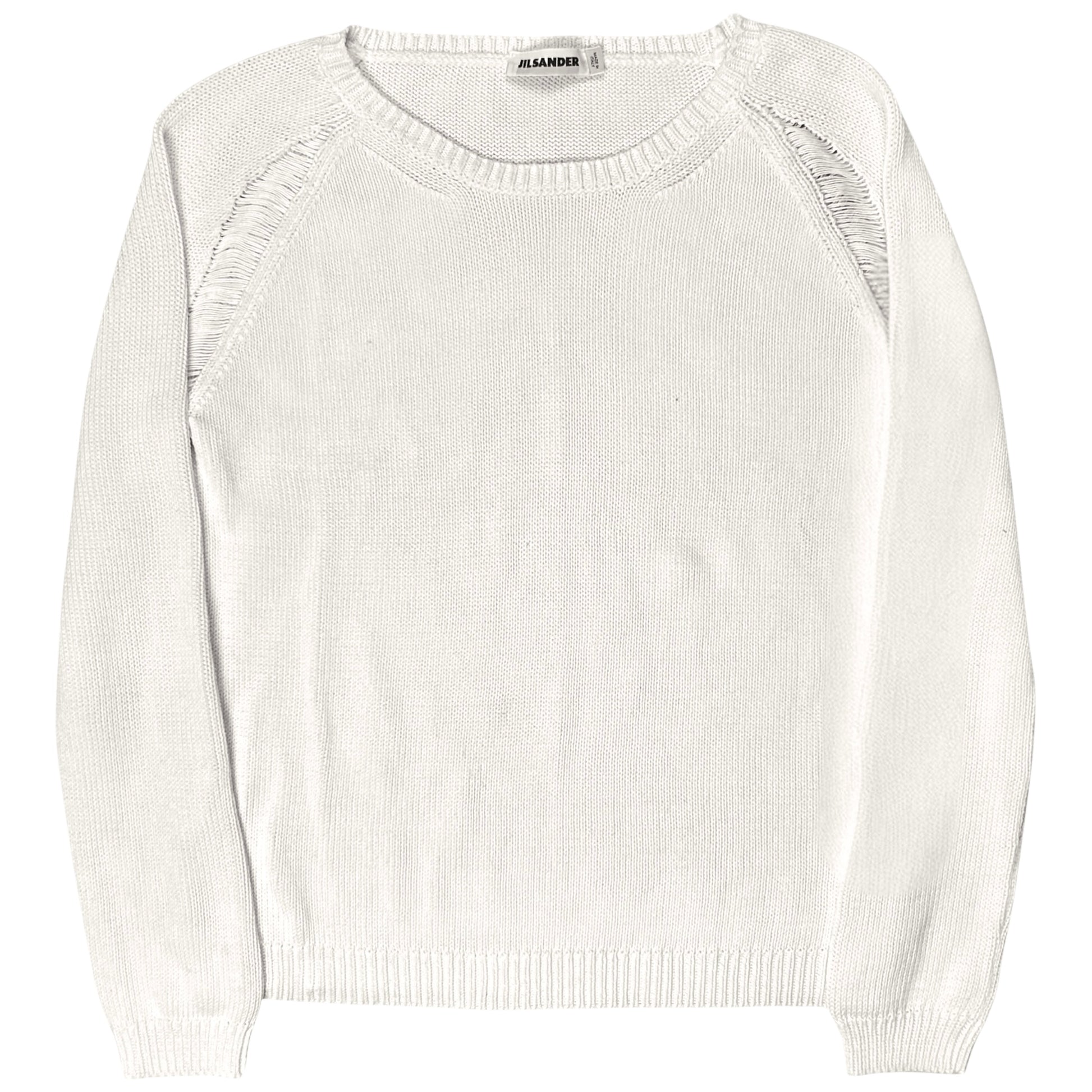 Jumper from the Jil Sander Fall Winter 2010 ready to wear collection which was designed by Raf Simons. Open shoulder seams at the front and back with a distressed design including visible threads showing the layer underneath. Made from a knitted cotton fabric in a light cream color. Boxy cut.