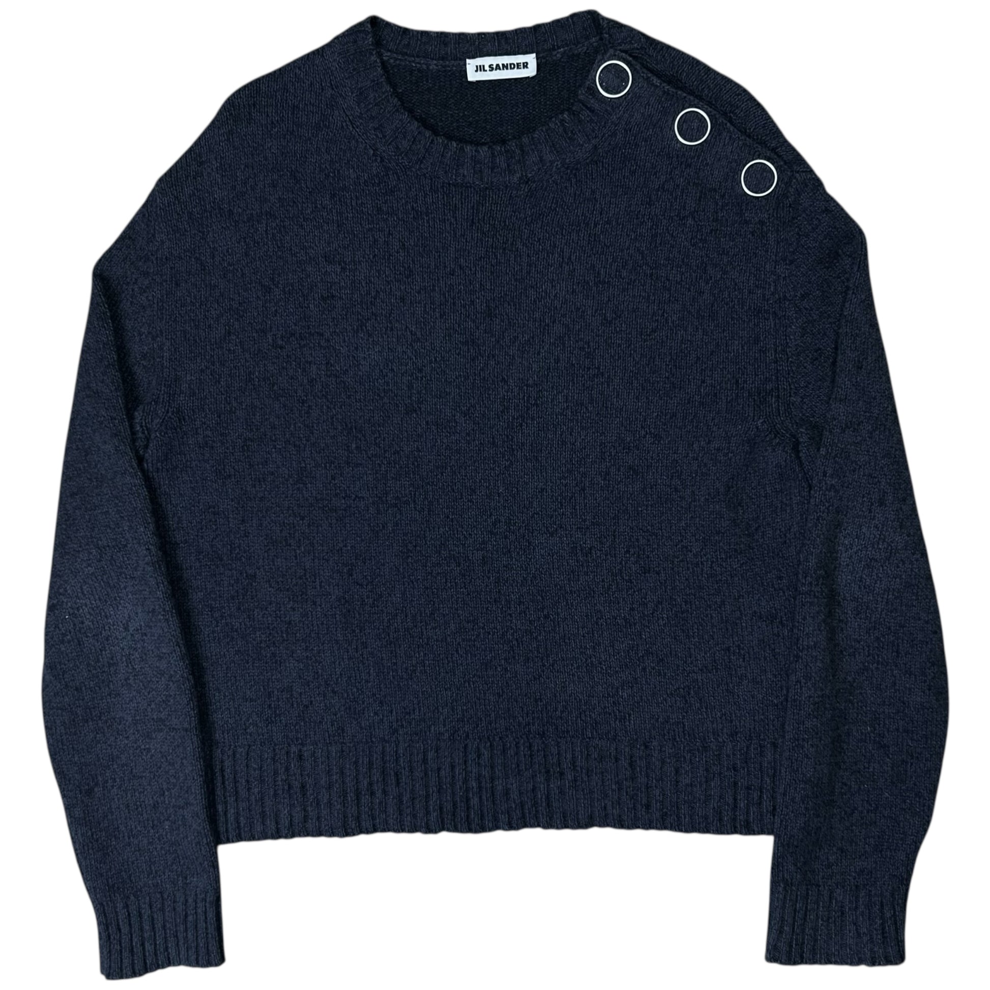 Heavy jumper from the Jil Sander Spring Summer 2021 ready to wear collection which was designed by Luke and Lucie Meier. Exaggersated silver ring press stud buttons at the neck which can be opened to modify the collar. Made from a heavyweight wool, cotton and polyamide blend in a dark blue. Cropped and boxy cut. Retailed for around 800€.