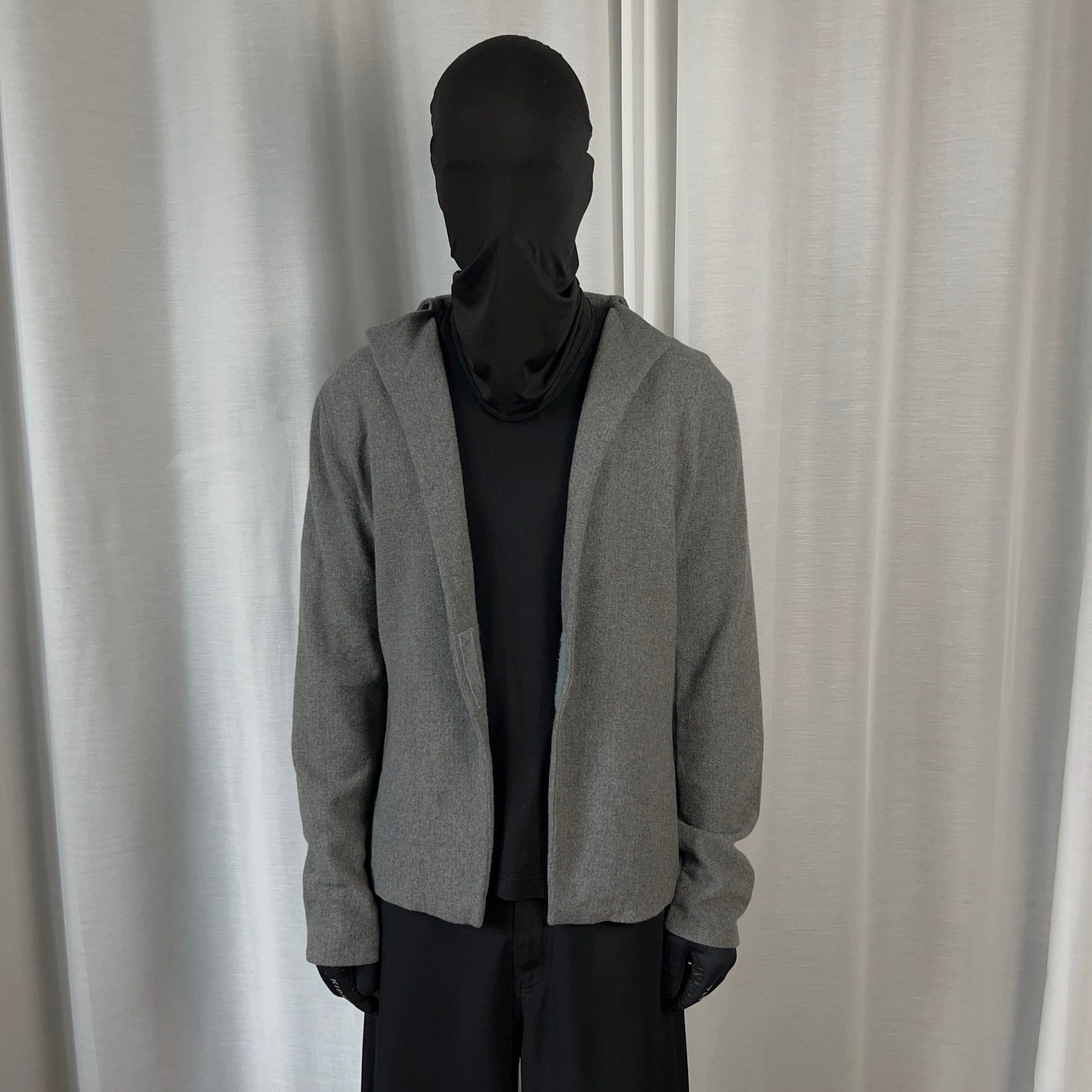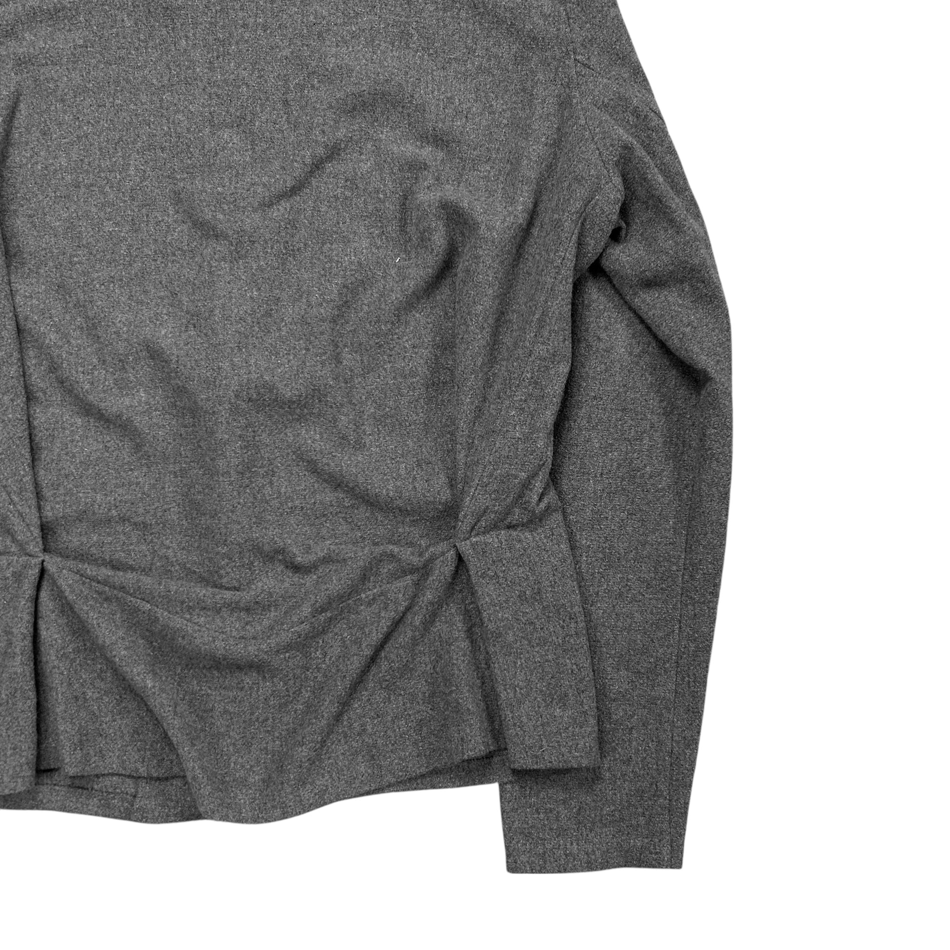 Cardigan type blazer jacket from Jil Sander from the early 2000s back when Jil Sander was creative director. Unique tonal velcro closure at there front with a foldable lapel collar. Interesting darting at the back creating symmetric pleats. Made from a medium grey cashmere blend. Regular cut.