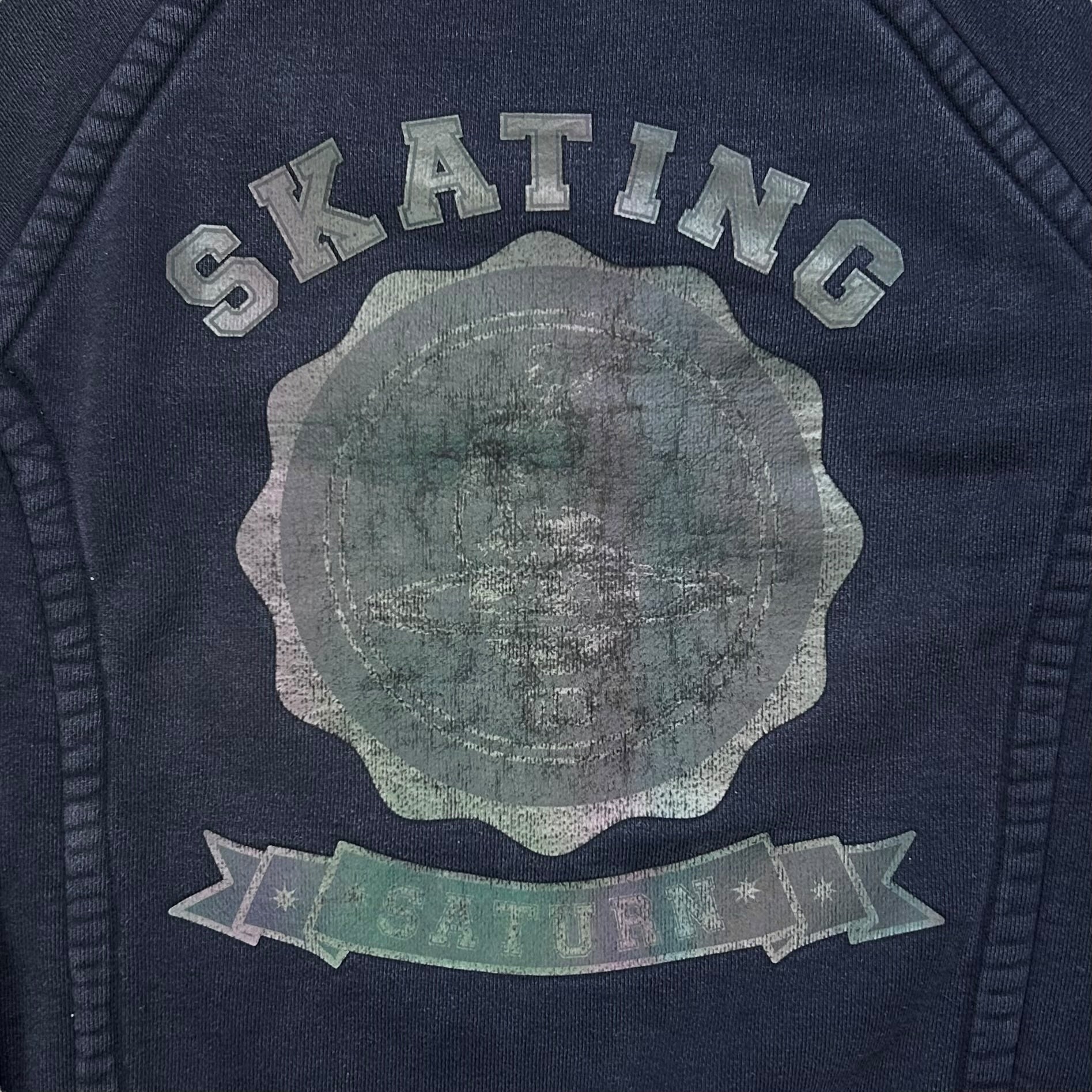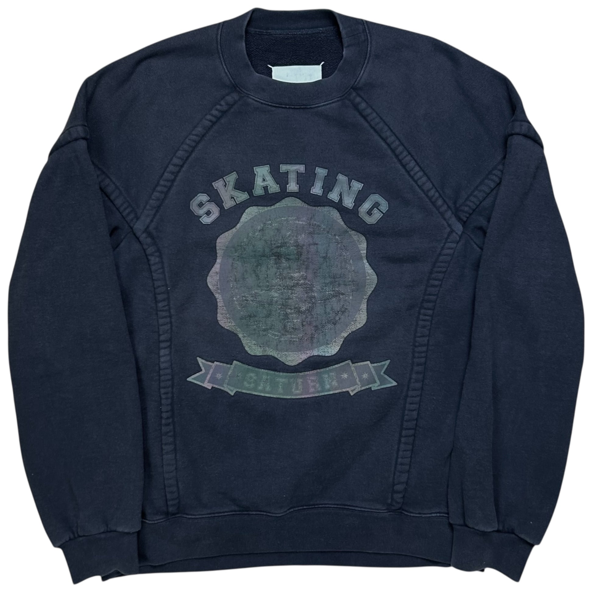Crewneck jumper from the Maison Margiela Fall Winter 2018 mainline which was designed by John Galliano. Vintage Inspired Skating Saturn print at thje front with a reflective glossy finish. Raglan construction with thick reinforced seams with a distorted allignment. Made from a heavyweight cotton in a faded muted dark blue. Oversized and boxy cut. Retailed for around 700€.