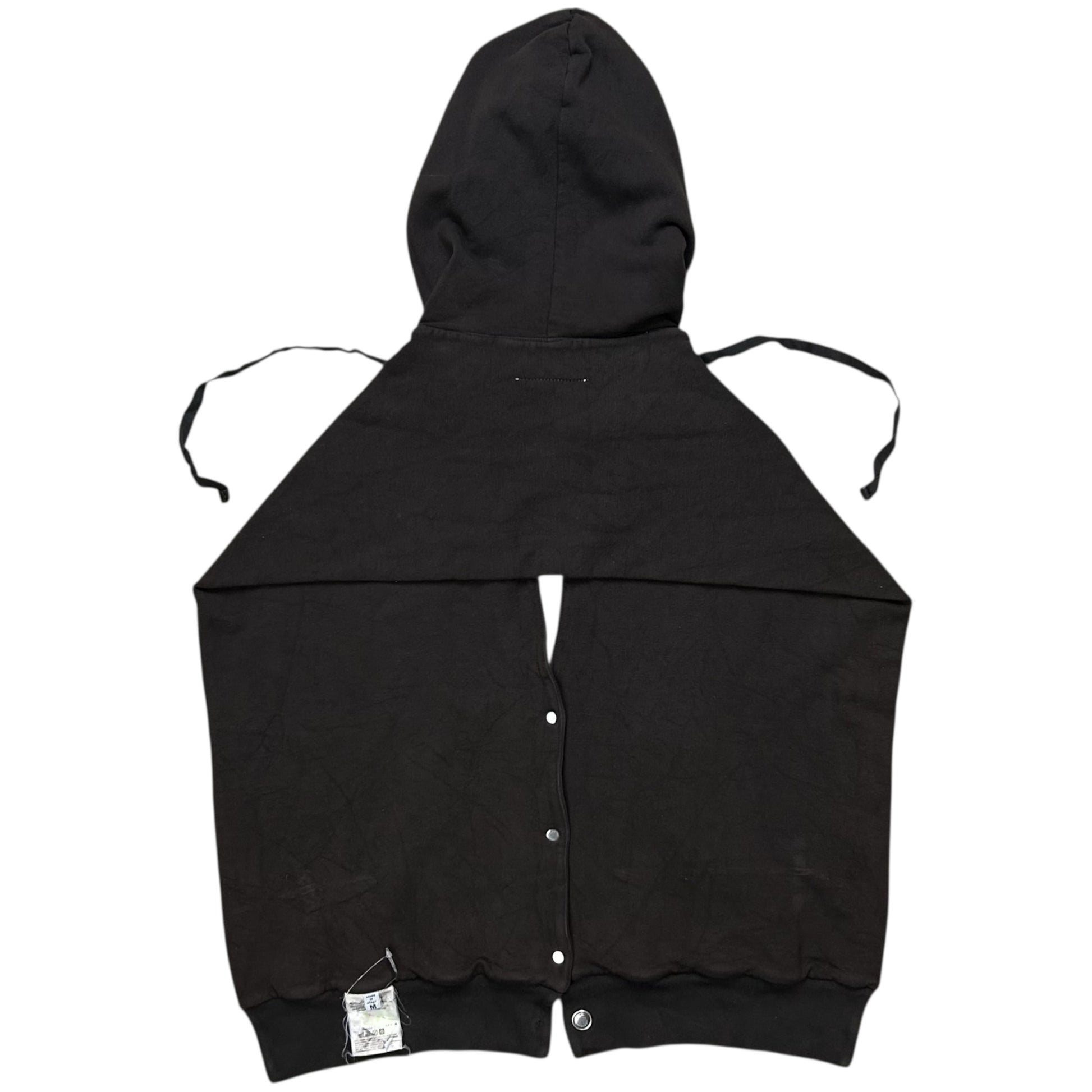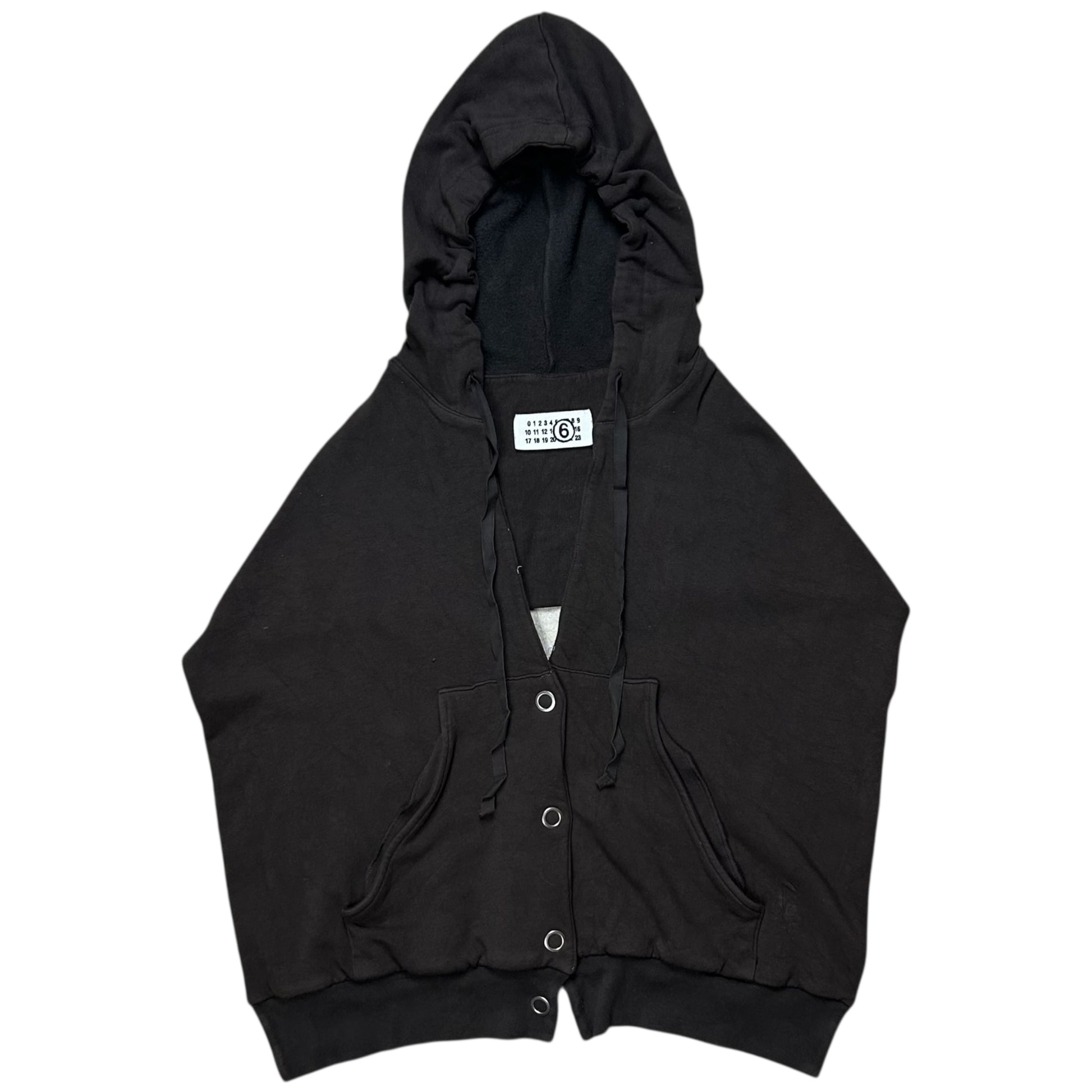 Gillet vest from the Maison Martin Margiela Fall Winter 2006 collection of the line 6 back when Martin was still designing. Silver ring snap button closure. V-neck collar with an open back which gives the top scarf like characteristics. Made from a dark khaki brown viscose, cotton and elastane blend. Cropped and boxy cut.