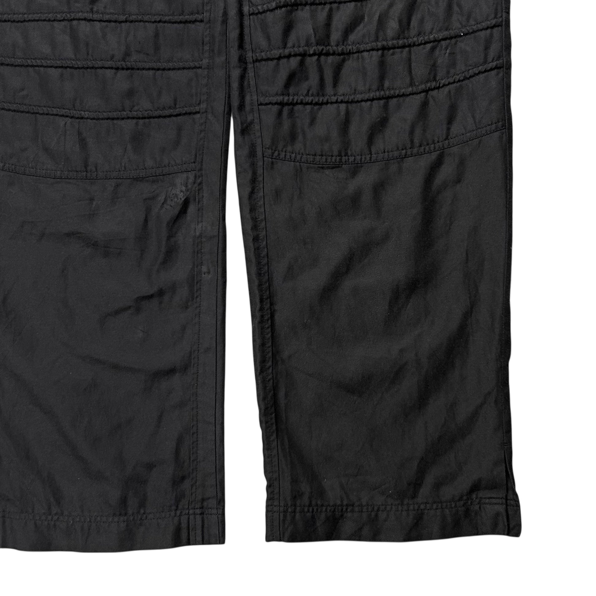 Biker trousers from the Maison Margiela Fall Winter 2019 collection of the Maison Margiela diffusion line MM6. Interesting paneling with in an asymmetric patchwork manner with tonal reinforced seams. Concealed zip fly with tonal studs at the waist. Made from a black nylon with polyester padding. Slim cut.