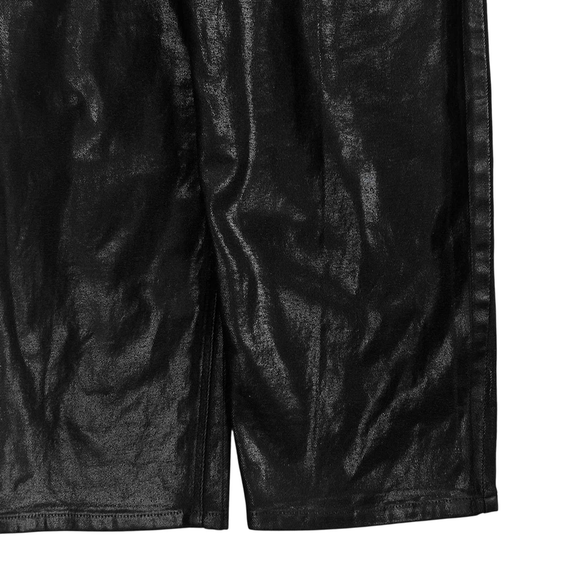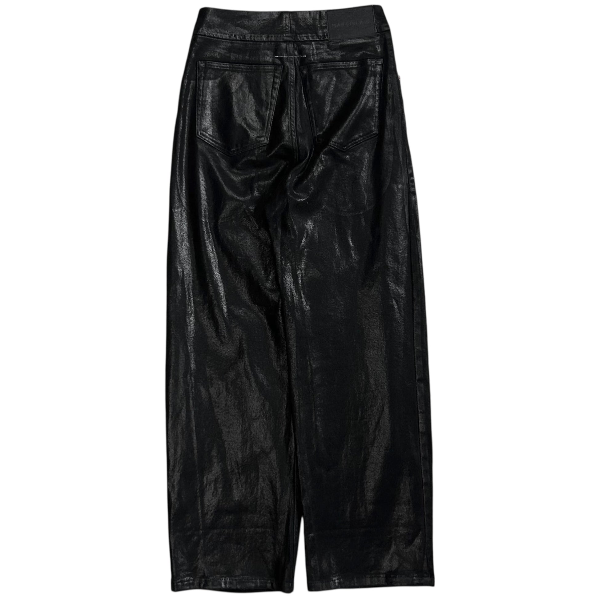 Denim pants from the Spring Summer 2022 collection of the Maison Margiela diffusion line MM6. Exposed silver button hardware at the fly with further bronze rivets. Tonal Margiela 6 embossed canvas patch at the back. Made from a heavy waxed glossy cotton elastane blend fabric. Wide and slightly short cut with a tailored leg.