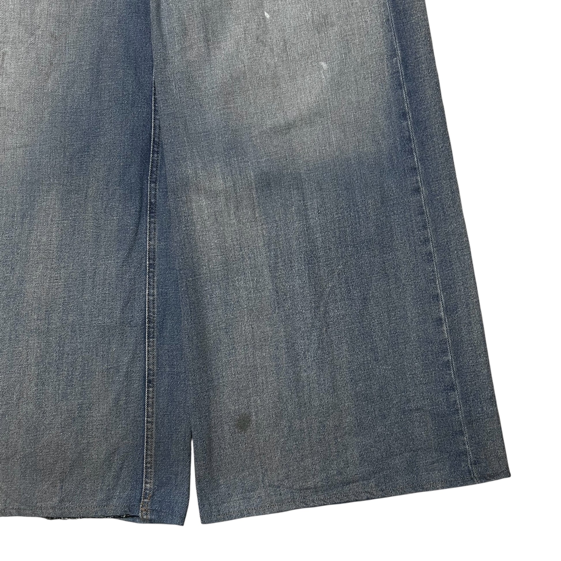 Light blue denim pants from the Resort 2022 collection of the Maison Margiela diffusion line MM6. Distressed and worn design elements including paint splatters and oil stains. Heavy wash creating a faded and light blue color. Made from thick and flowy cotton fabric. Wide and long cut which let the trousers stack beautifully. Retailed for around 550€.